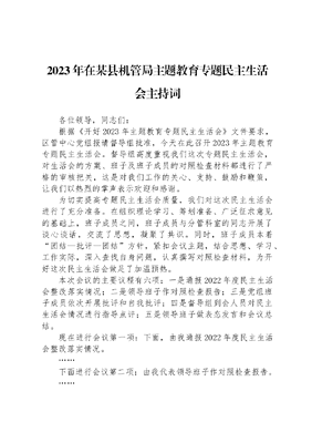 2023年在某县机管局主题教育专题民主生活会主持词各位领导,同志们:根据《开好2023年主题教育专题民主生活会》文件要求,区管中心党组报请督导组批准,今天在此召开2023年主题教育专题民主生活会。督导组高度重视我们这次专题民主生活会,对生活会的方案、班子及班子成员的对照检查材料都进行了严格的审核把关,这是对我们工作的关心、支持、鼓励和鞭策,让我们以热烈的掌声表示欢迎和感谢。为切实提高专题民主生活会质量,我们对这次民主生活会进行了充分准备。在组织理论学习、筹划准备、广泛征求意见的基础上,班子成员之间,班子成员与分管科室的同志开展了谈心谈话,交流了思想,凝聚了共识。同时,班子成员本着团结—批评—团结方针,紧扣会议主题,结合思想、学习、工作实际,深入查找自身问题,认真撰写对照检查材料,为开好这次民主生活会做足了加温预热。本次会议的主要议程有六项:一是通报2022年度民主生活会整改落实情况;二是领导班子作对照检查报告;三是党组班子成员依次开展批评和自我批评;四是督导组到会人员对民主生活会情况进行指导点评;五是领导班子做表态发言和会议总结。现在进行会议第一项:下面,由我通报2022年度民主生活会整改落实情况。……下面进行会议第二项:由我代表领导班子作对照检查报告。……现在进行第三项:请班子成员依次作对照检查,每人发言结束后,其他同志依次开展批评。首先,由我作个人对照检查。……………………请各位同志对我提出批评意见。……………………下面,请xx同志作对照检查;……………………请各位同志对xx同志提出批评意见。……………………下面,请xx同志作对照检查;……………………请各位同志对xx同志提出批评意见。……………………现在进行第四项议程:请应邀出席会议的X同志作点评指导,大家欢迎。……(发言完毕)下面,进行第五项议程,由我做总结发言同志们,经过认真准备,今天我们召开了此次民主生活会整个过程中,大家开门见山、敞开心扉、揭短亮丑、直挖根源。从大家的发言可以看出大家对今天的会议高度重视,会前准备都非常认真,会议开得比较成功,做到了见人见事见思想。刚才,督导组组长对我们的会议给予了充分肯定和精准客观的评价,既肯定了我们的成绩,又指出了我们存在的问题,既为我们提出了整改要求,又为我们指明了努力方向,我们要认真学习领会,切实抓好贯彻落实。下面,我再强调三点意见:一是坚持强化理论武装。要始终把政治建设摆在首位,坚持不懈用XXX新时代中国特色社会主义思想凝心铸魂,深刻领悟两个确立的决定性意义,增强四个意识、坚定四个自信、做到两个维护,确保各项决策部署不折不扣落地见效。二要突出问题导向。整改落实是召开民主生活会的出发点和落脚点,要严格对照查摆的问题进行再梳理再完善,逐条逐项明确措施,真正把整改工作抓细抓实抓到位。三、发挥头雁效应。要以身作则、以上率下,压紧压实全面从严治党主体责任和一岗双责,牢固树立全面从严治党永远在路上的理念,层层传导压力,逐级压实责任,做到真管真严、敢管敢严、常管长严。最后,再次感谢督导组对本次会议的指导!会议到此结束,散会!