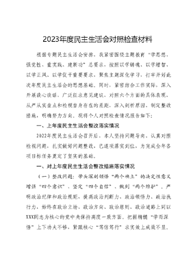 2023年度民主生活会对照检查材料根据专题民主生活会安排,我紧密围绕主题教育学思想、强党性、重实践、建新功总要求,按照以学铸魂、以学增智、以学正风、以学促干重要要求,聚焦主题深化学习,打牢开好此次年度民主生活会的思想基础。同时,紧密结合工作实际,深入开展谈心谈话,广泛征求意见建议,对照六个方面的具体表现,从严从实盘点和检视自身存在的差距,深入剖析原因,制定整改措施,明确努力方向。现将个人对照检查情况报告如下:一、上年度民主生活会整改落实情况2022年度民主生活会召开后,本人坚持问题导向,认真对照检视问题,扎实做好问题整改,已逐项落实到位,为完成全年各项目标任务奠定了坚实的基础。一、对上年度民主生活会整改措施落实情况(一)整改问题:带头深刻领悟两个确立的决定性意义增强四个意识、坚定四个自信、做到两个维护。严明政治纪律和政治规矩,提高政治判断力、政治领悟力、政治执行力,始终在政治立场、政治方向、政治原则、政治道路上同以XXX同志为核心的党中央保持高度一致方面。把握精髓学而深悟上下功夫不够,紧跟核心笃信笃行求实效上成效不显。整改落实情况:坚持把学习贯彻XXX新时代中国特色社会主义思想和党的XX大精神作为当前和今后一个时期的首要政治任务来抓,履行好党建第一责任人职责,带领党委班子和全体干部职工始终在政治立场、政治方向、政治原则上同以XXX同志为核心的党中央保持高度一致,牢固树立政治意识、大局意识、核心意识、看齐意识,坚定四个自信,持续对标对表找差距,不断校正自己的思想和行为,自觉从党的百年奋斗历史经验中汲取前行营养和动力,持续增强争当两个确立忠诚拥护者、两个维护示范引领者的思想自觉和行动自觉,用新思想新战略武装头脑、指导实践、推动工作。(二)整改问题:带头用XXX新时代中国特色社会主义思想凝心铸魂。坚持用XXX新时代中国特色社会主义思想统一思想、统一意志、统一行动,做到学思用贯通、知信行统一,坚持好、运用好贯穿其中的立场观点方法,自觉把XXX新时代中国特色社会主义思想转化为坚定理想、锤炼党性和指导实践、推动工作的强大力量方面。学习能力上的头雁效应亟待提升,以点带面上的辐射效应亟待凸显。整改落实情况:带头落实好三会一课、民主生活会、领导干部双重组织生活、民主评议党员、谈心谈话等制度,完善学习成果交流展示机制,在每月的主题党日活动中增加固定动作,将党员领导干部与普通党员的学习笔记互查互学,既发挥好头雁的示范作用,又发挥好普通党员的监督作用,切实深刻领会党的创新理论最新成果,在常学常新中强化政治引领;注重碎片化学习,结合公路工作外业性质,实行小组学在线学路上学,有效提高学习教育的深度、广度和频次,扎实推进党支部五星联创工程,推动党支部全面过硬、党员全面争先深入挖掘、精心提炼身边榜样人物、感人事迹,引导广大干部职工对标先进、见贤思齐,构建串点成线、连线成面的职工教育红色矩阵。(三)整改问题:带头坚持和加强党的全面领导。认真贯彻民主集中制,创新和改进领导方式,增强党组织政治功能和组织功能,不折不扣把党中央决策部署和XXXXXX关于本地区本部门本单位的重要指示批示精神贯彻落实好,把各领域广大群众组织凝聚好,夯实党执政的根基方面。系统思维提升管理效能不突出,职代会民主管理氛围不浓厚。整改落实情况:坚持民主集中制,严格落实三重一大事项集体决策制度,强化党内监督,深入贯彻落实新时代党的建设总要求,以党的XX大精神为引领,以能力作风建设年为基调以大培训、大练兵、大比武、大竞赛活动为载体,加强规划布局、资源保障和力量配备,制定《党建活动计划表》,突出活动的主题性和系统性,将党建品牌力量深入人心,更好的发挥党组织战斗堡垒作用和党员先锋模范作用;加强和完善职工代表大会制度,不断充实和改进职代会,提高职代会的质量,着力提高职工代表的参与能力、分析能力、调研能力、表达能力,高质量地行使民主权利,进一步增强职工民主参与意识,营造人人关心单位发展,参与单位管理的良好局面。(四)整改问题:带头坚持以人民为中心的发展思想,推动改革发展稳定。完整准确全面贯彻新发展理念,统筹推进五位一体总体布局、协调推进四个全面战略布局,紧紧抓住解决不平衡不充分的发展问题,补短板、强弱项、固底板、扬优势推动经济社会持续健康发展。在发展中保障和改善民生,聚焦解决人民群众急难愁盼问题,让人民群众看到学习贯彻党的XX大精神的实际成效方面。公仆意识践行不足,群众情感共鸣不足整改落实情况:牢树以人民为中心的发展思想,始终保持与人民群众的血肉联系,落实直接联系群众制度,以人民群众的急难愁盼为切入点,结合全区八个开新局战略部署,梳理完善《民生清单》,践行修好路、养好路、服好务的公路使命;牢固