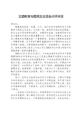 主题教育专题民主生活会点评讲话同志们:根据局党组统一安排,今天,我们参加市局领导班子主题教育专题民主生活会,与大家一起,接受党内政治生活锻炼。民主生活会是发扬党内民主、加强党内监督、依靠领导班子自身力量解决矛盾和问题的重要方式。开好这次专题民主生活会是主题教育检视整改的一个重要载体,是确保主题教育成效的一项重要举措,对于坚持不懈用XXX新时代中国特色社会主义思想凝心铸魂,不断提高政治判断力、政治领悟力、政治执行力,始终在思想上政治上行动上同以XXX同志为核心的党中央保持高度一致具有重要意义。2023年12月21日至22日,中央政治局率先召开学习贯彻XXX新时代中国特色社会主义思想主题教育专题民主生活会,XXXXXX主持会议并发表重要讲话,中央政治局同志聚焦6个重点方面,总结成绩,查摆不足,进行党性分析,开展批评和自我批评,为全党作出了表率、树立了标杆。XXXXXX发表的重要讲话,高屋建瓴、内涵丰富,为我们上了一堂非常深刻、触及思想和灵魂的生动党课。我们一定要认真学习领会、抓好贯彻落实。刚才,张同志代表领导班子作了对照检查,并带头开展批评和自我批评;其他同志也分别作了对照检查,并开展了批评和自我批评。总的感到,这次民主生活会开得严肃认真,符合中央精神和省委、市委要求,达到了预期效果,主要有以下几个特点:一是准备工作比较充分。市局领导班子对开好这次民主生活会非常重视,精心制定工作方案,把开好民主生活会作为自觉打扫思想政治灰尘、不断增强政治免疫力的一次政治体检。张同志主持起草班子对照检查材料,带头开展谈心谈话,并对其他班子成员的发言提纲逐一审核把关。各位班子成员之间深入谈心谈话,相互帮助查找不足,进一步交换意见,把问题谈开、把思想谈通、把意见谈实。可以说,各个环节工作都做得比较扎实,为开好这次专题民主生活会打下了坚实基础。二是对照检查比较深刻。从对照检查情况看,班子和个人都能坚持以刀刃向内的勇气,对照6个方面突出问题和反面典型案例,特别是对照XXXXXX关于以学铸魂、以学增智、以学正风、以学促干的12条具体要求,紧密结合实际,把自己摆进去、把职责摆进去,深入查摆问题,深挖问题症结,深刻进行党性分析,达到了落细落小落具体、见人见事见思想的效果,充分体现了即知即改、立行立改的态度和决心。三是思想斗争比较有力。大家以对党、对事业、对同志、对自己高度负责的态度,严肃开展批评和自我批评。对班子存在的问题,班子成员都能够主动认领、对号入座、逐一剖析;同志们之间也相互提出批评意见,开诚布公、直截了当点出问题。对其他同志提出的批评意见,都能够正确对待、虚心接受。应当说,批评和自我批评的武器用得比较好,达到了统一思想、凝聚力量、增进团结的目的。同时,也要清醒地看到,对照中央精神和省委、市委要求我们的民主生活会还存在一定差距。比如,查摆问题、剖析原因在突出政治性、思想性方面有不足,讲工作问题多,聚焦思想作风问题还不够;有的查摆问题不具体,存在点到为止的现象;有的整改措施还存在大而化之的现象,落实落细落小上还不够。对这些问题,要高度重视,采取有效措施,切实加以解决。下面,围绕贯彻中央精神和省委、市委要求,结合工作实际,讲几点意见。一要在强化理论武装中坚定理想信念。XXXXXX指出,实现全党思想、意志、行动的统一,最根本的就是用党的基本理论武装全党。要在以学铸魂、以学增智、以学正风、以学促干上下更大功夫,在把握XXX新时代中国特色社会主义思想的科学体系、核心要义、实践要求上融会贯通,进一步夯实坚定拥护两个确立、坚决做到两个维护的思想根基。要在深化上下功夫。把主题教育有效的学习形式、浓厚的学习氛围长期坚持下去,健全完善第一议题制度,认真落实理论学习、三会一课、主题党日等制度,及时学习领会XXXXXX发表的最新重要讲话和文章、中央作出的重大决策部署,常态化抓好集中学习和个人自学,把理论学习融入日常、抓在经常。要在内化上见真章。要注重领会精神实质、把握精髓要义,自觉用XXX新时代中国特色社会主义思想改造主观世界,用心体悟这一重要思想的世界观、方法论以及贯穿其中的立场观点方法,不断增强政治认同、思想认同、理论认同、情感认同。要在转化上求实效。坚持知行合一、学以致用,大力弘扬理论联系实际的马克思主义学风,坚持学思用贯通、知信行统一,从党的创新理论中找理念、找思路、找方法、找举措,努力把学习成效转化为做好本职工作、推动高质量发展的实际行动。二要在狠抓整改整治中检验工作成效。XXXXXX强调,要把问题整改贯穿主题教育始终,抓好突出问题的专项整治,敢于动真碰硬,以整改的实际成效取信于民。市委对整改整治工作高度重视,陈书记先后主持召开市委常委会、主题教育专项整治工作推进会等会议进行安排部署,多次实地调研督导。中央和省委、市委要求非常明确,就是要真刀真枪抓出实