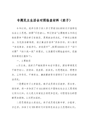 专题民主生活会对照检查材料(班子)今年以来,我单位班子深入学习贯彻XXX新时代中国特色社会主义思想,按照"不忘初心,牢记使命"主题教育工作的总体部署和理论学习有收获、思想政治受洗礼、干事创业敢担当、为民服务解难题、清正廉洁作表率"具体目标,深入推进自我革命、自我净化、自我提升,按照XXXXXX关于四个对照四个找一找的要求,认真撰写对照检查材料,现将具体情况汇报如下:一、主要收获x月以来,我班子严格按照中央省市要求,团结带领党员干部守初心、担使命、找差距、抓落实,对思想政治、理想信念、工作作风、干事担当、廉政勤政等方面进行了全方位的政治洗礼。一是理论学习大有收获。班子成员通过系统学、原本学、透彻学,进一步加深了对XXX新时代中国特色社会主义思想的认同与认知,在大是大非面前立场更加坚定,对理想信念的理解更加透彻,认识更加深刻。二是思想政治大受洗礼。班子成员通过集中学、分组学、自己学,加深了对XXX新时代中国特色社会主义思想的认识,加深了对党章党规党纪的学习理解,提高了自己崇规、守规、执规意识,增强了"四个意识",坚定了四个自信","两个维护"更加牢固,在思想上政治上行动上更加自觉地同以XXX同志为核心的党中央保持高度一致。三是干事创业更敢担当。班子成员通过集体学习、集体调研、集体研讨,对XXXXXX所讲的"百年未有之大变局有了更加清醒的认识,对我们党面临四大风险四大考验"的严峻复杂形势有了更为精准的理解,在工作中更加敢于担当、敢于冒险、敢于直面问题和解决难题。四是为民服务更加积极。班子成员通过走一线、跑基层、查民生,对"为人民服务"的宗旨体会更加深刻,对以人民为中心、矢志不渝艰苦奋斗的方向更加明确,对党领导干部表率带头作用的政治责任重担更加积极承担。五是清正廉洁常态长效。班子通过学理论、学典型、学经验,对廉洁自律、廉洁从政准则了解更加明朗,对守好底线、筑好防线方面更加常态,在自重、自省、自警、自励方面更加积极。二、存在问题班子通过群众提、自己找、上级点、互相帮、集体议,坚持严字当头、"实"字托底,深入查摆领导班子及成员的问题,突出表现为:(一)理论学习有收获方面。一是对理想信念的坚守还不够。个别班子成员认为理想信念比较抽象,共产主义比较遥远,工作生活中有一定的现实主义和功利主义思想,没有自觉做到像老一辈革命家、优秀共产党员那样为理想而奋不顾身去拼搏、去奋斗、去献出自己的全部精力乃至生命。二是大局意识不够强。个别班子成员缺乏用马克思主义立场、观点和方法去认识问题、分析问题、解决问题的理论自觉,还存在思想站位不高、考虑问题不够全面的现象,面对当前从严治党工作的高标准、严要求,总有想换换环境、歇歇气的心理,没有站在为人民服务的理想信念上思考工作。三是学习实践性不够强。个别班子成员在一定程度上忽视了对XXX新时代中国特色社会主义思想的系统研翊口深刻理解,忽视了理论联系实际、理论指导实践的重要原则和根本作用,存在着为了理论学习而学习,用理论学习装门面,实际上所学的理论与实际主要工作相脱节,起不到理论指导实践的应有效果。(二)思想政治受洗礼方面。一是政治敏感性还不够强。个别班子成员在政治信仰上始终是坚定的,但是对新形势下加强意识形态领域工作的认识还不够高,对中央和省市重大决策研究不够透彻、理解不够系统,对意识形态领域工作重视不够,忽视了意识形态领域的教育和管理。二是对政治纪律认识不够深。个别班子成员有时认为自己在行动上与党的要求保持一致就行了,思想认识不重要,对社会上一些错误的政治言论没有主动抵制,存在麻痹思想,对"四个意识"理解认识还需要进一步加强,在践行四个自信"的自觉性上还有一定差距,政治敏锐性和政治洞察力还有待加强。(三)干事创业敢担当方面。一是表率作用发挥不够好。个别班子成员在领导岗位时间长了,认为自己已经是"老人"了,改革攻坚、加快发展的锐气和闯劲不如以前,特别是随着年龄的增长,认为工作已经不错了,成绩也有了,就产生了"还可以、过得去、差不多"的自满心态,出现了"等一等、缓一缓、歇一歇"的松劲情绪,在急难险重任务面前没有真正地冲在前、豁出去、打得赢,以自身的模范行动为广大党员干部做示范、树标杆,而是工作患得患失,困难矛盾面前有推脱、躲避的思想。二是改革创新意识不够强劲。个别班子成员存在船到码头车到站思想,有时仅停留在确保完成各项重点工作任务和推进日常工作上。存在工作按部就班,想问题、做决策顾虑较多,开拓创新少,就工作干工作多,主动落实少,研究情况多,解决问题少,思路还不够活,站位还不够高,格局还不够大,工作上缺乏新意,缺少亮点,改革创新意识有待增强。三是部署工作不够细致。个别班子成员对于单位内一些日常工作,有时只注重结果,没有太多关注过程和细节,缺乏落实情况的监督指导和跟踪问效,致使一些工