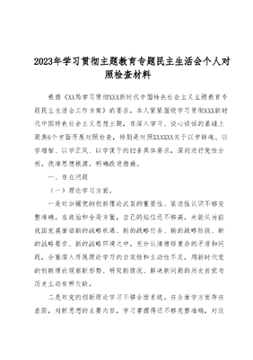 2023年主题教育专题民主生活会个人对照检查材料根据上级关于本次专题民主生活会的工作要求和单位党委统一安排,我结合自己思想和工作实际,认真研读党的XX大报告和党章,深入学习《XXX著作选读》《XXX新时代中国特色社会主义思想专题摘编》等书目,通过谈心谈话、座谈交流、实地调研等方式征求了意见建议共12条,并结合征求意见情况,深入查找问题,深刻剖析问题根源,明确了改进措施和努力方向。一、存在的主要问题(一)理论学习方面1.在系统学习上还不够。学习的自觉性、全面性、持续性还有欠缺,没有个人学习规划,平时集中学习上抓得比较紧,但过于依赖集中学习,个人自学抓得不够、开展不经常,多数时候是上级要求学什么就学什么,哪些方面与自身工作结合紧密就学习哪些方面,对照往深里走、往心里走、往实里走还有差距。2.在学思融合上还不够。对XXX新时代中国特色社会主义思想还没有完全做到融会贯通、深刻掌握,特别是有时候学习只停留在字面上的理解,缺乏深入思考、细致研究,在深刻认识和理解中国式现代化理论的科学架构及其相互关系上还有不小差距,尤其是在系统把握、扩展延伸上下功夫不够深入3.在转化做实上还不够。缺少结合工作实际将XXX新时代中国特色社会主义思想转化为推动工作的能力,解决实际问题上缺少创新举措,真正实现党建工作和业务工作相融合共促进等问题上办法还不多,效果也不够明显,工作中钉钉子精神不足,对艰巨复杂的任务缺少一个节点一个节点向前推进的劲头。(二)政治素质方面1.政治站位不够高。有时想问题、作决策、办事情,缺少思想认识上的格局和高度,对党所关心的、党所强调的,对定国安邦的重大原则、重大立场、重大利益,缺少密切的关注和深入的思考,不善于从大局、长远、战略上抓形势,看问题,没能时时处处事事同党的基本理论、基本路线、基本方略对标对表,政治自觉上还存在短板。有时政治站位低、政治视野窄,政治洞察力、分析力和判断力不强,不善于从一般事务中发现政治问题、从倾向性苗头性问题中发现政治端倪、从错综复杂的矛盾关系中把握政治逻辑,以致一些工作后续处置陷入被动。2.政治能力不够强。缺少认清和把握世界、国家以及地方发展形势的自觉性和积极性,主观上认为只要干好自己的本职工作就可以了,就是讲政治了。因此,在如何增强自身政治能力方面谋划不够多,也不够积极主动,透过现象看本质的方法和本领提升不快,在把握大势防范政治风险的政治大背景下,缺少见微知著的政治能力,对于一些工作,也是由于缺少政治能力,而抓不住问题的本质和要害,弄不清蕴藏其中的机遇与挑战、有利与不利因素,未能准确预判到政治风险所在和走势,不善于根据客观形势的变化制定和调整工作策略。(三)能力本领方面1.工作方式还需与时俱进。工作中遇到新情况新问题时,破解难题的力度还不够大、办法还不够多,在运用理论科学分析、准确决断、合理解决方面还存在一些差距。在解决一些历史遗留问题或棘手难题时,有时思路还不够开阔,针对性、实效性还不够强。2.工作思路还需拓展开阔。把握新发展阶段、贯彻新发展理念、构建新发展格局的政治能力、战略眼光、专业水平还存在不足,在加快XXX建设等方面,还需要进一步扩宽视野、开阔思路。3.防范化解风险挑战需加强。在面对意识形态、安全稳定的各种风险挑战方面,虽能积极作为,防范化解,但在带头发扬斗争精神,敢于斗争,迎难而上的要求方面缺乏主动斗争意识,斗争的技巧艺术有所欠缺。多是被动式的灭火应对,缺少主动式的斗争行动。(四)担当作为方面1.创新发展劲头需加强。有时在工作中存在思路不宽、办法不多的问题,很多时候对工作按部就班,习惯用既有经验、既有办法解决问题,对新情况新问题分析不足,在创新工作方法、创造性抓好工作落实方面做得还不够好,与高质量发展的要求还有很大差距,创新性措施办法不多,效果不够明显。2.开拓进取意识需加强。推动XX改革发展稳定,着力解决XX发展的弱势短板方面,工作的坚定性和坚韧性还不够,解决问题的思路缺乏创新,方式方法偏少。有时对待工作还停留在完成任务、守住底线,没有主动对标先进,从更高的标准、更严的要求、更好的成效去破解工作中深层次的问题。忽视了工作的积极性、主动性、创造性。3.善于斗争本领需加强。对网上出现的负面舆情和意识形态错误言论,缺少科学合理有效的斗争手段,组织专门力量主动发声、善于发声作用发挥不够,对网上舆情还缺少科学有效的应对处理机制,面对出现的网上舆情,没有很好地发挥斗争精神,有效稳妥地做好防范舆情工作。缺乏一竿子插到底的毅力,对如何妥善解决制约XX发展的深层次矛盾和问题,缺乏推进力度。(五)工作作风方面1.为民服务的宗旨树得不牢。对XXX的指导力度不够,对新时期广大群众的新期待研判不够及时,掌握不够全面,没能全面认清和全面掌握群众的多样化新需求,还没真正打通广大教职员工对美好生活向往的最后一