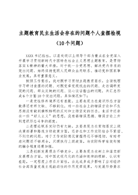 主题教育民主生活会存在的问题个人查摆检视(10个问题)XXXX书记指出,以县处级以上领导干部为重点在全党深入开展学习贯彻新时代中国特色社会主义思想主题教育,是贯彻落实X精神的重大举措,对于统一全党思想、解决党内存在的突出问题、始终保持党同人民群众血肉联系、推动党和国家事业发展,具有重要意义。按照工作要求,我对照学习贯彻主题教育要求,全面梳理学习研讨查摆的问题、对照党章党规找出的问题、走访调研发现的问题、群众反映的问题、谈心谈话指出的问题,共汇总形成6个方面10个突出问题,具体情况如下:一是党性修养境界还有差距。主要表现为在意识形态方面做得还有所欠缺、不够到位,对一些社会上的错误言论和不良思潮没有做到旗帜鲜明的反对和立场坚定的回击。生活中还存在一些好人主义的思想,没有将错误思潮、错误言论上升到意识形态斗争的高度。二是理论联系实际仍有欠缺。主要表现为在贯彻落实上级决策部署和路线方针政策方面,还存在和工作实际结合不紧密、不到位的问题。对于工作实际情况掌握得还不够透彻,有时考虑问题还不够周全,只顾执行上级政策,与实际科学有效衔接的融合程度还需加强。三是创新发展理念不够充分。主要表现为在树立和落实新发展理念方面,对中国式现代化的内涵和规律的理解、认识有差距,一定程度上存在片面性,由此或多或少影响了应对经济社会高质量发展主观能动性的作用发挥效果,与发展形势要求还有差距。四是工作落实力度不够强大。主要表现为一定程度上存在对落实效果不佳的部门压力传导不够。随着对各项工作深入地了解,发现个别单位领导干部存在对工作底子不清楚、头脑不清醒、思路不清晰的问题,还有个别干部存在执行落实不到位的问题,对此,督促落实的力度有待加强。五是政治理论素养还不够高超。由于对中国式现代化认识不够深刻,没有能科学准确把握中国式现代化内在规律,因此对中国式现代化学习理解也不够准确到位,需要持续加强学习和思考。同时,由于自己平时政治理论读本学习的多、原著学习的少,零散学习的多、系统学习的少,学习的深度不够,学习的系统性和经常性不够,政治理论学习成果没有得到很好的转化和升华。六是理论联系实际还不够紧密。在贯彻上级的决策部署时养成了不折不扣严落实,原原本本要执行的工作理念。但是从现在工作形势来看,以往那种一个工作模式能放之四海而皆准的办法行不通了,理论联系实际工作不够,可以说在一定程度上犯了经验主义的错误。七是发展理念更新还不够快速。对XX经济社会发展态势和规律认识不够深刻,在面对招商引资、供给侧结构性改革等方面的问题时,思想不够解放,理念和举措不够先进,对于在五大发展理念的框架下,如何推动XX经济平稳较快发展,需要进一步深入研究思考。八是责任意识树得还不够牢。对于个别部门工作效率低、精神状态差的问题,压力传导不够,没有真正形成一级向一级加压的状态。个别单位干部责任意识和担当意识不强,导致工作作风不实、工作主动性和积极性不高,影响了上级决策部署的落地生根,需要进一步加大压力传导力度,切实推动工作落实。九是两个责任落实还不到位。过去自己就是专门抓党务工作的,但随着岗位职务的变化,从过去的一心一意抓党建,变成了党建经济两手抓两手都要硬,这样靠自己以前在抓党建工作方面的经验来对待就稍显不足。在工作实践中,相对来说,一定程度上造成了对经济工作抓得多、研究的多、部署的多,而对党建工作抓得少、研究的少、部署的少,这些需要在今后的工作中加以改进。十是党风廉政建设还不够优化。没有坚决抵制、严厉批评不想为的歪风邪气,紧紧盯住胡作为、乱作为和道德素质差的问题。没有以清、实、细、严四字工作要求为根本,把问题意识和问题导向贯穿党员领导干部思想教育和道德修养的全过程,导致工作中存在办事拖拉、落实不快、效果不佳的情况。