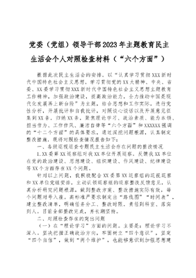 党委(党组)领导干部2023年主题教育民主生活会个人对照检查材料(六个方面)根据此次民主生活会的安排,以认真学习贯彻XXX新时代中国特色社会主义思想,学习贯彻党的XX大精神、中央、省委、XX委学习贯彻XXX新时代中国特色社会主义思想主题教育工作精神,加强政治建设,提高政治能力,全力推动中国是现代化发展再上新台阶为主题,结合思想和工作实际,进行党性分析,开展批评和自我批评,对照谈心谈话以及开展意见征集到XX条,归纳XX条,聚焦理论学习、政治素质、能力本领、担当作为、工作作风、廉洁自律等六个方面和XXXXXX强调的十二个方面的具体要求,通过深挖问题根源,认真制定整改措施,现将对照检查情况报告如下:一、各级巡视巡查专题民主生活会存在问题的整改情况1.XX委第XX巡察组对我XX单位开展巡察,反馈我XX单位在党的政治建设、思想建设、组织建设、作风建设、纪律建设等XX个方面存在XX个问题。针对以上问题,我积极配合XX委第XX巡察组的巡视巡察和XX单位党组安排,主动认领巡察组的巡察整改反馈意见,认真分析研究问题根源,做到整改方案、整改措施实际有效,每个问题对号入座。高标准严要求制定出路线图时间表,建立整改清单,明确任务分工、整改时限,责任到科室、落实到人。目前全部整改完成,并长期坚持。二、对照检查存在的突出问题(一)在理论学习方面的问题。主要是:理论学习不深入。坚决把握正确政治方向,牢固树立四个意识,坚定四个自信,做到两个维护,也能够意识到加强思想建设和理论学习的重要性,但实际中做得却不到位,学习内容上仅对上级文件规定的篇目进行学习,对党的理论知识没有深入扩展,对XXX新时代中国特色社会主义思想没有做到全面、系统、深入的学习;学习时间上仅依靠党组中心组、会议等进行学习,平时工作中没有做到常学常新、随学随用。(二)在政治素质方面的问题。主要是:在落实上级工作要求上有偏差。在工作学习中能够在思想上、行动上与党中央保持高度一致,但在具体的贯彻落实上,存在对精神领会慢,精神从学习领会到付诸行动存在一个过程,导致没有在第一时间执行,认为抓好业务工作就是抓好党建工作了,忽视了对党支部的建设和管理,没有充分发挥党组织的战斗堡垒作用和党员的先锋模范作用,没有做到以业务抓党建、以党建促业务,党建业务存在两张皮的现象。(三)在能力本领方面的问题。主要是:聚焦主责主业抓经济运行的本领还有欠缺。缺乏大XX单位意识,XXX业务工作较广,专业性较强,平时仅关注自己分管的业务领域,对其他科室如XX科、XX经济运行情况、项目审批等业务一知半解,未深入学习研究,认为守好自己分管的领域就行了,缺乏全XX单位意识。参与全XX单位制定高质量发展规划不够积极,不主动思考,受限于业务水平不精,没有站在前头部门的角度为规划编制提出建设性意见建议,没有将分管的工作与规划编制结合起来。(四)在担当作为方面的问题。主要是:对推动高质量发展项目争资争项争示范的担当作为不主动。我XX获得XXX项目较多,XXX项目投资额度大、实施内容多、建设周期长但是推进过程中存在问题也较多,由于思想麻痹,推动工作高质量发展的思想发条没有拧紧,担当作为、主动出击的机遇意识不强,导致该项目推进滞后,在坚决担负起解决问题、推进项目建设上存在迟疑观望,同时,没有按时每月对XXXXXX保供情况开展调度,缺少对XXX安全的检查督促。(五)在工作作风方面的问题。主要是:管理工作动真来实没有落到细处。全面从严治党的监督责任有待加强。时刻以党员标准要求自身、规范言行,做到党中央决定的坚决执行,党中央禁止的坚决不做,严守政治纪律和政治规矩。但是在安排调度工作时,有时怕影响干部感情,面对存在的问题,常认为把该说的话都说到就可以了,而不好板起脸来提出严格要求,对分管领域和分管科室的监督上存在革命靠自觉的思想,监督有所松懈,没有处理好严管和厚爱的关系。(六)在廉洁自律方面的问题。主要是:清正廉洁带头示范的效应有所减弱。我能坚持做到落实中央八项规定精神,坚决反对四风,认为自己没有条件和能力去做超标准和违约的事,这样就不自觉地产生了安于现状的思想,在廉洁自律方面没有百尺竿头更进一步,在廉政建设上没有逆水行舟不进则退,没有更高标准地严格要求自己。三、存在问题的原因分析通过认真对照和剖析自己,存在以上问题,究其原因为以下几个方面:(一)学懂弄通做实不到位。能够认识政治理论学习的重要性,按要求参加好集中学习,但没有做到学深悟透、学用结合,往往是零碎片段式学习多、原原本本读原著少,领会中央精神多、联系个人实际少,结合分管工作多、开展党性剖析少。缺乏自我审视,对世界观、价值观、人生观改造不够,导致共产主义精神追求领悟不够,对理想信念的坚守不够。(二)党性锤炼不够,