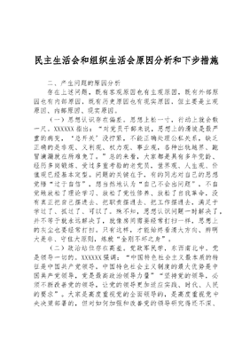 民主生活会和组织生活会原因分析和下步措施二、产生问题的原因分析存在上述问题,既有客观原因也有主观原因,既有外部原因也有内部原因,既有历史原因也有现实原因,但主要是主观原因、内部原因、现实原因。(一)思想认识存在偏差。思想上松一寸,行动上就会散一尺。XXXXXX指出:对党员干部来说,思想上的滑坡是最严重的病变,总开关没拧紧,不能正确处理公私关系,缺乏正确的是非观、义利观、权力观、事业观,各种出轨越界、跑冒滴漏就在所难免了。总的来看,大家都是具有多年党龄、经历多岗锻炼、受过多重考验的老党员,世界观、人生观、价值观已经基本定型。问题的关键在于,有的同志对自己的思想觉悟过于自信,想当然地认为自己不会出问题,不自觉地放松了理论学习、放松了党性修养、放松了自我革命,没有真正把自己摆进去、把职责摆进去、把工作摆进去,满足于学过了、抓过了、可以了。殊不知,思想认识问题一时解决了,并不等于就永远解决了,就像房间需要经常打扫一样,思想上的灰尘也要经常打扫。只有这样,才能始终看清大方向、辨明大是非、守住大原则,炼就金刚不坏之身。(二)政治站位存在高差。党政军民学,东西南北中,党是领导一切的。XXXXXX强调:中国特色社会主义最本质的特征是中国共产党领导,中国特色社会主义制度的最大优势是中国共产党领导,党是最高政治领导力量坚持党的领导,必须不断改善党的领导,让党的领导更加适应实践、时代、人民的要求。大家是高度重视党的全面领导的,是高度重视党中央决策部署的,但对如何加强和改善党的领导研究得还不深、把握得还不准、落实得还不力,缺乏草摇叶响知鹿过、松风一起知虎来、一叶易色而知天下秋的政治敏锐性,从工作层面考虑问题多、从政治层面考虑问题少,从自身层面考虑问题多、从大局层面考虑问题少,有的把党的全面领导视为眉毛胡子一把抓,有的把党领导一切变成党包办一切,不同程度存在时紧时松、时左时右的问题,说明我们的领导能力还不能很好地支撑政治站位。(三)组织观念存在温差。严密的组织体系,是马克思主义政党的优势所在、力量所在。XXXXXX指出:党的力量来自组织。党的全面领导、党的全部工作要靠党的坚强组织体系去实现每个党员特别是领导干部都要强化党的意识和组织观念,自觉做到思想上认同组织、政治上依靠组织、工作上服从组织、感情上信赖组织。过去一段时期,XXX政治生态不断遭受污染破坏,XXX等旧毒未祛,XXX案等新伤又至,政治亚文化形成的破窗效应影响恶劣,圈子文化盛行、组局文化流行、节礼文化通行、攀比文化风行,许多党员干部同不法分子在组局中认识、在节礼中熟悉、在圈子中深交、在攀比中变质,一步一步滑向违法犯罪的深渊,代价十分惨痛、影响十分恶劣、教训十分深刻。一方面,说明这些人忘了我是谁、为了谁、依靠谁,长期游离于党的组织之外,甚至凌驾于党的组织之上,最终搬起石头砸自己的脚;另一方面,也说明我们的组织建设长期存在脱实向虚、流于形式的问题,没有让党内政治生活这个熔炉真正热起来,导致许多问题久拖成疾、积重难返。(四)作风担当存在落差。作风问题本质上是党性问题。XXXXXX指出:一个地方的工作,成在干部作风,败也在干部作风;一个地方的事业,兴在干部作风,衰也在干部作风能否敢于负责、勇于担当,最能看出一个干部的党性和作风。近年来,保山经济社会发展呈高开低走趋势,主要指标增速从全省前列下滑到后列,从断崖式下跌演变为负增长,面对同样的环境、同样的政策、同样的困难,为什么我们的增速下滑、排名垫底,而有的州市却后来居上、逆势飘红。根源就在于我们有的干部高高在上、养尊处优,满足于守摊子、装样子、混日子,表象是不抓落实、不想落实、不会落实,实质是定力不足、动力不足、能力不足;表象是不谋项目、不争项目、不推项目,实质是怕冒风险、怕出问题、怕担责任;表象是增速下滑、排位下滑、发展下滑,实质是忠诚下滑、担当下滑、作风下滑。如果继续以这样的状态干事创业,保山高质量跨越发展就只能是一句空话。(五)纪律规矩存在压差。加强纪律性,革命无不胜。XXXXXX强调:党要管党、从严治党,靠什么管,凭什么治?就要靠严明纪律各级党组织要敢抓敢管,敢于板起脸来批评,这是对干部的爱护。长期以来,我们对XXX的反腐败斗争形势估计过于乐观,用信任代替了监督,导致在管党治党方面压力传导层层递减、监督管理逐级减弱,嘴上说得多、具体落实少,泛泛要求多、精准施策少,面上用力多、点上用力少,有的党规党纪和廉政警示教育流于形式,入脑不入心、入心不践行,没有形成不敢腐的震慑;有的制度写在纸上、挂在墙上、讲在嘴上,却大搞用人一言堂、花钱一支笔、决策一张纸,没有扎牢不能腐的笼子;有的不知恩、不知足、不知止,一心只想当大官、发大财,经