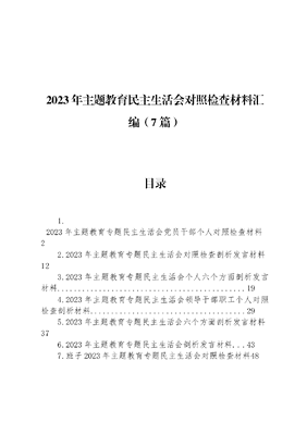 2023年主题教育民主生活会对照检查材料汇编(7篇)目录1.2023年主题教育专题民主生活会党员干部个人对照检查材料22.2023年主题教育专题民主生活会对照检查剖析发言材料123.2023年主题教育专题民主生活会个人六个方面剖析发言材料194.2023年主题教育专题民主生活会领导干部职工个人对照检查剖析材料.295.2023年主题教育专题民主生活会六个方面剖析发言材料376.2023年主题教育专题民主生活会剖析发言材料437.班子2023年主题教育专题民主生活会对照检查材料482023年主题教育专题民主生活会党员干部个人对照检查材料开展主题教育以来,我积极参加各类读书班和理论轮训活动,按照中心组要求认真通读规定书目,主动参加交流研讨,深入开展谈心交流和调研活动,重点对XX思想XX一系列重要讲话精神进行深学细研,学习领会省、市委和局党组关于开展主题教育的指示要求和通知精神,努力做到学思用结合、知信行统一。围绕理论学习、政治素质、能力本领、担当作为XX、工作作风、廉洁自律六个方面认真对照检查,深刻剖析原因,提出改进措施,明确努力方向。现对照剖析如下:一、存在的问题(一)在理论学习方面一是在学深悟透上有差距。在学习领悟XX思想过程中,没有持续坚持读原著、学原文、悟原理,没能深刻领会其核心要义、精神实质、丰富内涵、实践要求等,往往只是泛泛而谈,对一些热点焦点问题缺乏深层次的思考,在对照自己学、联系实际学上做得还不够。比如,在党支部去宣讲党的XX大精神时,往往根据宣讲稿照抄照搬,无法把政治理论转化为群众乐于接受的方式,基层党员听了也就听了,理解到的估计少之又少。二是在学以致用上有差距。理论的价值在于指导实践,学习的目的在于运用。在用XX思想武装头脑、指导实践、学以致用上把握得不够好,把握新形势、研究新情况、解决新问题的能力水平还有待进一步提升;对于透过现象看本质,把握好全局和局部、当前和长远等关系处理不够好,前瞻性思考、全局性谋划、整体性推进上还不够。比如,工作中往往从自身分管角度考虑得多,从全镇工作大局考虑得少。三是在持之以恒上有差距。对XX义思想的学习,认为平时业务工作较多,抽不出较长时间来学习,没利用好零散的时间,没明白学习五分钟也是学的道理;在学习时遇到其他事情被打断,也是抱着拖的思想,今天不行干脆明天再学。在平时的工作中,更多地也是学习分管工作相关的政治理论知识,对分管工作以外的其他方面知识的学习领悟,只停留在片面上,没有深入研究。(二)在政治素质方面一是锤炼党性修养的自觉性还有差距。在新常态新时代新形势下,作为支部组织委员,如何探索和发掘丰富的学习手段,特别是与支部自身情况与实际相结合方面,还研之不透。二是工作谋划站位不够高。坚持新时代党的组织路线,通过发挥党组织、党员干部的作用来影响和带领广大人民群众,作为组织委员,对辖区内村(社区)的**引领思路还不够新颖、成效还不够显著;在团结基层干部队伍、凝聚力量、推进工作方面,认识启发不够深刻、舆论引导不够深入、宣传教育不够广泛、理论和武装水平还有待进一步提升;在善于向群众学习,把群众意见、经验集中起来,形成群众智慧,融入群众中还不够经常。三是民主意识不够强。在日常工作中切实做到自觉践行民主集中制原则还不够到位。比如,在研究工作室,只关心自己分管工作,对于其他班子成员分管工作的问题,不主动、不充分,大多时候是无意见或者同意,没有认真思考提出切实可行的意见建议。作为班子成员,在正确处理其他班子成员相互关系上也做的不够。比如,遇到某个事情时,心直口快地说出一些不中听的话,也没有考虑其他人的感受,事后才发现某些话可能让人家听起不舒服。(三)在能力本领方面一是缺乏科学判断形势的能力。在科学把握形势变化、精准识别现象本质、清醒明辨行为是非、有效抵御风险挑战方面还不够。在善于思考根本性、全局性、长远性问题并进行系统性、前瞻性谋划方面还不够。在面对各种风险挑战时,眼睛不够亮、脑子不够快。比如,在事业单位专技晋升时,自认为是为大家好,早晋级早享受待遇,结果却出现了一系列连锁反应。二是缺乏掌握科学方法的能力。在学懂弄通**等政治理论上,读原著、学原文、悟原理,全面系统学习、及时跟进学、深入思考学、联系实际学等方面还不够。在强化问题导向、实践导向、需求导向,更加自觉地用政治理论解决重大问题、突出问题方面还不够。在增强科学思维,不断提高攻坚克难、化解矛盾、驾驭复杂局面的能力还不够。三是缺乏主动担当作为的能力。在善于发现问题、深入研究问题、解决问题方面还不够;在经风雨、长才干,用心用情用力服务群众方面还不够;在强化责任意识,直面矛