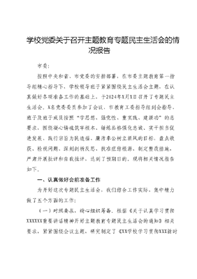 学校党委关于召开主题教育专题民主生活会的情况报告市委:按照中央和省、市党委的安排部署,在市委主题教育第一指导组精心指导下,学校领导班子紧紧围绕民主生活会主题,在认真做好各项准备工作的基础上,于2024年X月X日召开了专题民主生活会。X名党委委员参加了会议,市教育工委指导组到会指导,班子及班子成员按照学思想、强党性、重实践、建新功的总要求,围绕凝心铸魂筑牢根本、锤炼品格强化忠诚、实干担当促进发展、践行宗旨为民造福、廉洁奉公树立新风的目标,盘点收获、检视问题、深刻剖析反思、找准症结根源、制定整改措施,严肃开展批评和自我批评,达到了预期目的。现将相关情况报告如下。一、认真做好会前准备工作为开好这次专题民主生活会,我们结合工作实际,集中精力做了五个方面的工作:(一)对照要求,精心组织筹备。根据《关于认真学习贯彻XXXXXX重要讲话精神开好主题教育专题民主生活会的通知》相关要求,紧紧围绕会议主题,研究制定了《XX学校学习贯彻XXX新时代中国特色社会主义思想主题教育专题民主生活会工作方案》,重点对理论学习、谈心谈话、检视问题、撰写剖析材料、开展批评与自我批评等提出了具体要求,细化明确X个环节的任务要求和时间节点,坚持从严从实做好各项准备工作,确保各项工作有序推进。(二)深学细悟,打牢思想基础。会前,班子成员坚持集体学习和个人自学相结合,系统学习了党的XX大报告、《XXX著作选读》《XXX新时代中国特色社会主义思想专题摘编》,系统学习了XXXXXX关于严肃党内政治生活、树立和践行正确政绩观重要论述等内容,重点领会把握XXXXXX关于加强党的政治建设,做到忠诚干净担当。坚决贯彻落实党中央决策部署,认真研读新形势下党内政治生活的若干准则、《中国共产党纪律处分条例》和《县以上党和国家机关党员领导干部民主生活会若干规定》等党内法规坚持读原著、学原文、悟原理,联系实际学、带着问题学、及时跟进学,在个人自学基础上,组织专题学习研讨,进一步深化认识、统一思想,为开好民主生活会打牢了思想基础。(三)立足实际、广泛征求意见。为确保会议取得实效,学校领导班子把查摆问题作为民主生活会准备工作的重点,对照学习贯彻XXX新时代中国特色和社会主义思想,维护党中央权威和集中统一领导,践行宗旨、服务人民,求真务实、狠抓落实,以身作则、廉洁自律,履行全面从严治党政治责任,树立和践行正确政绩观,反面典型案例剖析等X个方面,既梳理检视整改和遵守党章党规方面存在的问题,又通过下发征求意见表、座谈访谈等形式,广泛听取和征求各党支部、处(科)室的意见建议,并针对查摆出的问题,原汁原味进行了反馈,班子成员深查细照反省自身,主动认领问题,做到谁分管、谁负责,确保问题对号入座,防止了轻查摆问题、重撰写材料的现象。(四)坦诚相待,深入谈心谈话。班子成员紧扣学习贯彻XXX新时代中国特色社会主义思想这一主题,严格按照四个必谈三个防止的要求,谈参加主题教育的收获体会,谈存在的差距不足,谈对整改落实的具体措施和意见建议,既谈自身差距、又谈对方不足,把问题谈开、把道理谈透、把思想谈通,通过谈心谈话,谈透问题、沟通思想、增进团结、促进工作,为开展批评和自我批评奠定坚实基础。(五)紧扣主题,认真对照检查。班子成员严格对照学习贯彻XXX新时代中国特色社会主义思想、维护党中央权威和集中统一领导、践行宗旨服务人民等6个方面和树立和践行正确政绩观、反面典型案例剖析等2个方面,按照衡量尺子严、查摆问题准、原因分析深、整改措施实的要求,坚持把自己摆进去、把职责摆进去把工作摆进去,认真对照检查,深刻剖析反思,撰写发言提纲。班子成员坚持问题导向,查问题以事实作支撑,敢于触及深层次问题、实质性问题,力求把准脉、有深度,真正把自己摆进去,严格进行剖析检查。班子对照检查材料由党总支书记亲自主持起草,同时对班子个人的材料严格审核把关,真正做到了见人见事见思想。二、紧扣主题开展批评与自我批评民主生活会上,党委书记代表学校领导班子做对照检查,首先报告了会前准备情况、上年度民主生活会查找出的问题和巡视反馈问题整改情况,对照学习贯彻XXX新时代中国特色社会主义思想、维护党中央权威和集中统一领导、践行宗旨服务人民等X个方面查找出了学用结合有脱节,意识形态责任制落实不到位,整治形式主义不彻底等X条问题,从理想信念、宗旨观念、进取精神、实干作风、勤廉意识等五个方面深入剖析了问题产生的原因,明确了今后的努力方向和整改措施。随后,学校班子成员认真开展了批评和自我批评,进一步明确了今后的努力方向和改进措施,达到了统一思想、增进团结,共同提高、推动工作的目的。每位班子成员发言后,其他同志分别对其提出批评意见。总的来看,这次民主生活会,对每个班子成员和党员同志来说,灵魂都受到了触动、心灵受到了洗礼、思想得到了警醒,认识得到了提高,增强了