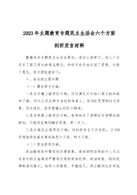 2023年主题教育专题民主生活会六个方面剖析发言材料根据本次专题民主生活会要求,通过认真学习,深入广泛征求了职工群众的意见建议,和班子成员也交流了思想、交换了意见。现对照检查如下:一、存在的主要问题(一)理论学习方面。一是在学懂上做得还不够,仅仅满足于对核心要义的知道和了解,但从认识论和方法论的角度上,对XXX思想的时代背景、历史地位、哲学意蕴认识还不够深。二是在弄通上做得还不够,有单纯为了学理论而学理论的倾向,不能完全做到融会贯通、举一反三。三是在做实上做得还不够,对如何结合工作实际,以XXX思想指导改革发展实践思之不深、研之不透。(二)政治素质方面。政治敏锐性和警觉性还要提高,要深刻吸取党的十八大以来查处的反面典型严重违反党的政治纪律、政治规矩、组织纪律的深刻教训,始终心存敬畏、手握戒尺,真正做到无条件地遵守党的纪律和规矩。执行请示报告制度还需要更严更实,对一些单位主要领导落实上级决策部署情况不及时报告的情况,虽然进行了严肃批评和严格督查,但没有较真去处理。对歪风邪气的抵制要更坚决。对少数干部身上出现的问题,看到了,指出了,但公开批评和从严追责问责还不够。邪气压不住,正气就上不来。下一步,还要结合党内学习教育,刹住我们身边的不正之风,让大家不断看到党员干部队伍的新气象。(三)能力本领方面。一是政治鉴别力需要提升。对党员的教育有弱项,特别是在新发展党员的审核把关上,对宗教信仰了解重视不够。二是开拓创新意识不够。工作上满足于现状,对新政策、新问题的研究不够,习惯于凭经验做事;缺乏探索做好新时期党建及纪检工作新思路、新做法的主动性,致使工作思路不宽,办法不多。三是攻坚克难有畏难情绪。虽然对当前党风廉政建设工作发展态势保持关注,但不自觉地产生了不愿意投入精力去触及难题和一些敏感领域。精神状态上革命意志有所消退,要求有所放松,攻坚克难的锐气和韧劲有所下降;导致工作中注重工作方法、加强分类指导,既有效贯彻落实,又确保收到效果上主观能动性发挥不够。(四)担当作为方面。一是担当负责、攻坚克难的精神有所弱化,缺少碰硬精神,担当意识、责任意识有待加强;二是督查指导、狠抓落实的韧劲不足,对一些既定的事项、确定的工作,存在依赖开会、发文推动工作,比如,有些事情会议安排了、文件下发了,但议来议去、转来转去、推来推去,最后没有很好落实;三是履行全面从严治党的责任不够有力,整体性思考谋划不够,缺乏创新性的举措和办法,使得工作停留在一般性号召上,针对性和实效性不够。(五)工作作风方面。一是在处理一些问题上,有急躁情绪,缺乏耐心,对下属批评多、鼓励少,要求多、帮带少。二是存在忙于事务性工作多、静下心来思考少,对业务工作用心多、对其他工作关注少,布置安排多、督促检查少的现象。三是在业务接待和对外往来时,面对大是大非虽能坚持原则、秉公办事,但有时考虑兄弟单位情谊、地方政府情面及人情世故、乡风乡俗的原因,执行标准把关不严,出现了同城接待的问题,尽管进行了整改,但需永远牢记。(六)廉洁自律方面。平时不认真学习深入理解XXX关于纪律规矩的重要论述和系列重要讲话精神,不学习不遵守《中国共产党纪律处分条例》《廉洁准则》和党的优良传统规矩,对五个必须五个绝不允许七个有之存有侥幸心理。角色定位不准,没有摆正自己的位置,对领导和同事缺乏应有的尊重。 二、今后努力方向今后,要进一步加强学习,进一步加强党性修养,严守党的各项纪律和规矩,更好地完成组织交给自己的各项任务。(一)坚持以XXX思想武装头脑。持之以恒在学懂弄通做实党的**大精神和XXX思想上下功夫,真正学出坚定信念、学出绝对忠诚、学出使命担当。要坚持把自己摆进去,把职责摆进去,把工作摆进去,紧密结合破解改革发展难题来实践,不断深化思想认识,提高政治站位,推动工作发展。要扎实开展不忘初心、牢记使命主题教育,筑牢政治信念,站稳政治立场,切实增强四个意识,坚定四个自信,做到两个维护。(二)坚持对党绝对忠诚。把忠诚体现到岗位上、落实到行动中,自觉把工作的重心放在全省繁荣发展、改革发展的大局中考量。严格遵守党的政治纪律和政治规矩,真正做政治上的明白人、老实人。增强政治敏锐性和政治鉴别力,自觉同各种违背原则、违反党纪党规、损害党中央权威的现象和问题作坚决斗争。履行全面从严治党政治责任,指导督促以党的政治建设为统领全面加强党支部建设,坚定不移推动全面从严治党向纵深发展。(三)坚持真抓实干。干工作、谋事情,从职工对小康生活的期待出发,使规划、方案、办法、措施更加符合实际情况、符合客观规律、符合科学精神,努力在推动改革发展、计划管理、项目争取、事业单位人事改革、解决基层实际困难、改善职工生产生活条件等方面下足功夫,干出经得起时间、实践检验的实绩。(四)坚持廉洁自律。自觉加强主观世界改造,勤于检视心灵、洗涤灵