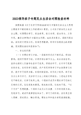 2023年专题民主生活会领导班子对照检查材料按照中央以及市委关于开展主题教育的要求部署,市政府办公室党组紧紧围绕此次主题教育专题民主生活会的会议主题,在深化理论学习、广泛征求意见的基础上,对照实施方案明确的六个方面重点查摆内容,着力查找存在的突出问题,深挖问题产生的根源,明确努力方向和整改措施。下面,按照要求我代表班子作对照检查。一、存在的问题(一)在理论学习方面。一是学习形式还不够灵活、精细。个别班子成员虽然能够严格落实党组学习制度,但是学习的形式还不够灵活,学习的程度还不够精细。有时用看读本、听讲座代替读原著、学原文,还没有完全做到原原本本、原汁原味地学。有时比较注重分管领域内容的学习,其他方面的内容学得相对少一些。二是学习内容还不够全面、精确。客观来看,在学习的内容上,系统性还不强,不能融会贯通的理解和把握新思想、新理论。党组理论中心组落实了集中学习科目,但学习内容涉及促进经济社会发展等课题还不够。特别是服务全市发展方面缺少靶向性。在中心任务最重的时段,抓班子集中学习力度有所减弱。三是学习成果转化还不够见效、精准。在入脑入心、成果转化、指导实践方面还有一定的差距,有时学习理解是相对孤立的,不能很好地运用理论和实践、历史和现实、当前和未来相结合的方法不能完全做到知其然,又知其所以然,与实际工作对接还不够紧密。(二)在政治素质方面。一是践行两个维护还有差距。主要表现在个别班子成员还不善于在大局中找定位、定目标,不能从政治高度、大局角度综合考虑问题,如,在综合办公、贯通协调、上传下达等过程中,与市委市政府战略部署结合不够紧密在政治素养方面还不够高,政治判断力、政治领悟力、政治执行力不够强,缺乏政治的敏锐性和洞察力。二是政治能力还有所欠缺。主要表现个别班子成员在运用政治眼光观察和分析问题的能力不够强,从综合办公中体现政治导向、政治要求做得还不到位对标增强八种本领、提高七种能力要求还有差距。如,在深入分析办公运转、上下联动、办文办会、事务管理等方面产生问题原因上还存在工作研究不透、规律把握不准的问题,透过业务工作发现政治问题端倪的能力还需提升。三是谋划党建工作思路不够宽阔。个别班子成员在谋划部署党建工作过程中,缺少对于党建工作前瞻性的谋划,虽然也召开了多次会议研究党建工作,但是深入系统研究的时候不多,把一些新的理论、新的举措运用到工作中来效果不明显,对于如何丰富党建工作的载体、创新党建工作的举措没有进行深度思考,仅满足于常规动作的开展对于结合市政府办公室工作的实际没有及时推陈出新。(三)在能力本领方面。一是思想解放不深入。对新形势下市政府办公室工作如何守正创新、走深做实缺乏深度思考,透过现象看本质的能力有待进一步提高,导致学习领会上级政策文件精神还不够精准,思想认识与新时代全市发展要求还有一定差距。站在综合办公职能作用的发挥以及全市经济社会发展大局去思考问题的高度不够,对改革突破的方向和着力点找得不准,从而影响了工作质效。二是能力不济不会为。部分班子成员不重视学习,学习不深不透,不注重提升自身综合素质,导致存在干部履职能力不足、本领恐慌问题,没有干一行、钻一行、精一行的恒心毅力,对自己负责工作必需的业务知识,浅尝辄止,满足于一知半解,工作不求过得硬、只求过得去。有时,面对纷繁复杂的工作理不清头绪,找不到解决问题、实现目标的路径。把市政府办公室工作成效至于全国的坐标系内进行衡量做得还不够到位,对于其他市市先进的经验做法缺少积极借鉴、消纳吸收的主动性。三是业务培养方法不多。当前,我室干部存在能力发展不均衡、不全面的问题,这说明对加强干部队伍专业能力建设的长期性、艰巨性认识还不够深刻,谋划制定提升干部综合能力的方法还不够具有针对性,载体不够丰富,效果不够明显,导致面对新形势新任务时,应对风险挑战的本领还有待进一步提升,缺乏及时发现和解决自身存在问题的意识和能力。比如,在运用网络手段提升办公室文秘人员文稿写作水平上,室里不少同志要求办理年度会员一事,因各种原因,一直未落实。(四)在担当作为方面。一是主动创新意识不够强。部分班子成员在实际工作中创新意识不强,视野不够开阔,不能跳出小圈子看问题,不能站在全局谋思路,有的面对实际困难和问题拿不出新办法新举措,凡事找依据、等上面、看外边,文件没说的不敢说、以前没干的不敢干。二是善于斗争本领还不够强主要表现在面对新时代、新矛盾、新目标、新部署,班子成员还没有完全适应,未能做到把个人的理想信念、价值追求充分融入到工作事业中。面对各项艰巨的任务,缺乏敢于斗争的勇气和舍我其谁的魄力,缺乏以钉钉子精神抓落实的韧劲。三是攻坚克难缺少务实管用招法。当前提升综合办公质效作为我们工作的重中之重,难中之难,党组班子成员对于督办落实这块硬骨头还没有完全啃下来,在推动重大事项交办落实过程中
