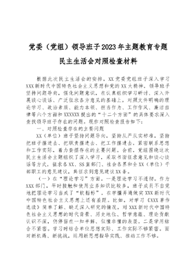 党委(党组)领导班子2023年主题教育专题民主生活会对照检查材料根据此次民主生活会的安排,XX党委党组班子深入学习XXX新时代中国特色社会主义思想和党的XX大精神,领导班子坚持问题导向,强化问题意识,在认真组织学习研讨、深入开展谈心谈话、广泛征求各方意见的基础上,对照文件明确的理论学习、政治素质、能力本领、担当作为、工作作风、廉洁自律等六个方面和XXXXXX提出的十二个方面的具体要求深入查找领导班子存在的问题。现作对照检查报告如下:一、对照检查存在的主要问题XX(单位)班子坚持问题导向,坚持从严从实标准,坚持把班子摆进去、把职责摆进去、把工作摆进去,紧密联系思想和工作实际,着力查摆存在的主要问题。会前,党组围绕这次民主生活会主题组织了深入学习,采取书面征求意见和谈心谈话等方式,征求各XX、SS直部门、社会各界和全XX(单位)干部职工的意见建议,共征求到意见建议XX条。(一)在理论学习方面。一是理论学习不透彻。作为XXX部门,平时接触和使用业务知识比较多,班子成员不自觉地把理论学习当成了软指标,在学懂弄通做实XXX新时代中国特色社会主义思想上还有差距。比如,对学习《XXX著作选读》简单了解、缺乏深入研究的情况,对XXX新时代中国特色社会主义思想的时代背景、历史地位、哲学意蕴、理论贡献认识不深,仍停留在一知半解、似懂非懂的表层。二是学用结合不紧密。学习时结合单位思想实际、工作实际不够紧密。面对新机遇、新挑战,运用新思想指导实践、推动工作不够。(二)在政治素质方面。一是落实上级决策部署不彻底。在落实党中央和省、SS委各项决策部署时,深入研究思考破解问题瓶颈的办法不多,比如:在XX工作中,由于对自身困难强调多,对全XX(单位)利益考虑少,没有指导好相关部门抓实XX,导致XX投资出现负增长的被动局面。二是政治敏锐性不够,在XX建设中统筹谋划、推进、落实上考虑得不够周全,推进得不够系统,在XX建设参谋助手作用发挥不够,没有从政治上去思考问题,仅从XX统筹调度的角色上就调度而调度,就执行文件而执行文件,在XX建设体制机制上谋划创新不足。(三)在能力本领方面。一是履职尽责有差距。对部分XX工作存在重申报轻管理的情况,认为XX工作申报成功就算完成任务了,对XX工作的实施、管理、跟踪缺乏统筹调度,导致部分XX工作推进落实不到位。如,目前XX工作仅完成上一年度建设任务,在XX工作推进中没有充分发挥XX牵头作用,导致该XX工作2023年进度较慢。二是调研本领不强。调查研究不深入,特别是带着问题调研、带着思考调研不够。比如,在对单位乡村振兴办帮扶开展调研时,主要对村工作情况开展调研,个别班子成员到本单位挂帮的XX村去参与乡村振兴工作少,与群众见面少、交流少,倾听群众所思所想所盼更是少。(四)在担当作为方面。一是担当作为不主动。参谋助手和独当一面的作用发挥不够突出,有时存在抓工作落实不够主动情况。比如,落实XX工业化大比武工作任务重,牵头XX工作时,随着经济形势好转,放松了思想,没有更进一步加强对XX情况开展调度。二是攻坚克难的意志力薄弱。个别班子成员遇到困难和阻力时,攻坚克难、敢于啃硬骨头的拼劲和狠劲不足,没有积极奋发有为的工作状态,比如,对待长期未解决的2个信访问题,有涉及XX工作和XX的问题目前仍未完全整改到位。(五)在工作作风方面。一是作风建设没有压实。部分同志在抓工作落实上还存在着重布置、轻落实的问题,有些工作部署在落实过程中跟得不紧、督的不严,导致部分XX(单位)党组会议定事项落实不够到位。二是落实党内政治生活制度打折扣。党内政治生活开展不够深入,出现业务工作繁忙时顾不上按时召开三会一课、主题党日,对党支部的建设和管理有所放松,没有充分发挥党组织的战斗堡垒作用和党员的先锋模范作用。班子成员间的沟通交流不够充分,开展谈心谈话时提出的问题不够深刻,班子成员相互之间讲优点多、提期望多,相互批评讲工作问题多,讲思想问题少。(六)在廉洁自律方面。一是廉政教育不深入。主观上政治敏锐性还不够强,班子常常认为不可能违反政治纪律,对于廉政教育的重视程度还不够,在纪律教育的广度、深度和力度上还不够,纪严于法的要求还未深入人心,放松了对严格的要求,没有从清正廉洁的高度去认识其危害性,廉政教育没有形成常态化机制,自觉执行制度和纪律意识有所松懈。二是违纪违法的情况仍然小范围存在,班子没有没有充分意识到政治纪律是带电的高压线、政治规矩是高悬的铁戒尺,特别是公职人员酒后驾车、违法驾驶等问题屡禁不止,今年以来,XX名同志因XX原因受到XX处分。二、产生问题的原因分析通过认真地反思和深刻地剖析,存在上述问题和不足的主要原因有以下几个方面:(一)理论武装抓得不紧。对新形势下如何更好地维护党的形象权威、宣传党的政策主张、巩固党的