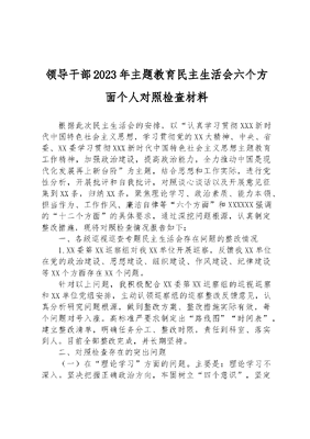领导干部2023年主题教育民主生活会六个方面个人对照检查材料根据此次民主生活会的安排,以认真学习贯彻XXX新时代中国特色社会主义思想,学习贯彻党的XX大精神、中央、省委、XX委学习贯彻XXX新时代中国特色社会主义思想主题教育工作精神,加强政治建设,提高政治能力,全力推动中国是现代化发展再上新台阶为主题,结合思想和工作实际,进行党性分析,开展批评和自我批评,对照谈心谈话以及开展意见征集到XX条,归纳XX条,聚焦理论学习、政治素质、能力本领、担当作为、工作作风、廉洁自律等六个方面和XXXXXX强调的十二个方面的具体要求,通过深挖问题根源,认真制定整改措施,现将对照检查情况报告如下:一、各级巡视巡查专题民主生活会存在问题的整改情况1.XX委第XX巡察组对我XX单位开展巡察,反馈我XX单位在党的政治建设、思想建设、组织建设、作风建设、纪律建设等XX个方面存在XX个问题。针对以上问题,我积极配合XX委第XX巡察组的巡视巡察和XX单位党组安排,主动认领巡察组的巡察整改反馈意见,认真分析研究问题根源,做到整改方案、整改措施实际有效,每个问题对号入座。高标准严要求制定出路线图时间表,建立整改清单,明确任务分工、整改时限,责任到科室、落实到人。目前全部整改完成,并长期坚持。二、对照检查存在的突出问题(一)在理论学习方面的问题。主要是:理论学习不深入。坚决把握正确政治方向,牢固树立四个意识,坚定四个自信,做到两个维护,也能够意识到加强思想建设和理论学习的重要性,但实际中做得却不到位,学习内容上仅对上级文件规定的篇目进行学习,对党的理论知识没有深入扩展,对XXX新时代中国特色社会主义思想没有做到全面、系统、深入的学习;学习时间上仅依靠党组中心组、会议等进行学习,平时工作中没有做到常学常新、随学随用。(二)在政治素质方面的问题。主要是:在落实上级工作要求上有偏差。在工作学习中能够在思想上、行动上与党中央保持高度一致,但在具体的贯彻落实上,存在对精神领会慢,精神从学习领会到付诸行动存在一个过程,导致没有在第一时间执行,认为抓好业务工作就是抓好党建工作了,忽视了对党支部的建设和管理,没有充分发挥党组织的战斗堡垒作用和党员的先锋模范作用,没有做到以业务抓党建、以党建促业务,党建业务存在两张皮的现象。(三)在能力本领方面的问题。主要是:聚焦主责主业抓经济运行的本领还有欠缺。缺乏大XX单位意识,XXX业务工作较广,专业性较强,平时仅关注自己分管的业务领域,对其他科室如XX科、XX经济运行情况、项目审批等业务一知半解,未深入学习研究,认为守好自己分管的领域就行了,缺乏全XX单位意识。参与全XX单位制定高质量发展规划不够积极,不主动思考,受限于业务水平不精,没有站在前头部门的角度为规划编制提出建设性意见建议,没有将分管的工作与规划编制结合起来。(四)在担当作为方面的问题。主要是:对推动高质量发展项目争资争项争示范的担当作为不主动。我XX获得XXX项目较多,XXX项目投资额度大、实施内容多、建设周期长但是推进过程中存在问题也较多,由于思想麻痹,推动工作高质量发展的思想发条没有拧紧,担当作为、主动出击的机遇意识不强,导致该项目推进滞后,在坚决担负起解决问题、推进项目建设上存在迟疑观望,同时,没有按时每月对XXXXXX保供情况开展调度,缺少对XXX安全的检查督促。(五)在工作作风方面的问题。主要是:管理工作动真来实没有落到细处。全面从严治党的监督责任有待加强。时刻以党员标准要求自身、规范言行,做到党中央决定的坚决执行,党中央禁止的坚决不做,严守政治纪律和政治规矩。但是在安排调度工作时,有时怕影响干部感情,面对存在的问题,常认为把该说的话都说到就可以了,而不好板起脸来提出严格要求,对分管领域和分管科室的监督上存在革命靠自觉的思想,监督有所松懈,没有处理好严管和厚爱的关系。(六)在廉洁自律方面的问题。主要是:清正廉洁带头示范的效应有所减弱。我能坚持做到落实中央八项规定精神,坚决反对四风,认为自己没有条件和能力去做超标准和违约的事,这样就不自觉地产生了安于现状的思想,在廉洁自律方面没有百尺竿头更进一步,在廉政建设上没有逆水行舟不进则退,没有更高标准地严格要求自己。三、存在问题的原因分析通过认真对照和剖析自己,存在以上问题,究其原因为以下几个方面:(一)学懂弄通做实不到位。能够认识政治理论学习的重要性,按要求参加好集中学习,但没有做到学深悟透、学用结合,往往是零碎片段式学习多、原原本本读原著少,领会中央精神多、联系个人实际少,结合分管工作多、开展党性剖析少。缺乏自我审视,对世界观、价值观、人生观改造不够,导致共产主义精神追求领悟不够,对理想信念的坚守不够。(二)党性锤炼不够,以落实业务工作替代党