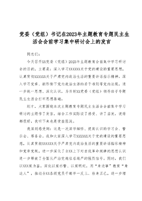 党委(党组)书记在2023年主题教育专题民主生活会会前学习集中研讨会上的发言同志们:今天召开XX党委(党组)2023年主题教育会前集中学习研讨会的目的,主要是:深入学习XXXXXX关于党的建设的重要思想,认真贯彻XXXXXX关于严肃党内政治生活的重要讲话指示精神,深入学习党章、新形势下党内政治生活的若干准则等党内法规,进一步统一思想、深化认识,为开好XX党委(党组)领导班子专题民主生活会打牢思想基础。刚才,大家围绕本次主题教育专题民主生活会会前集中学习研讨的主题作了发言,结合工作实际谈了感受、讲了启发,说得都很好,我听下来也是受益匪浅。我深刻感受到:这是一次深学细悟、提高认识的学习会、警示会、筹备会。我和大家深入学习XXXXXX关于党的建设的重要思想,认真贯彻XXXXXX关于严肃党内政治生活的重要讲话指示精神和党章党规,进一步深化了全XX上下对自我革命规律的思想认识进一步释放了全面从严治党越往后越严的强烈信号。同时,我们以XXX案为鉴,深化以案示警、以案明纪,用身边事教育身边人,推动全XX各级党员干部举一反三、检身正己,进一步增强了拒腐防变和抵御风险能力,切切实实、彻彻底底地为我们开好本次主题教育专题民主生活打下了良好的思想基础、政治基础同志们,我们要深刻认识到:勇于自我革命,是中国共产党最鲜明的政治品格。党的十八大以来,XXXXXX把全面从严治党纳入四个全面战略布局,提出一系列管党治党、兴党强党的新理念新思想新战略,坚定不移推进党风廉政建设和反腐败斗争,持续开展党内集中教育,打出一套自我革命的组合拳,探索出依靠党的自我革命跳出历史周期率的第二个答案。全XX各级党组织和党员干部要深入学习贯彻XXXXXX关于党的建设的重要思想,把坚持和加强党的全面领导贯穿XXX高质量发展工作全过程各环节,坚持不懈以自我革命精神加强政府自身建设努力在以学铸魂、以学增智、以学正风、以学促干上取得实实在在成效,奋发有为推动XX高质量发展和现代化建设。第一,要切实加强政治站位、不断提高党性修养。坚持不懈用XXX新时代中国特色社会主义思想凝心铸魂、真学真懂、笃信笃行,努力学出更加忠贞的信仰、更加坚定的信念、更加纯粹的忠诚。要始终把衷心拥护两个确立、忠诚践行两个维护作为最高政治原则和根本政治规矩,在思想上同心同德、在政治上旗帜鲜明、在行动上紧紧跟随,要自觉用五个必须正心修身用七个有之自警自省,坚决同一切破坏党中央权威和集中统一领导的行为作斗争。要始终与以XXX同志为核心的党中央在思想上政治上行动上保持高度一致,不折不扣落实党中央各项部署要求,自觉把工作放到党和国家大局中去谋划和推进,坚持在XX委的领导下做好工作。第二,要切实强化理论武装、不断提高以学促干的思想动力要围绕党的XX大报告、党章、《XXX著作选读》《XXX新时代中国特色社会主义思想专题摘编》《XXX新时代中国特色社会主义思想学习纲要》(2023年版)、XXXXXX《论党的自我革命》《XXX新时代中国特色社会主义思想的世界观和方法论专题摘编》《XXX关于调查研究论述摘编》4本必读书和四本选读书,进一步细化理论学习个人重温表,在反复学、递进学中得到螺旋式上升的系统认识、理论提升。要在持之以恒推动深化、内化、转化上下功夫,在学懂弄通做实上持续用力,把理论学习和高质量发展的目标任务结合得更加紧密,真正转化为推动高质量发展和现代化建设的思路、方法和路径。第三,要切实严肃党内政治生活、不断提高自我革命的主动性。要增强自我革命精神,用好批评和自我批评这个锐利武器,不断勘误纠错、校正言行,在反求诸己中练就金刚不坏之身要严守党的生活纪律,无论八小时之内还是八小时之外都以共产党员的标准严格要求自己、约束自己,自觉远离低级趣味,交益友、远损友,常修个人品德,弘扬家庭美德。要示范带头遵守社会公德严格执行民主集中制,严格落实请示报告制度,用好批评和自我批评武器,始终严格按党的制度办事。第四,要切实强化正风肃纪反腐、不断提高风清气正的政治生态。要加强干部监督管理,健全监督制度体系,精准运用四种形态,一体推进三不腐,始终保持惩治腐败高压态势。要坚持受贿行贿一起查,斩断围猎与甘于被围猎的利益链条,铲除不正之风和腐败问题滋长蔓延土壤,持续营造风清气正、海晏河清的政治生态。坚持反腐败永远吹冲锋号,保持惩治腐败高压态势,坚决守牢廉洁自律底线。要始终勤政有为担当实干,坚决防范化解重大风险,全力推动经济社会高质量发展,不断为XX老百姓创造高品质生活,以XXX、百姓富、XX美的成果体现主题教育的实际成效。我就讲这么多。谢谢!