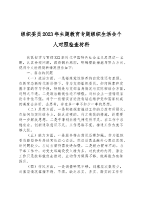 组织委员2023年主题教育专题组织生活会个人对照检查材料我紧扣学习贯彻XXX新时代中国特色社会主义思想这一主题,认真检视问题,深刻剖析原因,明确整改措施与努力方向。现将个人检视剖析情况报告如下:一、存在的问题(一)政治方面。一是锤炼党性修养的自觉性还有差距。在新常态新时代新形势下,作为支部组织委员,如何探索和发掘丰富的学习手段,特别是与支部自身情况与实际相结合方面,还研之不透。二是政治敏锐性还不够强。对社会上一些错误言论斗争性不强,对于一些错误言论没有站在维护党和国家权威的高度去分析、去思考,存在多一事不如少一事的思想。(二)思想方面。一是积极探索推动工作的力度有所弱化。在如何与实际结合上,缺乏过硬的、行之有效的措施,还需要进一步解放思想。二是干事创业精气神有所不足。在工作中求稳有余,创新进取意识不足,工作思路不宽,推进工作力度不够大胆。(三)能力方面。一是服务群众意识还需加强。作为组织委员能坚持开展经常性谈心谈话,但谈话真正敞开心扉谈思想、讲问题较少,在这方面仍需改进加强。二是精力摆布不均。在平常工作中,对党支部建设投入精力多,对负责的内网、普法工作只是按部就班去推动,主动作为做得不够,统筹能力有待提升。(四)作风方面。一是调查研究不够。到基层次数较少,对基层情况掌握不透、不深,缺乏求实、务实、踏实的工作作风。二是宗旨意识不够。有时在组织支部活动时,站在群众立场思考少,倾听群众的意见和呼声不够多。三是表率作用还需加强。作为支委在对标XXXXXX提出的五个坚持还有差距,带头表率作用发挥的还不够充分,没能很好的带动其他的同志。(五)纪律方面。一是学习认识还不到位。对《中国共产党廉洁自律准则》等廉洁要求学习得不深入、不经常,有时候错误认为只要自己不违规违纪就是遵守党规党纪,没有真正理解党规党纪的底线思维。二是自我加压还不到位。在平常的工作中没有以更高的标准要求自己有时会不自觉放松自我管理,主动接受监督的意识不强,廉洁自律观念有所松懈。作为支委对如何加强对党员八小时以外的监督管理还缺乏思考,缺少对常态化长效化的监督制约机制研究。二、原因剖析(一)理论学习有所放松。出现上述问题的根本原因,还是对XXX新时代中国特色社会主义思想学习上不系统、不彻底,没有学深悟透,从政治上分析问题、认识问题的能力还不够强;存在着重业务、轻学习的倾向,真正立足政治站位、政治大局思考问题较少,主动用党的理论武装头脑、指导实践认识还不深、抓得还不紧,对用新思想武装头脑、指导实践抓得不够紧。(二)党性锻炼有所松懈。通过对比学习先进典型,他们始终都坚持着饱满的精神状态、务实的工作作风、无私的奉献精神,在工作细节、修为上与这些先进榜样还有一定的差距。对学习贯彻XXXXXX重要讲话和重要批示精神不够深入,危机意识不强,有时会出现小富即安、小富即满的情绪,不自觉地产生了一些懈怠和麻痹思想。(三)进取精神有所弱化。随着工作时间的增长,或多或少产生一种惰性心理,落实上级决策部署时,满足于完成任务和不出问题,没有站在更高的角度全面看待问题,没有主动自我加压、没有树立起跨越的高标杆,缺乏向更高目标追求和奋斗的激情与勇气。(四)联系群众还不深入。在工作中虽然也始终坚持全心全意为人民服务,但真正言行一致并一以贯之成为自觉行动却有较大差距。究其原因,虽然有客观原因,但根本原因还是自己没有完全把群众路线、群众观念、群众方法植根于世界观和方法论中,对群众的感情还不深,对党的群众路线坚持得不够好,对群众服务的观念树立得不够牢。(五)自律意识有所降低。执行廉洁自律规定缺乏高标准,有时还存在惯性思维,思想上认为只要把工作做好就可以,忽略了有关纪律要求,特别是对一些未纳入明文规定的纪律规矩,既没有精准把握,也没有印刻于心,造成对一些歪风陋习缺乏应有的免疫力。三、整改措施和努力方向一是加强理论学习,坚定理想信念。坚持把学习贯彻XXX新时代中国特色社会主义思想贯穿全部工作始终,把学习党章作为一门经常性课程常抓不懈,坚持读原著、学原文、悟原理,真学真用。在学习时间上,充分利用好每周党支部学习时间,每天挤出不少于2个小时搞好自学;在学习成效上,抓好学习成果的转化,力求在武装头脑、指导实践、推动工作上有所突破。二是强化核心意识,锤炼党性修养。把对党的绝对忠诚摆在极端重要位置,牢固树立四个意识,坚定四个自信,坚决做到两个维护,自觉加强党性修养,增强党的意识、宗旨意识、政治意识、大局意识、责任意识,自觉同党中央保持高度一致,坚决贯彻区局党委决策部署,不断提高自己的政治敏锐性和政治鉴别力,不忘初心,牢记使命,严格要求,恪守职责,尽心尽力做好本职工作,全力以赴完成各项工作任务。三是强化使命意识,敢于担当作为。坚持把担当作为一种责任和使命,不断总结和完善工作经验,提出新思路、新方案,