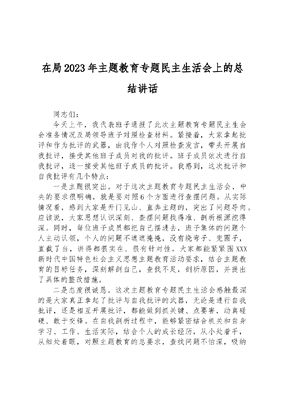在局2023年主题教育专题民主生活会上的总结讲话同志们:今天上午,我代表班子通报了此次主题教育专题民主生会会准备情况及局领导班子对照检查材料。紧接着,大家拿起批评和作为批评的武器,由我作个人对照检查发言,带头开展自我批评,接受其他班子成员对我的批评。班子成员依次进行自我批评,逐一接受其他班子成员的批评。我感到,这次批评和自我批评有几个特点:一是主题很突出。对于这次主题教育专题民主生活会,中央的要求很明确,就是要对照6个方面进行查摆问题。从实际情况看,感到大家是开门见山、直奔主题的,突出了问题导向。应该说,大家思想认识深刻、查摆问题找得准、剖析根源挖得深。同时,每位班子成员都把自己摆进去,班子集体的问题个人主动认领,个人的问题不遮遮掩掩,没有绕弯子、兜圈子,直截了当,讲得都很实在、很有针对性。大家都能紧紧围XXX新时代中国特色社会主义思想主题教育活动要求,结合主题教育的目标任务,深刻解剖自己,查找不足,剖析原因,并提出了具体的整改措施。二是态度很诚恳。这次主题教育专题民主生活会感触最深的是大家真正拿起了批评与自我批评的武器,无论是进行自我批评,还是相互开展批评,都能做到抓关键、点要害,动真碰硬、敢于交锋。在自我剖析过程中,能够紧密结合机关和自身学习、工作、生活实际,结合个人的成长经历,从小处着手,从细处着眼,对照主题教育的总要求,查找问题不怕深,吸纳意见不怕刺,亮出问题不怕丑,触及思想不怕痛,敢于拿自己开刀,表现出了很强的党性观念和大局意识,讲得很实在、很中肯,真正做到见人见事见思想。在自我批评的基础上,大家逐一进行了相互批评,从党性强不强、工作实不实、要求严不严等方面指出对方存在的问题和不足,不涂脂抹粉,不拐弯抹角,不虚晃一枪,直截了当、一针见血,与人为善、坦诚相见。我感到,这样的批评与自我批评才能够触及思想,达到团结-批评-团结的目的。这次主题教育专题民主生活会后,希望每位同志都能够从其他同志的自我批评中受到启发,对其他同志提出的批评意见进行认真思考和深入分析,并进一步修改好班子和个人的对照检查材料。三是整改措施很实在。大家在分析问题的基础上针对靶子,有的放矢,列出了若干整改措施,思路清晰、具体实在,针对性强,这些都体现了自我提高、自我完善的决心,体现了从我做起、真整实改的态度,为下一步抓好整改落实奠定了坚实基础。总的来看,这次主题教育专题民主生活会认真贯彻了党中央和省市委的要求,充满了团结、紧张、严肃、活泼的政治气氛,体现了敢于动真碰硬、主动揭短亮丑的整风精神,体现了诚恳帮助同志、自觉维护团结的政治自觉,会议氛围和效果都比较好,是近年来高质量的一次领导班子民主生活会,必将对今后卫生计生的改革发展和党的建设以及领导班子建设产生积极影响。今后工作中我局将继续在推进整改落实上下功夫。以此次主题教育为契机,认真落实XXX讲话精神,牢固树立作风建设永远在路上的思想,不懈怠、不松劲,在前面工作的基础上继续抓好专项整治,对已经整改的要巩固成果,防止反弹,正在整改的要加大力度,抓好落实,尚未整改的要尽快整改,落实到位,坚决不留空档,不留空白,不留死角,确保实践目标兑现承诺,务求群众满意的效果。要在建立健全科学管用的制度体系上下功夫。这次主题教育,为全局发展以及干部队伍的建设积累了很多好的经验和好的做法,要进一步研究规律,把成功做法经验化,零星探索系统化,有效措施制度化,对已有的制度要根据新的情况不断健全和完善。要发扬改革精神,树立法治思维,把上级要求、群众企盼、实际需要、新鲜的经验有机结合起来,加大制度创新力度,形成系统完备的制度体系,注重铲除不良的作风,实现活动的常态化。要在推进党的作风建设,形成改进作风新常态上下功夫。我们要认真学习贯彻XXXXXX系列讲话精神,切实负起党委抓党建的主体责任、党委书记抓党建的一把手责任,把思想作风建设作为长期任务扛在肩上,抓在手中,积极引导党员干部强化人民的角色定位,自觉增强群众意识和群众观念,密切党和群众的血肉联系。把实践好、维护好、发展好最广大人民群众的利益为出发点和落脚点,自觉弘扬和实践理论联系实际,密切联系群众,批评与自我批评的优良作风。
