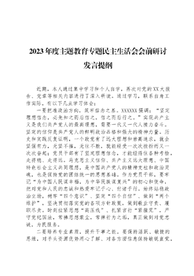 2023年度主题教育专题民主生活会会前研讨发言提纲近期,本人通过集中学习和个人自学,再次对党的XX大报告、党章等相关内容进行了深入研读。通过学习,联系自身工作实际,有以下几点学习体会:一要把准政治方向,筑牢信念之基。XXXXXX强调:坚定理想信念,必先知之而后信之,信之而后行之。实现共产主义是我们共产党人的最高理想,需要一代又一代人接力奋斗。坚定的信仰是共产党人的鲜明政治品格和强大的精神力量。历史和实践反复证明,一个政党有了远大理想和崇高追求,就会坚强有力,无坚不摧,无往不胜,就能经受一次次挫折而又一次次奋起;党员干部有了坚定理想信念,才能经得住各种考验,走得稳、走得远。马克思主义信仰、共产主义远大理想、中国特色社会主义共同理想,是中国共产党人的精神支柱和政治灵魂,也是保持党的团结统一的思想基础。作为党员干部,要牢记为中国人民谋幸福,为中华民族谋复兴的初心和使命,把对党和人民的忠诚和热爱牢记于心、付诸于行。始终站稳政治立场,树牢四个意识、坚定四个自信、做到两个维护,坚决贯彻落实党的各项方针政策,做到敬业守责、履职尽责。时刻拉紧思想高压线、扎紧言行紧箍咒,严守党纪国法,常拂思想蒙尘,常掸行为之垢,真正做到对党忠诚,为民服务。二要培养专业素质,提升干事之能。要保持活跃、敏捷的思维,对手头资源优势用心了解、对各方面信息保持敏锐直觉,学会用发展的、联系的、辩证的观点去分析和研究问题,培养自己看海平面桅杆的本领,对潜在风险科学预判,对看得清苗头的趋势分析透彻,对到来的机遇及时捕捉,不断增强工作的主动性、预见性。要学会创造性落实,坚持从实际问题出发,透彻了解事情发展的时和势,准确把握政策出台的时和机,对是什么、为什么、怎么样做到熟知、全知、深知,在这个基础上根据实际情况制定正确的战略战术,找到问题的难点症结,精准出台方案,精准推动落实。要增强收放自如、进退裕如的意识和锻炼,注重把握一个度字,精准拿捏收和放的关系,从容娴熟切换施策重点,该收的时候收得住、收得迅速,该放的时候放得开、放得有序,做到及时有力、恰到好处,避免矫枉过正、过犹不及,避免进退失据、宽严皆误。三要加强作风建设,树立廉政之风。XXXXXX在党的XX大报告中强调,全面建设社会主义现代化国家,必须有一支政治过硬、适应新时代要求、具备领导现代化建设能力的干部队伍。逆水行舟用力撑,一篙松劲退千寻。作风建设恰如逆水行舟,一篙不可放缓,放缓则退。作风建设是全面从严治党的压舱石,是锻造过硬干部队伍的大熔炉,是加快改革发展的助推器。己不正,焉能正人。党员干部的作风关系着党的形象,是联系党干群关系的牵引带,是引领人心向背的风向标。很多干部特别是年轻干部都是出了校门直接进入机关,往往不缺学历缺阅历、不缺学识缺见识,必须有计划地把这些干部安排到艰苦复杂地方和吃劲岗位磨练,帮助他们补上成长成才的关键一课。作为党员干部,要始终牢记国之大者,善于从政治上把握和思考问题,积极将自身工作融入国家事业发展大局,紧盯战略、乡村振兴、项目建设等重点任务,研究制定更加务实有效的推进举措,确保党中央决策部署在不折不扣落到实处。要持续加强理论学习,坚持读原著学原文悟原理,学深悟透XXX新时代中国特色社会主义思想,善于从中找思路、寻答案、受启迪,不断提高政治判断力、政治领悟力、政治执行力。要结合正在开展的主题教育活动,深入开展检视剖析,围绕学习贯彻XXXXXX重要讲话和指示批示精神,结合本行业领域、本单位系统实际,经常看一看思想认识是不是到位了,素质本领是不是跟上了,落地落实是不是见效了,真正搞清楚差距在哪里、下一步工作的重点是什么,自觉加强思想能力作风锤炼,切实以一域之光为全局添彩。