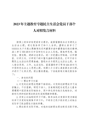 2023年主题教育专题民主生活会党员干部个人对照发言材料按照上级和学校党委有关要求,我紧紧围绕本次专题民主生活会主题,通过集体学习和个人自学,重新认真学习了XXXXXX关于开展主题教育的系列重要讲话和重要指示批示精神、深入学习XXX新时代中国特色社会主义思想,聚焦学思想、强党性、重实践、建新功总要求,进一步把握以学铸魂、以学增智、以学正风、以学促干的丰富内涵和实践要求,打牢开好专题民主生活会的思想基础。围绕本次专题民主生活会主题,本人结合思想、工作、生活实际,紧紧围绕学习贯彻XXX新时代中国特色社会主义思想主题,对照六个方面认真查摆自身问题,并进行了认真反思,提出整改措施。下面我将有关情况报告如下:一、存在的问题(一)理论学习方面1.对党的创新理论理解不够深刻。对党的创新理论学习浅尝辄止,不求甚解,研究不深入,没有做到把马克思主义基本原理同中国具体实际相结合、同中华优秀传统文化相结合,对新时代党的创新理论的没有深刻理解和掌握。2.自觉主动抽时间学习不够。除参加机关党委和党支部组织学习及党校短期集中学习外,平时自己很少能自觉主动抽出实际学习政治理论方面的书籍。3.理论联系实际不够。对党的创新理论理论联系实际不够,学用脱节,运用理论指导实践的意识不强,不善于结合新的实践不断推进理论创新、用新的理论指导新的实践,未能做到用党的创新理论最新成果武装头脑、指导实践、推动工作,没有充分把理论和实践紧密联系起来。(二)政治素质方面1.理论学习不深不透。对党的创新理论跟进学习不够,没有全面系统掌握精神实质、核心要义,只是按要求进行学习通读,没有真正做到学懂弄通。2.政治执行力不够迅速。政治信念树得不牢,在坚定拥护两个确立、强化四个意识、做到两个维护上,表率作用不够突出,如,在贯彻上级部署上还存在工作慢半拍、跟不紧的现象,没有带动队伍政策理论水平的整体提高。对党的思想路线、方针政策的贯彻执行,缺乏应有的政治敏锐性和洞察力,不具有一种时不我待的使命感和危机感。(三)能力本领方面1.统筹谋划推进工作的能力有待提升。对新时代教育方面发展的研究和思考不够,眼界不开阔,前瞻性、战略性、长期性的研究思考还不够深入。对上级出台的各项政策措施研究谋划不够,没有主动创新工作理念和方法,创造性地开展工作方面还有待改进。2.创新能力不够强。看待具体工作习惯使用书本,不善于与实际工作相结合,存在经验主义、存在凭经验、吃老本的现象,有教条主义倾向,做事缩手缩脚,敢试敢闯、求新求变的意识不够强。(四)担当作为方面1.勇于担当作为作为的积极性不够强。随着参加工作的时间增加和工作环境变化,勇于担当作为、干事创业、奋发有为、锐意进取的劲头和积极性不够强,扛旗争先、奋力赶超的精气神不足,承担风险和责任的胆识、勇气不足,缺乏攻坚克难和敢教日月换新天的敬业精神。2.干事创业精气神不足,在推进工作中有时候碰到难题,有绕道走,当甩手掌柜的想法。党员的先锋模范带头作用没有充分发挥,没能用党员的标准要求自己,在履行党员的责任和义务方面,坚定理想信念,尽职尽责为民办实事方面做得还不够。(五)工作作风方面1.创新进取意识不够强,满足于现有的成绩,固守原有的做法,没有开拓创新地开展工作。2.实际调查研究不够深。实地进行的调查研究比较少,导致工作的针对性和实效性不强。(六)廉洁自律方面1.党风廉政教育不够经常。虽然能在工作中做到廉洁自律,但对于党风廉政教育教育学习不够,主要是依靠中心党支部、党小组集体学习,自主学习较少且浮于表面,真正投入学习的时间、精力不够,存在学好不如干好的错误认知,致使党风廉洁教育不够经常,学习不够深刻。2.表率作用发挥的还不够。有时潜意识认为自己受党教育多年,组织纪律观念较强,有一定的政治觉悟,只要工作生活中坚守党纪国法和道德底线就合格了,缺乏站在表率和模范的高度去自觉进一步提升自我。二、原因剖析针对上述问题,我认真开展党性分析,从思想根源上进行深刻反省和剖析,归纳起来主要表现在以下几个方面。(一)理论学习认识不足。对理论学习的重要性认识不够,尤其是对XXX新时代中国特色社会主义思想的学习紧迫感不强,新理论新精神的学习经常受各种事务性工作影响,导致新理论学习不透彻,掌握不全面,应用不够准确。集体组织学习多,个人自学少,对新理论新政策的学习抓得不紧不实、掌握不多,导致自身理论水平跟不时代和工作的要求。(二)理想信念不够坚定。作为一名党员干部,能够坚定拥护两个确立,树牢四个意识,坚决做到两个维护,认真贯彻执行党中央的各项方针政策,在大是大非面前头脑清醒,旗帜鲜明,立场坚定,但在一些具体事情上自我要求还不够高。面对新形势新变化,没有持续不断地加强政治理论、道德情操、思想文化和专业知识等修养充电,放松了对党性锻炼的要求和保持党员先进性纯洁性的追求,