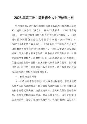 2023年第二批主题教育个人对照检查材料学习贯彻XXX新时代中国特色社会主义思想主题教育开展以来,通过认真学习《党章》、党的XX大报告、《XXX著作选读》、《XXX新时代中国特色社会主义思想专题摘编》、《XXX新时代中国特色社会主义思想学习纲要(2023年版)》、XXXXXX《论党的自我革命》、《XXX新时代中国特色社会主义思想的世界观和方法论专题摘编》、《XXX关于调查研究论述摘编》等文件指示和规章制度,联系自身思想实际反思,对照规章制度要求检查,总的感到,自己在思想道德上严格要求,在遵纪廉政上能够自律,在履行岗位职责上认真负责。但同时也感到,自己的一些思想和行为与新形势、新任务要求还有较大差距现就对照检查情况汇报如下。一、存在的突出问题(一)政治理论学习不足,理论联系实际不足。思想先进是其他各方面先进的根基,保持思想先进的关键在于用与时俱进的科学理论武装头脑。加强理论学习,是共产党员加强理论修养、永葆先进性的内在要求。但在具体工作中,因为受到实用主义的影响,忽略了理论知识的学习,认为只根据自己的工作经验就能完成好工作,陷入了经验主义之中。有限的理论学习又没有与具体实践相结合,无法与时俱进。(二)在落实从严治党管党责任方面有差距。党总支是管党治党的主体,作为组织委员、纪检组长,自己能够尽力完成党组织交给的各项任务;但是在工作主动性上还不够,有依靠书记的指示安排去工作的等、靠、要思想;也存在着在廉政监督方面制度建设不完善、有盲点不到位的情况。(三)在工作全面推进方面有差距。工作经验不足,没有用心去发掘新方法,以至于老办法不顶用,新办法不会用,进取精神不足,创新能力不够。有时对于工作中要求高、时间紧的任务,因为压力较大,一心想着如何能尽快完成,结果导致精益不求精。工作中与同事交流沟通不够,忽略了班子团结作用。(四)自身修养不足,保持和发挥党员的模范作用不够。有时自己状态调整不佳,有急躁情绪,导致在与人沟通交流方面存在一定缺陷,某种程度上阻碍了工作的高效有序开展。在日常工作和生活中有时把自己混同于一般群众,降低了对自己的要求和标准。满足于过得去、差不多,对时时处处保持共产党员先进性这根弦绷的不紧。二、主要原因反思剖析对照学习贯彻XXX新时代中国特色社会主义思想主题教育要求,剖析以上问题产生的原因,尽管有工作忙、任务重、社会大环境影响等客观方面的原因,但从根源上讲还是自己的主观世界出了问题。主要有以下方面。(一)放松了严格的政治理论学习。在强化学习、坚定信念、运用科学理论指导推动工作方面,主观上是重视的。但由于工学矛盾处理的不好,常把工作当成硬任务,学习变成软任务,自觉不自觉地放松了政治理论学习,政治理论系统学习不够、深入思考不够,学习满足于读一读、看一看。缺乏学习新理论、新知识的强烈愿望,运用理论知识指导工作实践的能力不够强。(二)放松了严格的党性修养锻炼。一个深层次的原因,就是近些年来在严格党性锻炼上所下的力气不够,为人民服务宗旨观和艰苦奋斗精神有所淡薄。个人主观上认为自己的工作和群众联系不够紧密,群众路线坚持得不够好。虽然有走近贴近群众、联系服务群众的想法,但由于忙于日常工作、事务缠身,深入基层、联系群众不够,与基层沟通交流不够,与普通群众接触交流较少,对基层情况、群众需求了解不够。(三)放松了严格的主观世界改造。随着外界环境影响,认为工作、事务缠身,学习理论的劲头没兴趣,解决实际问题的时间少了,精神状态和进取心也差了;以致缺乏创造性开展工作,在解放思想,更新观念,创新工作方法和手段方面不积极不主动,被动应付。深入剖析这种思想,还是考虑个人的利益多了一些,考虑群众的利益少了一些。三、今后努力方向(一)进一步深入学习讨论。充分认识腐败问题的严重性和危害性,自觉把思想和行动统一到省市县委决策部署上来。通过深入学习讨论,系统理解把握党的XX大精神,以及XXXXXX重要讲话精神,始终保持思想、政治上的清醒和坚定,思想和行动统一;通过学习不断提高政治业务素质,努力加强党性锻炼,切实提高政治素养,树立起正确的世界观、人生观、价值观和科学的政绩观、地位观和利益观;要坚持学用结合、学以致用,切实用先进的理论指导工作实践,把学习成果转化为指导实践、推动工作的实际成效。(二)进一步改进工作作风。密切联系群众,以满足群众需求为工作落脚点,针对工作中的薄弱环节和突出问题,切实采取改进工作、完善机制等措施,不断提升工作水平,牢固树立群众观点,忠实执行党的群众路线,以解决思想工作中的实际问题为出发点,以改进自身工作作风、提高工作成效为落脚点,深入基层深入群众,听取群众意见建议,主动联系服务群众,虚心接受群众批评。(三)进一步发挥模范带头作用。带头遵守党纪国法,始终与党中央保持高度一致,带头反对四风,厉行节约、反对浪费,带头廉洁自律、弘扬正气,