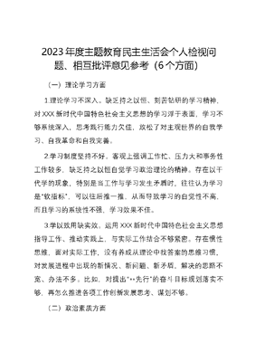 2023年度主题教育民主生活会个人检视问题、相互批评意见参考(6个方面)(一)理论学习方面1.理论学习不深入。缺乏持之以恒、刻苦钻研的学习精神,对XXX新时代中国特色社会主义思想的学习浮于表面,学习不够系统深入,思考践行能力欠佳,放松了对主观世界的自我学习、自我革命和自我完善。2.学习制度坚持不好。客观上强调工作忙、压力大和事务性工作较多,缺乏持之以恒自觉学习政治理论的精神。存在以干代学的现象,特别是当工作与学习发生矛盾时,往往认为学习是软指标,可以往后推一推,从而导致学习的自觉性不高,而且学习的系统性不强,学习效果不佳。3.学以致用缺实效。运用XXX新时代中国特色社会主义思想指导工作、推动实践上,与实际工作结合不够紧密。存在惯性思维,面对实际工作,没有养成从理论中找答案的思维习惯,对发展进程中出现的新情况、新问题、新矛盾,解决的思路不宽、办法不多。比如,对提出**先行的奋斗目标规划落实不够,再怎么推进各项工作创新发展思考、谋划不够。(二)政治素质方面1.政治敏锐性不强。能够把准政治方向、站稳政治立场、保持政治定力,坚定地跟党走,但在实际工作中,局限于个人能力和工作环境从政治和全局的角度来观察分析问题的能力和方法有所欠缺,对事物本质缺乏深入的认识,有时候看事情带有盲目性。比如,看待一些社会现象时,也只是看的时候愤慨激动,看完后也就一忘了之,没有一种切肤之痛的感觉,总认为这些事不发生在自己身边,从心里抵制即可。2.党性锤炼有待提高。作为一名党员领导干部,能够在思想上政治上行动上自觉以XXX同志为核心的党中央保持高度一致,在大是大非面前立场坚定、态度坚决,但政治敏锐性和鉴别力还是不强。对某些不当言论的错误原理没有做过深入分析和思考,对其可能会造成的负面影响缺乏长远的判断。对意识形态特别是网络意识形态的一些消极议论或调侃所产生的负面影响认识不足、抵制不力,不善于从政治上分析情况、思考问题、作出判断。3.执行标准不严。对党的政治纪律和政治规矩认识不到位、理解不深刻,在日常工作中政治敏锐性差,手握戒尺不紧、执行标准不严。有时担心影响同志们的团结,怕得罪人,说话绕弯子,不敢直面指出问题并予以指导指正。比如,有时对上级的部署认识不深、理解不透,思想认识上出现偏差,主观能动性不够,使得工作在贯彻落实上走了样,职责履行落实不到位。(三)能力本领方面1.创新意识还需进一步加强。日常工作有时满足于按部就班落实上级要求,勇于破除自我设限,破除惯性思维,勇于斗争改变做得还不够到位。对重点改革领域和难点工作前瞻性研究谋划还不够深入,不够适应新形势新任务新要求。2.攻坚克难的勇气不足。往往从分管领域、推进效果出发,强调有利于自身工作开展的内容,存在避重就轻的情况。对新常态下如何更好地开展工作,主动研究的不多,方式方法存在欠缺,影响了工作开展的效果,没有形成一级做给一级看、一级带着一级干的生动局面。3.工作推进的标准不高。满足于已有成绩,缺乏对标赶超的争先意识和敢为天下先的创新精神。习惯于等上级的指示、安排,工作缺乏主动性、预见性。对重点工作落实方面,强调重点事项得多,在细节问题上考虑得少、对落实效果过问得少。对任务进度的跟进,持续关注不够,工作指导和督促不深入,重点工作的推进还达不到理想进度,工作缺乏长远谋划,有只顾眼前、忽视长远的倾向。(四)担当作为方面1.党员干部作用发挥不够。在如何激励干部担当作为和整治干部不担当不作为上思考不深,管理相对不够严格。单位中干部不担当、不作为的事情仍有发生,有难度的不想干,有风险的不敢干,没先例的不愿干现象和怕出事、怕问责、怕追责的问题还没有从根本上得到解决。2.干工作安于现状,激情不高。随着年龄的增长,积极向上、锐意拼搏的工作热情有所减退,工作主动性和创造性随之淡化,有时习惯于用老办法解决新问题,用老经验解决新矛盾,大胆探索的方式方法比较少,理论知识还有所欠缺。有时习惯于等,等工作部署,等上级推动,紧迫感、压力感和忧患意识不强,超前意识不够强。3.主动担当进取的劲头不足。面对新形势和新任务,总觉得要以稳定发展为主,稳字当头,放不开手脚,留余地、留空间,工作中遇到难题还存在等靠思想,在遇到工作时间紧、任务重时,只想尽快完成,会放松要求,降低标准,没有把工作做实、做深、做细,特别是面对一些政策把握不准、规定不明确的事情,有时明知道会影响工作进度,也采取多一事不如少一事的态度,存在宁愿少出成绩也不能出问题的思想。(五)工作作风方面1.调研针对性不强。近两年以来,由于自己在机关单位工作了,交往的圈子多是机关单位人员,在机关工作时间长,走进基层深入群众调查研究少、了解实情不全面,从根本上缺乏密切联系群众的思想自觉,缺乏热情服务群众的行动自觉,未能真正沉下身子接地气。比如,对于一些严重制约工作开展的