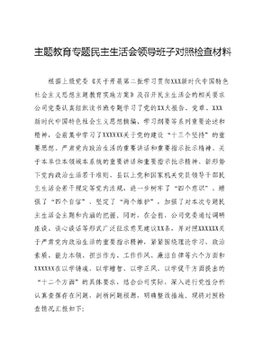 主题教育专题民主生活会领导班子对照检查材料根据上级党委《关于开展第二批学习贯彻XXX新时代中国特色社会主义思想主题教育实施方案》及召开民主生活会的相关要求公司党委认真组织读书班专题学习了党的XX大报告、党章、XXX新时代中国特色社会主义思想摘编、学习纲要等系列重要论述和精神,会前集中学习了XXXXXX关于党的建设十三个坚持的重要思想、严肃党内政治生活的重要讲话和重要指示批示精神、关于本单位本领域本系统的重要讲话和重要指示批示精神、新形势下党内政治生活若干准则、县以上党和国家机关党员领导干部民主生活会若干规定等党内法规,进一步树牢了四个意识、增强了四个自信、坚定了两个维护,加强了对本次专题民主生活会主题和内涵的把握。同时,在会前,公司党委通过调研座谈、谈心谈话等形式广泛征求意见建议XX条,并对照XXXXXX关于严肃党内政治生活的重要指示精神,紧紧围绕理论学习、政治素质、能力本领、担当作为、工作作风、廉洁自律等六个方面和XXXXXX在以学铸魂、以学增智、以学正风、以学促干方面提出的十二个方面的具体要求,结合公司实际,深入进行党性分析认真查摆存在问题,剖析问题根源,明确整改措施。现将对照检查情况汇报如下:一、上年度民主生活会查摆问题整改情况2022年度民主生活会,公司党委班子查摆、征集的问题6个方面12项,公司党委聚焦短板弱项,逐项分析梳理,深刻查摆问题根源,逐项制定整改措施共计18项,坚持立行立改与长期坚持相结合,目前问题已整改完成11项,其他3项需长期坚持、持续整改提升。一是旗帜鲜明讲政治铸忠诚。坚持党的领导,加强党的建设,扎实推进主题教育党建基础持续夯实,根魂优势更加凸显。下一步继续开展主题教育,及时跟进学习XXXXXX系列重要讲话和重要指示批示精神、学习党的XX大精神,在学思践悟中坚定理想信念,用XXX新时代中国特色社会主义思想和创新理论持续凝心铸魂,强化理论武装,指导生产经营实践。二是进一步深化干部和人才队伍建设。公司干部人才队伍持续优化,薪酬激励机制不断强化,但是中层骨干、市场开发、新兴领域、科技领军专业人才储备不足,需要继续坚持外部引才和内部培养双管齐下,加大外部引进高端人才力度的同时,不断完善内部员工职业发展通道。三是全力以赴推进高质量发展。在聚焦主责主业的同时,全力开拓新基建、新能源城市新发展业务,还继续强化担当精神和责任意识,深入贯彻落实集团整体发展战略和新发展理念,加大属地经营力度,加强公司化建设,大力发展绿色低碳智慧能源、智慧城市及大数据等新兴业务,加快构建新发展格局。二、主题教育情况总结及专题民主生活会会前准备情况党委领导班子组织开展主题教育情况及会前专题中心组学习开展谈心谈话、全面梳理问题等内容。根据第二批主题教育总体安排和要求,坚持以XXX新时代中国特色社会主义思想凝心铸魂、锤炼党性,以担当作为、实干实绩推动高质量发展,确保主题教育在全公司有力有序推进、收到实实在在效果。一是精心谋划,全面动员部署。公司及时成立组织领导机构,明确党委一把手统筹抓、分管领导主要抓、综合管理部落实的机制;制定实施方案和重点任务推进计划,召开动员部署会,宣贯主题教育总体要求、根本任务、具体目标及具体安排。二是强化学习,做到学深悟透。按照计划,举办了公司领导班子专题读书班8期,结合党委中心组学习、上级专题讲座,坚持集中学习、自学、研讨、实地研学想结合,认真研读了党的XX大报告、党章、《XXX著作选读》《XXX新时代中国特色社会主义思想专题摘编》《XXX新时代中国特色社会主义思想学习纲要》等书目。在公司公众号开辟专栏,介绍主题教育相关知识和典型案例,持续营造浓厚的主题教育氛围。基层党支部也制定了学习计划,以三会一课、主题党日等形式组织党员深入学习研讨。在学习过程中,邀请上级领导到公司讲授了专题党课,根据领导班子成员专题党课计划,党委书记为公司全体党员讲授了辅导党课,班子成员分别到所在党建联系点讲授了专题党课××次。组织公司党员赴纪念馆进行实地研学,锤炼党性修养,感悟精神伟力,推动主题教育在班子成员入脑入心、见行见效。三是大兴调查研究,全力破难题促发展。领导班子成员结合公司实际及岗位职责、分管业务特点,分别选取了与公司发展、工程实施紧密相关的课题,深入党建联系点专题调研,形成调研报告××篇,召开调研成果交流会,形成成果转化清单,切实把调研成果转化为改进工作、推动发展的实际举措。四是深入开展谈心交心,广泛听取意见建议。认真落实四必谈要求,普遍开展谈心谈话,做到主要负责同志与班子成员,班子成员之间,班子成员与分管部门及包保联系单位主要负责同志,班子成员与本人组织关系所在党支部党员代表谈心谈话,沟通思想、交换意见,把问题谈透把思想谈通、把改进方向谈明白。谈心谈话一对一、面对面,既谈工作问题,也谈思想问题