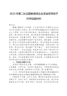2023年第二批主题教育民主生活会领导班子对照检查材料同志们:根据主题教育工作部署,今日我们举行了专题民主生活会本次会议的核心议题为:深入学习贯彻XXX新时代中国特色社会主义思想,专注于提升理论素养、强化党性修养、重视实践经验、建立新的工作业绩。我们将紧密对照加强思想建设、锤炼忠诚品格、积极履行职责、服务人民福祉、保持廉洁作风等关键目标,全面理解和实施学习培养思想、增长智慧、正风肃纪、促进工作的深刻内涵和实践要求。通过开展批评与自我批评,我们旨在审视问题并采取有效整改措施,共同形成统一的思想、意志和行动,坚决拥护两个确立、坚定不移地实现两个维护。在会议前期,党委班子深入进行了理论学习和坦诚交流,以直面问题的勇气和自我革新的决心,认真查找和分析问题,深刻剖析问题的根源,并明确了整改措施及努力方向。现在,我代表党委班子进行自我检视,并诚挚邀请各位领导和同志提出宝贵意见和建议。一、存在的问题与不足党委班子紧扣会议主题,对照XXXXXX关于以学铸魂、以学增智、以学正风、以学促干重要论述,对照党章党规党纪,对标对表工作部署,紧密联系工作实际,深入查摆问题。(一)《中共中央关于在全党深入开展学习贯彻XXX新时代中国特色社会主义思想主题教育的意见》明确的6个方面1.理论学习方面。我们认识到,理论学习的深度尚未达到预期水平。在深入学习、细致研究和深刻思考方面,我们还未能做到充分和平衡。将学习视作一种态度、责任和追求的自觉性需要进一步加强,学习的系统性和全面性仍有提升空间。此外,理论指导实践的能力有待增强。我们在世界观、人生观、价值观的纯粹性方面与党员领导干部的标准还存在差距。学以致用、学用结合的实际效果尚显不足,将理论转化为实际工作方法、思想转化为具体工作思路的能力仍有待提升。。2.政治素质方面。提高政治敏感性、政治能力和政治定力仍然是我们工作的重要任务。在政治上存在自由主义的现象,这一点需要得到纠正。将坚定政治立场内化为党员干部的基本准则,外化为敬业与负责的行为准则,党性锻炼的强化还需进一步加强。在结合工作实际进行自我反省时,我们需在培育理想信念、提升思想境界、净化思想认识方面进一步加大努力。目前,我们在政治意识、政治能力和政治定力方面仍存在不足。意识形态工作的责任制需要更加日常化、常态化和深入人心的实施。3.能力本领方面。在事业发展面临的新情况、新问题和新挑战中,我们部分地存在着惯性思维和僵化观念,习惯于用传统方法解决新出现的问题。将提高干事创业能力视为政治责任、人生追求和自我提升的过程,我们认识到在这方面还有待加强。对于各种斗争的长期性、复杂性和艰巨性,我们的理解还停留在初级阶段。对于教育引导全单位具备政治警觉性、战略定力和审慎应对的能力,我们还需进一步提升。在保持如履薄冰的谨慎和见微知著的敏锐度方面,我们还有所欠缺。4.担当作为方面。主动发起斗争的精神尚未充分体现,斗争能力仍需加强。在某种程度上,老好人思维模式、对异常事态的漠视以及事不关己的态度还存在。面临发展道路上的矛盾和挑战时,我们在担当作为的勇气、攻坚克难的毅力以及创新变革的勇气方面还有所不足。在敢于冒险尝试、勇于实践创新方面,我们的努力还不够充分。争先创优的意识还不够强烈,有时会以基础薄弱、起点低作为工作落后的借口,存在着不求有功、但求无过的心态。为了争取一流成绩、勇于扛起重任的决心和勇气,我们需要持续加强和提升。5.工作作风方面。宗旨意识、为民情怀有待加强,在掌握群众所思所想所盼、身体力行攻坚克难指导、用心用情用力解决问题等方面仍有差距。落实上级决策部署照搬照抄、上下一般粗的现象,不同形式不同程度地存在。工作作风效能、服务意识还有所欠缺,缺乏躬身入局的自觉。调查研究工作还存在不深不透的现象。6.廉洁自律方面。内部巡察功效有待提升,两个责任落实存在时松时紧的现象。廉政建设压力传导不够,纪律规矩意识有待提升,在精益求精还有一定差距。对一体推进三不腐机制建设,还存在薄弱环节,对待四风隐形变异等新变化新表现,警惕性和鉴别力有待提升。对履行一岗双责重视程度不够,重业务轻党建的倾向一定程度存在。监督制约的笼子扎得还不够紧,对重点领域、重点环节、重点事项的监督还存在盲区和漏洞。(二)XXXXXX关于以学铸魂、以学增智、以学正风、以学促干的12条具体要求1.以学铸魂方面。在用XXX新时代中国特色社会主义思想转化我们的主观世界方面还有待加强。在全面理解这一重要思想的世界观、方法论及其核心立场、观点和方法方面,我们还存在明显的差距。为了坚定崇高的理想信念,构建共产党人的精神家园,我们需要持续并加大努力。我们的党性修养与党的事业要求、人民群众的期待之间还存在一定的差距。全心全意为民服务的宗旨需要进一步强化和深化。2.以学增智方面。加强政治能力的提升是当前的重要任务
