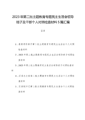 2023年第二批主题教育专题民主生活会领导班子及干部个人对照检查材料5篇汇编目录1.县委领导班子第二批主题教育专题民主生活会个人对照检查材料2.2023年第二批主题教育专题民主生活会领导班子对照检查材料3.2023年第二批主题教育民主生活会领导班子对照检查材料4.区委办主任第二批主题教育专题民主生活会个人对照检查材料5.区委副书记第二批主题教育专题民主生活会个人对照检查材料县委领导班子第二批主题教育专题民主生活会个人对照检查材料按照省市委关于开展2023年度专题民主生活会的统一安排部署,县委领导班子紧扣严、实、细的标准,系统、全面、深入地学习习近平新时代中国特色社会主义思想、XXXXXX系列重要讲话精神等。在此基础上,紧密结合思想、工作和生活实际,深入开展谈心谈话,广泛征求意见建议,聚焦六个方面的主题,查摆存在的问题,深刻剖析原因,制定整改措施,形成了对照检查材料。现作如下对照检查。一、存在的主要问题(-)理论学习方面。一是理论学习的标杆拉升不够。县委班子虽然能够按照上级的部署和要求循规蹈矩地遵守和执行,做到学习不断档、不掉线、不抛锚,但学习浅尝辄止、蜻蜓点水,沉浸在浅表化、简单化、笼统化的层面和维度,离学思践悟、学深悟透、学以致用还有一定的差距。对XXX新时代中国特色社会主义思想的重要内涵、核心要义掌握和理解不够透彻,在融会贯通、举一反三上差距很大。不善于从XXX新时代中国特色社会主义思想中汲取经验、找准路径、站稳立场,审时度势、寻找规律、突破创新方面还有一定的欠缺。二是理论联系实际的桥梁没有架好。县委领导班子能够按照上级的要求不折不扣地执行规定动作,但往往是照本宣科、照搬照抄学习不够深入,感悟不够通透,理解不够深刻,导致学用结合的链条没有焊紧,用科学理论指导实践出现断层和皱褶,没有把学习成果转化为调结构、转方式、换动能的具体措施和措施办法,还存在学用贴合不紧密的现象。(二)政治素质方面。一是缺乏坚如磐石的政治信仰全县班子成员,对信仰的认识淡薄,没有上升到一定的政治高度,缺乏信仰的引擎力和支撑力。对意识形态领域斗争的严峻性、复杂性和隐蔽性,认识不够精准,忧患意识不管控意识形态的阵地的能力有待于进一步提升,对网络舆情的及时应对和处置还不够专业。二是缺乏过硬可靠的政治素质。虽然自己能够不断提高政治站位、提升政治素养、强化服务效能。但对全县发展的总体布局和战略思想分析研判不足,缺乏高瞻远瞩的政治视角,从研究部署、分析研判、积极思考方面难以破题,贯通融合的力度和强度不大,需要保持政治定力,强化决策执行,提高思想觉悟,不断增强四个意识,坚定四个自信、做到两个维护。(三)担当作为方面。一是人民至上的理念树得不牢。总体而言,县委班子成员能力较强,素质较高,工作敬业,能够胜任全县的各项工作。但对一些重点工作的统筹办理、协调联动、跟踪问效存在短板和盲区,习惯于开会决策、办公室谋划,电话遥控指挥。有时把担子和压力下放到各个部门,主动担当、亲力亲为不够,后期的监督检查和跟踪问效存在形式主义。对于群众关心的难点和堵点,主动上心不够,履职担当不强,经常用开会议、打电话、发微信代替接地气的入户走访,致使搞好群众工作产生了隔膜效应,对居民群众的嘘寒问暖、关怀帮扶不够,需要把群众的心上事当成上心事来抓,用心用情用力解决群众的急难愁盼问题,民生福祉的改善不强。县委领导班子,能够高瞻远瞩、全盘定位,客观地认识到全县发展的潜力和优势,也能看到存在的短板和瓶颈,但对全县发展的走势分析研判、全盘统筹、权衡利弊的能力欠缺,就如何打破供需结构不平衡、产业结构不合理、创新能力不够强、责任落实不到位等瓶颈问题,主攻方向不明确、系统思维不开阔、创新举措不务实。在改善民生福祉中攻坚克难、在强化民生保障中突破创新、在破解瓶颈难题上攻坚冲刺的能力有待于进一步加强。(四)能力本领方面。一是统筹协调的能力不强。县委班子成员尽管能够尽心尽力做好各自分管的工作,做到事必躬亲、亲力亲为,但领导班子的带头模范作用发挥不强,没有充分挖掘自己的潜力和优势,强化精致、精细、精确的意识淡漠淡化,统揽全局、牵头抓总的能力欠缺,主动靠前协调、调动多方力量、回应群众关切方面,缺乏科学统筹的方法、驾轻就熟的能力、破解难题的动力,班子成员主心骨的作用发挥的不够,凝心聚力、争先进位、全盘统筹的责任担当需要进一步加强。二是攻坚克难的精神不足。县委班子成员能够提高政治站位、审时度势、凝心聚力,按照全县一线五支撑的发展战略和总体布局,全面推进经济发展、社会保障、民生服务等工作,但对全县经济发展缺乏一盘棋的统筹思想,面对一系列瓶颈难题,缺乏分析研判和深度思考,缺乏融会贯通和应变能力,缺乏大局意识和整体思维。比如:在抓好全县项目建设、扩大招商引资和破解民生难题方面,缺乏敢于亮剑争锋的精神