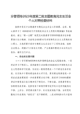 分管领导2023年度第二批主题教育民主生活会个人对照检查材料按照市委关于主题教育专题民主生活会工作部署,会前,我认真学习了《XXX新时代中国特色社会主义思想专题摘编》等权威教材,通过第一议题制度及时跟进学习XXXXXX最新讲话和重要指示批示精神,全面领会XXX新时代中国特色社会主义思想的核心要义,为高质量开展好专题民主生活会打下了思想基础。按照会议要求,现就6个方面有关问题、产生根源和整改方向向同志们报告,请同志们评议。一、存在的主要问题(一)学习贯彻XXX新时代中国特色社会主义思想方面。一是理论学习不够深入。虽然能够主动加强对XXX新时代中国特色社会主义思想的学习把握,但对这一重要思想是一个不断在传承中发展、在实践中丰富的理论体系认识不足,落实理论创新前进一步理论武装就要跟进一步的重要要求还不够,跟进学习XXXXXX最新讲话和重要指示批示精神还不够及时、不够全面,读原著学原文悟原理存在差距,发挥领导干部领学带学促学的示范作用做得还不够,上讲台、讲党课次数不多,针对性实效性不强,当好党的路线方针政策的宣传员还不够称职。二是对XXX新时代中国特色社会主义思想的世界观和方法论把握不够深刻。只满足于学著作、学讲话,在多思多想、学深悟透上做得不够,在一定程度上存在知其言不知其义、知其然不知其所以然的现象,对这一重要思想的科学体系、核心要义、实践要求理解不够透彻,坚持学以致用、知行合一不够深入,紧紧围绕新时代新征程党的中心工作运用马克思主义立场观点方法分析解决问题、推动事业发展还有提升空间。(二)维护党中央权威和集中统一领导方面。一是对党忠诚的政治品格淬炼不够。虽然能够认识到对党忠诚是共产党人首要的政治品质,是党在革命、建设、改革各个时期对党员一以贯之的要求,但对两个确立的决定性意义认识还不够充分,没有很好地把两个维护转化为做好工作的实际行动、体现到落实岗位职责的实效上。二是狠抓工作落实决心不够。随着年龄增长和资历的积累,自认为是老同志了,该让年轻同志去锻炼、去闯一闯,工作激情有所减退,脚踏实地、埋头苦干的韧劲不如以前没有做到以踏石留印、抓铁有痕的力度抓落实,一些年度工作目标完成效果不理想,一些工作被市政府通报批评。(三)践行宗旨、服务人民方面。一是践行一线工作法力度不够。虽然能够牢记XXXXXX走遍基层才能心里有数、才能心有灵犀一点通的谆谆教诲,但由于分管领域众多,平时忙于业务工作,实地深入群众、深入企业考察调研还不够经常,四下基层还需进一步深化,尤其是调查研究下基层还不够深入,一些调研习惯以召开座谈会、听汇报的方式开展,直接面向基层和消费者的调查研究还不经常、不深入,深入基层了解实情还不够多调研成果运用还存在不足,通过调研破解群众关心的急难愁盼问题做得还不够。二是服务群众主动性不够。工作中还存在眼睛向上的情况,更多考虑的是领导的想法和本部门的利益,没有真正做到把群众满不满意作为评价工作的根本标准。突出表现为在下基层察民情解民忧暖民心活动还不够深入,倾听群众呼声、反映群众愿望、关心群众疾苦做得还不够。(四)求真务实、狠抓落实方面。一是开拓创新意识不够强思想解放力度不够大,应对百年之大变局准确识变、科学应变、主动求变的意识、能力和应对不够足,不同程度存在本领恐慌能力危机。在创新发展上,主动谋划新方法、新举措、新思路不够多,部分工作仍按部就班,效果不够突出、特色不够亮、招数不够多、力度不够大。二是业务本领不够高。没有充分发挥主观能动性,思想观念因循守旧、工作墨守成规,不能跳出圈子看问题,面对新情况、新问题,不能以开拓的精神面对、分析和寻找解决问题的方法。工作中惯用老办法解决问题,怕出问题、不敢创新,在面对复杂问题时,思维不开阔,视野不开拓,不求有功、但求无过。(五)以身作则、廉洁自律方面。一是落实教育管理责任不到位。在对基层党员的管理上力度不够、办法不多,对个别同志存在的纪律规矩等方面苗头性倾向性问题以及偶尔犯错上,该提醒的没有提醒,该批评的没有批评,致使个别党员理想信念、党性观念和宗旨意识不牢,出现违法违纪行为。二是廉洁自律教育不够经常。履行一岗双责不够严实,不够到位,对干部思想道德教育的全面性、及时性、有效性有所欠缺,对那些日常工作和生活中不拘小节的思想行为,对于苗头性、倾向性问题,未能及时与干部谈心交心,摆现象、查事实、问根源、找原因,个别干部未能认清小事小节、小打小闹的危害性,清正廉洁的价值理念和政治操守尚未真正成为思想自觉和行动自觉,廉洁自律意识还有偏差。(六)履行全面从严治党政治任方面。一是全面从严治党主体责任落实有偏差。在推动分管部门履行党建责任方面还有不足在实际工作中,有时存在重业务轻党建的情况,没有很好地做到把业务工作与党建工作紧密结合起来。督促班子成员履行一岗双责力度不大,向