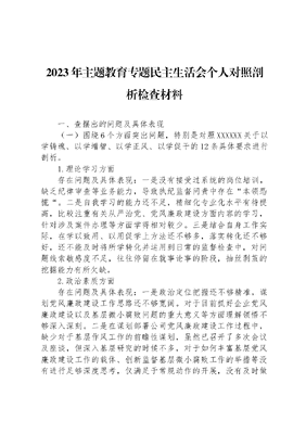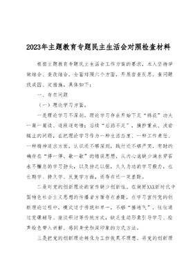 2023年主题教育专题民主生活会对照检查材料根据主题教育专题民主生活会工作方案的要求,本人坚持学做结合、查改结合,全面对照六个方面,开展自查反思,查问题找成因、定措施。具体如下:一、存在问题(一)理论学习方面。一是理论学习不深刻。理论学习存在开始下足绣花功夫一篇一篇读、逐段逐句悟;后续后劲不足,摘抄重点、浅尝辄止的问题,在把理论学习作为一种生活态度、一种工作责任、一种精神追求方面,认识还不够深刻,践行还不够严实,有时的确存在停一停、歇一歇的错误思想,从内心底缺少滴水穿石永不懈怠的学习劲头,以及持之以恒,久久为功的学习毅力,在长期学、持久学、反复学方面,还存在还一定差距。二是对党的创新理论的宣传缺少创新性。在做好XXX新时代中国特色社会主义思想的传播者方面存在差距,在学习宣传党的创新理论过程中,模式过于传统和单一,不够接地气,往往通过党课辅导、座谈研讨等传统方式,缺乏生动形象引导学习、绘声绘色带入讲解、感同身受加深印象的方式方法。三是把党的创新理论转化为工作效果不理想。将党的创新理论的学习过程,仅仅作为增强理论知识和理论素养的过程,未能将其作为训练思维方式、提升思维层次、增长工作本领的过程,灵活运用XXX新时代中国特色社会主义思想、发挥主观能动性的思维能力还有所欠缺。(二)政治素养方面。一是涵养政治素养的能力有待提高。汲取XXX新时代中国特色社会主义思想的政治营养不够到位,导致对政治素养的认知存在偏差,有时仅仅将其停留在政治忠诚、政治定力、政治担当的主观意识范畴,未能将其与一定的外在实践相联系,只做到了内化于心,而未能达到外化于行,使自己在把握方向、掌握全局辨别是非、掌控局面和防范风险的政治能力还有所欠缺。二是对干部的政治素质考察不够严实。对干部政治素质的隐蔽性和迷惑性认识不够深刻,平时功夫下得不到位,全方位、多角度、立体式了解干部存在短板和不足,缺少常了解的韧劲和蹲下去的精神。三是防范政治风险的责任扛得不牢。自己的政治洞察力、政治鉴别力存在短板,缺少从纷繁复杂相互交织的社会关系中抓住政治关系,从立体多面的社会现实中把握政治逻辑的政治能力,对容易诱发政治问题的敏感因素、苗头性倾向性问题,政治敏锐性不够高,统筹谋划的一些敏感性、前瞻性工作,以及推进落实的一些意识形态领域任务,没有做到见微知著、防患未然。(三)能力本领方面。一是锤炼政治能力存在成效还不够明显。对锤炼政治能力理解有偏差,主观认为政治能力偏虚偏空,在日常锤炼中找不到有效的抓手,因而逐渐放松了对政治能力的锤炼。面对当前各种思想文化激荡交锋,各种利益诉求交汇碰撞的大形势,自己作为领导干部,有时留恋舒适区,未能及时将其作为强化自身政治能力的有利时机。二是斗争本领养成持续用力不足。在新时代的重大挑战、重大风险、重大阻力、重大矛盾的伟大斗争中,自己有时缺少在复杂严峻的斗争中经风雨、见世面、壮筋骨的韧劲,以及凡事冲锋在第一线、战斗在最前沿的冲劲,不愿意当热锅上的蚂蚁,接烫手山芋。三是应对风险挑战的本领有待提高。对战略机遇与风险挑战并存的客观现状认识不够深刻,安全风险治理理论知识学习不够全面,底线思维与忧患意识不足,有时存在太平无事,马放南山的麻痹思想以及侥幸、逃避心理,还没有做好经受风高浪急甚至惊涛骇浪重大考验的准备。(四)担当作为方面。一是政绩观树立和践行得不够牢固。在思想深处上,还没有完全解决好树什么样的政绩、政绩为谁而树、怎样树政绩的问题有时统筹谋划工作,安排部署任务,还是存在干快活、好落实、造亮点、出政绩的思维偏差,一些工作并没有达到打基础、利长远、惠民生、得民心的目的和要求。二是支持干部担当作为不够严实。对个别分管干部碰到矛盾和难题绕道走,把自身责任往外推以及躺平心态等现象,自己缺少旗帜鲜明的态度和动真碰硬的决心,总想着通过春风化雨、润物无声的方式循循善诱,成效不够明显。三是斗争精神还需进一步加强。干事创业精气神不足,缺乏担责意识,缺乏斗争精神,遇事明哲保身,躺平不作为,不敢动真碰硬,不敢攻坚克难,存在思维惯性和路径依赖,瞻前顾后、畏首畏尾,上推下卸、推拖躲绕,奉行利己主义。(五)工作作风方面。一是工作态度与要求未能同步适应。面对新时代、新形势和新机遇,自己的思想观念调整和重塑的速度比较慢,对推进作风革命、效能革命的领导责任压得不实,一些干部慢进是退、不进更是退的使命感和紧迫感不强,速度意识和效率意识不足,导致推动工作高质量发展的动力不足。二是推进工作落实的举措不够科学有效。自己服务大局的支撑度不足,遇事先统筹的意识和能力不足,在推动工作落实的过程中,不善于将分管工作置于大局之中去把握和谋划,未能科学摆布好各方面关系,处理好优先顺序,发挥好各自优势,在凝聚合力推动工作落实方面,统筹性、协调性和时效性有所不足三是调