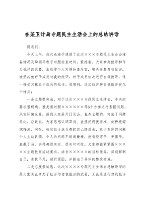 在某卫计局专题民主生活会上的总结讲话同志们:今天上午,我代表班子通报了此次×××专题民主生会会准备情况及局领导班子对照检查材料。紧接着,大家拿起批评和作为批评的武器,由我作个人对照检查发言,带头开展自我批评,接受其他班子成员对我的批评。班子成员依次进行自我批评,逐一接受其他班子成员的批评。我感到,这次批评和自我批评有几个特点:一是主题很突出。对于这次×××专题民主生活会,中央的要求很明确,就是要对照××××××等6个方面进行查摆问题。从实际情况看,感到大家是开门见山、直奔主题的,突出了问题导向。应该说,大家思想认识深刻、查摆问题找得准、剖析根源挖得深。同时,每位班子成员都把自己摆进去,班子集体的问题个人主动认领,个人的问题不遮遮掩掩,没有绕弯子、兜圈子,直截了当,讲得都很实在、很有针对性。大家都能紧紧围×××××主题教育活动要求,结合×××××的目标任务,深刻解剖自己,查找不足,剖析原因,并提出了具体的整改措施。二是态度很诚恳。这次××××专题民主生活会感触最深的是大家真正拿起了批评与自我批评的武器,无论是进行自我批评还是相互开展批评,都能做到抓关键、点要害,动真碰硬、敢于交锋。在自我剖析过程中,能够紧密结合机关和自身学习、工作生活实际,结合个人的成长经历,从小处着手,从细处着眼,对照××××的总要求,查找问题不怕深,吸纳意见不怕刺,亮出问题不怕丑,触及思想不怕痛,敢于拿自己开刀,表现出了很强的党性观念和大局意识,讲得很实在、很中肯,真正做到见人见事见思想。在自我批评的基础上,大家逐一进行了相互批评,从党性强不强、工作实不实、要求严不严等方面指出对方存在的问题和不足,不涂脂抹粉,不拐弯抹角,不虚晃一枪,直截了当、一针见血,与人为善、坦诚相见。我感到,这样的批评与自我批评才能够触及思想,达到团结-批评-团结的目的。这次××××专题民主生活会后,希望每位同志都能够从其他同志的自我批评中受到启发,对其他同志提出的批评意见进行认真思考和深入分析,并进一步修改好班子和个人的对照检查材料。三是整改措施很实在。大家在分析问题的基础上针对靶子,有的放矢,列出了若干整改措施,思路清晰、具体实在,针对性强,这些都体现了自我提高、自我完善的决心,体现了从我做起、真整实改的态度,为下一步抓好整改落实奠定了坚实基础。总的来看,这次×××专题民主生活会认真贯彻了党中央和省市委的要求,充满了团结、紧张、严肃、活泼的政治气氛,体现了敢于动真碰硬、主动揭短亮丑的整风精神,体现了诚恳帮助同志、自觉维护团结的政治自觉,会议氛围和效果都比较好,是近年来高质量的一次领导班子民主生活会,必将对今后卫生计生的改革发展和党的建设以及领导班子建设产生积极影响。今后工作中我局将继续在推进整改落实上下功夫。以此次主题教育为契机,认真落实XXX讲话精神,牢固树立作风建设永远在路上的思想不懈怠、不松劲,在前面工作的基础上继续抓好专项整治,对已经整改的要巩固成果,防止反弹,正在整改的要加大力度,抓好落实,尚未整改的要尽快整改,落实到位,坚决不留空档,不留空白,不留死角,确保实践目标兑现承诺,务求群众满意的效果二是要在建立健全科学管用的制度体系上下功夫。这次主题教育为全局发展以及干部队伍的建设积累了很多好的经验和好的做法要进一步研究规律,把成功做法经验化,零星探索系统化,有效措施制度化,对已有的制度要根据新的情况不断健全和完善。要发扬改革精神,树立法治思维,把上级要求、群众企盼、实际需要、新鲜的经验有机结合起来,加大制度创新力度,形成系统完备的制度体系,注重铲除不良的作风,实现活动的常态化。三是要在推进党的作风建设,形成改进作风新常态上下功夫。我们要认真学习贯彻XJPXXX系列讲话精神,切实负起党委抓党建的主体责任、党委书记抓党建的一把手责任,把思想作风建设作为长期任务扛在肩上,抓在手中,积极引导党员干部强化人民的角色定位,自觉增强群众意识和群众观念,密切党和群众的血肉联系。把实践好、维护好、发展好最广大人民群众的利益为出发点和落脚点,自觉弘扬和实践理论联系实际,密切联系群众,批评与自我批评的优良作风。