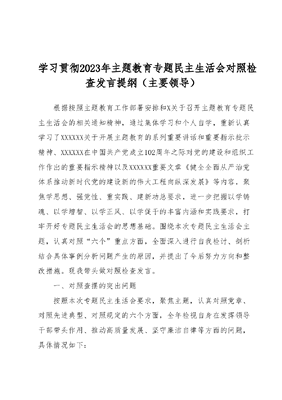 学习贯彻2023年主题教育专题民主生活会对照检查发言提纲(主要领导)根据按照主题教育工作部署安排和X关于召开主题教育专题民主生活会的相关通知精神,通过集体学习和个人自学,重新认真学习了XXXXXX关于开展主题教育的系列重要讲话和重要指示批示精神、XXXXXX在中国共产党成立102周年之际对党的建设和组织工作作出的重要指示精神以及XXXXXX重要文章《健全全面从严治党体系推动新时代党的建设新的伟大工程向纵深发展》等内容,聚焦学思想、强党性、重实践、建新功总要求,进一步把握以学铸魂、以学增智、以学正风、以学促干的丰富内涵和实践要求,打牢开好专题民主生活会的思想基础。围绕本次专题民主生活会主题,认真对照六个重点方面,全面深入进行自我检讨、剖析结合具体事例分析问题产生的原因,并提出了今后努力方向和整改措施。现我带头做对照检查发言。一、对照查摆的突出问题按照本次专题民主生活会要求,聚焦主题,认真对照党章、对照先进典型、对照规定的六个方面,全年检视自身在发挥领导干部带头作用、推动高质量发展、坚守廉洁自律等方面的问题,具体情况如下:(一)在理论学习方面。在主题教育中,认真落实第一议题制度,及时组织集中理论学习并带头抓好自学,通过扎实的理论学习,深刻领悟新思想的科学内涵、精神实质和核心要义,深刻认识两个确立的决定性意义和历史地位,深刻理解了新时代党的历史使命和奋斗目标,不断增强四个意识、坚定四个自信、做到两个维护,始终保持对党忠诚、对人民负责、对事业有为的赤诚心。经认真检视,该方面存在的问题主要有,一是理论武装的主动性不够,存在上热下冷的现象,没能真正做到全面动员、步调一致。抓实理论学习缺乏有效的手段,虽然制定了相关制度、计划,但在实际落实上习时间上难以保证,有时因急于完成业务工作,存在被动应付的情况。班子成员带头学习也只是满足于上级安排什么就学什么,强调什么就突出什么,存在实用主义,与工作关系密切的多学,与工作关系不大的少学,学习不深入、不系统。在引领党员干部加强学习方面成效不明显学习的紧迫意识不强,缺乏本领恐慌的危机感,没有养成良好学习习惯,深思细悟、身体力行的坚持精神有待提升,对如何用党的创新理论提升工作效能,思考不深,学、思、用没有贯通知、信、行不够统一。二是在学以致用的务实性上还存在不足,创新解决问题的思路不多。自觉把新思想理论学习成果,转化为人才培养模式的实践和理论探索,放在建设大背景下来思考的力度还不够。对主管领域工作的新形势、新问题所形成的判断形势研究谋划发展、有效推进工作的科学方法论学习掌握不够精准,从政治三力的角度强化和树立战略思维、辩证思维、历史思维方面仍有不足。运用新思想指导工作、推动实践上,与本区域实际结合不够紧密。存在惯性思维,面对实际工作,没有养成从理论中找答案的思维习惯,对发展进程中出现的新情况、新问题新矛盾,解决的思路不宽、办法不多。(二)在政治素质方面。坚持把增强政治素质作为终身必修课,自觉加强政治能力训练和政治实践历练,不断增强把握方向把握大势、把握全局的能力和辨别政治是非、保持政治定力、驾驭政治局面、防范政治风险的能力,切实担负起党和人民赋予的重大政治责任。对照该方面存在的主要问题有,一是政治执行力有待提升,在深入践行两个维护的要求上还有差距。在落实方针政策和上级重大决策部署上,还未真正将两个维护重要要求贯穿于班子建设、深化改革、民生改善、加快发展的过程之中,还存在思路不广、措施不多、结合得不紧密等问题,有时存在上紧下松、上实下虚的现象,导致一些工作落实落细还不够到位,特别是在一些工作推进落实上还没有真正做到抓底扣细。比如,面对新定位新使命新形势,如何主动识变、主动应变,更好保障发展上创新举措不多,对本地体制机制改革、基层治理改革的情况调研和分析还不够,还停留在规划阶段,对如何服务中心大局、贯彻新发展理念、破解深层次问题缺乏研究。二是涵养政治素养的能力有待提高,增强斗争本领,防范政治风险意识不够汲取新思想的政治营养不够到位,导致对政治素养的认知存在偏差,有时仅仅将其停留在政治忠诚、政治定力、政治担当的主观意识范畴。对于当前我国在前进道路上面临风险考验的复杂性认识不足,没有主动增强斗争本领的养成,敢于在实践锻炼中磨砺敢于斗争、善于斗争的意志品质不强,导致在面对一些不良言论时,主动斗争的态度不坚决,在巩固壮大正面舆论压倒性优势意识和能力本领方面还需强化。(三)在能力本领方面。在主题教育中,我注重把理论学习与工作实践相结合,运用党的创新理论研究新情况、分析新问题解决新难题。深入学习XXXXXX关于经济社会发展、改革创新、生态文明建设、民生保障等方面的重要论述,结合本领域的工作特点和发展趋势,提出了一些具有针对性和可操作性的建议和措施对照该方面,存在的主要问题有,一是落实