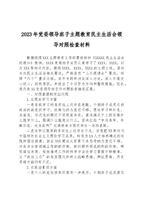 2023年党委领导班子主题教育民主生活会领导对照检查材料根据按照XXX主题教育工作部署安排和《XXXXX民主生活会的通知》精神,XXXX党委班子成员认真学习了XXXX、XXXX,以及XXX等相关内容,围绕XXXX、XXXX、XXXX的主题主线,紧扣本次民主生活会相关要求,严格落实三个摆进去要求,对照六个重点方面,召开专题研讨会深入讨论,深入开展交心谈心,剖析原因,并提出了今后努力方向和整改措施。现在,我代表XX党委领导班子作对照检查情况汇报。一、对照查摆的突出问题1.在理论学习方面一是在抓学习的自觉性上还存在差距。个别班子成员从讲政治的高度抓学习、抓转化的力度还不够。理论学习碎片化、表面化、形式化问题还不同程度存在,基本满足于上级安排什么就学什么,强调什么就突出什么,坚决扛起争当表率、争做示范、走在前列光荣使命方面还存在一定的差距。二是在学以致用的务实性上还存在不足。自觉把XX新时代中国特色社会主义理论学习成果,转化为XX人才培养模式的实践和理论探索,放在XXX建设大背景下来思考的力度还不够。对各自分管领域工作的新形势、新问题所形成的判断形势、研究谋划发展、有效推进工作的科学方法论学习掌握不够精准,从政治三力的角度强化和树立战略思维、辩证思维、历史思维方面仍有不足。2.在政治素质方面一是个人的党性修养还需进一步提升。个别班子成员落实党日、党课、双重组织生活、开展批评与自我批评等还不够严格,有时存在失之于宽、失之于软的问题。对当前社会上一些高级红低级黑等不良现象,从本质上认识不足,对身边一些同志出现的躺平佛系美分精日等错误思潮,旗帜鲜明批驳不够,挺身而出与之斗争的精神还不够坚决。二是党组织政治功能还需进一步加强。在XX党委推动的XX支部双带头人工程中,部分支部书记日常教学科研任务繁重还要身兼数职,受年龄和工作精力限制,致使个别支部党建工作与业务工作结合不够紧密,两张皮现象比较突出。3.在能力本领方面一是运用新理论、新思想指导实践的成效不够显著。在XX谋划重大战略、制定重大政策、部署重大任务的过程中,各类《方案》《计划》《意见》等宏观指导性文件都能够做到紧跟创新思想、体现创新理论,但在终端抓手上,缺乏创造性地转化为具体措施的方法,存在一定的落实误差。二是与时俱进、全面推动抓创新的意识有所弱化。个别班子成员思路陈旧,创新意识不高,缺乏探索精神,有时还习惯凭经验考虑问题和办事,习惯用一些老办法、老套路、老思维来想问题、干工作,对工作中出现的新情况、新问题研究不够及时,直接导致常规性工作多,亮点工作少、精品工作少。4.在担当作为方面一是斗争精神仍显缺乏。对今年党和国家大事多、喜事多要事多的实际,各种敌对势力意识形态领域斗争尖锐复杂,虽然班子成员都能够做到对手机网络特别是微信群、朋友圈上一些与主流声音不相符的观点言论做到自己不信不传,但坚决反击、果断批驳、及时提醒做得不够,斗争精神不够坚决。二是开拓创新能力不足。个别班子成员工作时间较长、任务压力较大,开拓创新意识不够,敢为人先、敢闯敢试精神不足,面对身边个别党员干部庸懒散现象、工作粗浅慢、利益斤斤计较、纪律宽松软隐患等现象,未能很好落实政治思想教育工作领导责任,优秀教师入党上热中温下冷的现象依然存在。5.在工作作风方面一是主动深入基层一线破题的意识还不够强。班子成员在互相交流中感到,随着近几年各项工作压力的加大,各种考核任务的增多,部分领导群众观念有所弱化,有时坐等上门多,主动问需少,同师生主动沟通、主动关心少,扑下身子走进师生身边,近距离听取师生心声做的还不够。二是为群众服务的责任担子抗的还不够稳。对当前广大一线教职工群体多样化、多层次、多方面的精神文化需求关注不多、调研不深、了解不够,存在渠道单一、方法简单的情况。6.在廉洁自律方面一是从严治党的压力传导还存在肠梗阻的现象。有的班子成员表示,有很多工作想到了,看到了,也安排布置了,但在抓落实上有所不足,平时工作一忙,就把大量的时间和精力投入在事务性工作中,没有狠下功夫去加强作风建设的过程监管。二是党风廉政建设长期性缺乏抓到底的韧劲。个别班子成员对党风廉政建设的长期严峻形势认识还不够深入,认为自己不管钱、不管人,工作中注重业务工作多,党的廉政建设工作预防做的少、工作部署少。对一些风险隐患警钟敲得多,缺乏督查和跟踪问效,对各级党组织党风廉政建设抓的不够。二、产生问题的原因分析一是主观改造不够彻底。从思想深处来讲,说明有的班子成员没有将自己本职工作置身于党的事业高度去谋划去推动,缺乏远见,以工作繁忙、时间精力有限为由,对XXX新时代中国特色社会主义思想领悟还不通透,集中学习的多、个人自学的少,被动学习的多、主动学习的少,专题讨论的多、系统学习的少,务虚学