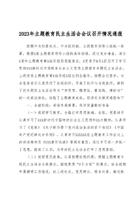 2023年主题教育民主生活会会议召开情况通报按照中央纪委机关、中央组织部、主题教育领导小组统一部署,根据X委主题教育领导小组的具体安排,经过充分准备,请示X委和主题教育第X指导组同意批复后,X党委于8月X日召开了学习贯彻XXX新时代中国特色社会主义思想主题教育专题民主生活会。上级党委主题教育第X指导组X组长到会指导。按照会议要求,与会党委委员认真进行了检视剖析,开展了批评与自我批评,做到了把专题民主生活会作为学思想、强党性、重实践、建新功的一次政治体检,检验了主题教育成效。现将有关情况通报如下一、会前阶段:周密开展部署,保质保量做好准备(一)抓好学习教育,全面打牢思想基础。会前,党委班子认真学习了XXX新时代中国特色社会主义思想和XX大精神,认真学习了《党章》《关于新形势下党内政治生活的若干准则》《中国共产党纪律处分条例》,认真学习XXXXXX在主题教育工作会议上的讲话精神及《XXX著作选读》等规定篇目。通过学习进一步统一了思想,提高了认识,为开好民主生活会打牢了思想基础。(二)抓好意见收集,认真梳理检视问题。根据主题教育专题民主生活会方案要求,围绕聚焦6个方面的要求,结合前期开展调研工作情况,向上级机关、党员群众、服务对象、相关联系单位等五个层面发放意见征求表X份。经汇总分类,共征求到X条意见建议。对征集到的意见建议,党委委员主动对号入座,分别认领,为深入开展自我检视剖析和对照检查提供了扎实依据。(三)抓好谈心谈话,沟通思想增进共识。按照四个必谈的原则,开展了深入的谈心谈话,交流思想、交换意见。在谈心谈话中,党委同志能够紧扣主题,谈参加主题教育的收获体会,谈守初心、担使命方面的差距不足,谈对整改落实的具体措施和意见建议,既主动谈自己存在的问题,也诚恳地指出了对方存在的问题,做到了把问题谈透、把思想谈通、把批评意见谈准充分沟通思想,消除隔阂,增进共识,营造了民主团结的和谐氛围。(四)抓好提纲撰写,做好剖析准备工作。在对领导班子和党员领导干部在学习研讨中查摆的问题、对照党章党规找出的问题、调研发现的问题、群众反映的问题、谈心谈话指出的问题进行系统梳理的基础上,认真起草了党委对照检查材料,召开专题会前党委会,集体讨论和审议相关材料,进行修改完善。党委班子成员结合各自征求意见反馈的情况和自身思想工作实际,认真撰写了个人对照检查材料,坚持不讲好话、不报虚功,分别列出了突出问题,有事例、有情节,说实话、讲真话,体现了刀刃向内、自我革命的精神。(五)抓好先行先改,做好先期整改落实。本着积极发现问题、敢于直面问题、切实解决问题的态度,针对征求到的意见建议,分类整理,逐条对照,从人民群众反映最强烈的问题改起,先期解决了部分存在的突出问题,凸显了务实的作风。二、会议阶段:深入检视剖析,真刀真枪自我革命8月X日,党委班子主题教育专题民主生活会在X会议室召开。党委书记X主持会议,党委副书记X、党委委员X、X参加会议,会期X。(一)会议主题鲜明突出。会上,与会成员充分运用主题教育成果,紧扣学习贯彻XXX新时代中国特色社会主义思想这一主线聚焦坚持不懈用XXX新时代中国特色社会主义思想凝心铸魂,切实加强党的思想建设,对于推动全党更加深刻领悟两个确立的决定性意义,更加自觉增强四个意识、坚定四个自信、做到两个维护,始终在思想上政治上行动上同以XXX同志为核心的党中央保持高度一致这一主题,按照指导组的具体要求,认真盘点收获、检视问题,进行了深刻剖析。(二)会议程序严密规范。会议共有五项议程:一是书面通报本次民主生活会征求意见情况;二是X同志代表党组班子进行对照检查;三是县处级以上党员领导干部逐人进行个人对照检查,每人发言后,班子其他成员对其发表意见;四是指导组领导对民主生活会召开情况进行点评;五是X同志对会议进行总结表态,并就整改落实工作提出具体要求。会议严格按照民主生活程序和市主题教育指导组的要求进行,开出了严肃认真的学风,开出了民主团结的作风,开出了求真务实的新风。(三)开展批评求真务实。班子成员能够以上率下、做好示范,不当局外人,不当旁观者,坚持按照团结-批评-团结的方针,拿起批评和自我批评的武器,开展了积极健康的思想斗争,自我批评做到勇于解剖自己、揭短亮丑,相互批评做到真点问题、点真问题,会上共提出相互批评意见X条,达到了红脸出汗排毒治病的效果。(四)领导点评充分到位。X组长代表指导组对会议召开情况进行了点评,并就进一步提升民主生活会质量效果提出三点要求一要在整改方向上再明确再聚焦。要坚持贯彻落实群众路线,树立基层至上的理念,让人民群众和基层单位广泛参与整改过程、全面评价整改成效、充分享受整改红利。二要在整改责任上再细化再压实。党委班子要切实负起整改落实的第一责任,在强化组织领导,把握整改节奏,划分整改责任,完善整改