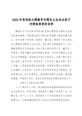 2023年局党组主题教育专题民主生活会班子对照检查剖析材料根据X关于召开学习贯彻XXX思想主题教育专题民主生活会的通知精神,局党组深刻认识用XXX思想凝心铸魂的重大意义,牢牢把握学思想、强党性、重实践、建新功的总要求,在主题教育专题民主生活会前,再次进行专题集体学习,在主题教育理论学习的基础上对各方面内容进行深入学、融汇学、贯通学,坚持不懈用XXX思想凝心铸魂,为开好专题民主生活会打牢思想基础。局党组成员召开专题会议,对照理论学习、政治素质、能力本领、担当作为、工作作风、廉洁自律等六个方面,认真查找梳理存在的问题,特别是对照习以学铸魂、以学增智、以学正风、以学促干的具体要求把自己摆进去,把职责摆进去,把工作摆进去,深刻剖析问题产生根源,制定整改措施,明确努力方向。现我代表局党组作对照检查发言如下。一、对照6个方面存在的问题(一)理论学习方面。我们始终把加强党的创新理论武装作为首要任务,贯穿全程、持续推进,围绕学思想这一主题主线,把入心见行、善思善用作为检验理论学习成效的重要标尺,以高质量的理论学习和高水平的思想武装为锚点,做到学、思、用贯通,知、信、行统一,推动主题教育走深走实,取得实效。对照该方面,存在的主要问题有:一是政治理论学习的深度不够,对加强党的创新理论武装的重要性、紧迫性认识不够完整准确。在政治和全局方面,自己的站位还不够高,未能从当前我国发展面临新的战略机遇、新的战略任务、新的战略阶段、新的战略要求、新的战略环境之中,充分认清错综复杂的矛盾和问题,全面深入开展理论学习的自觉性和主动性不足,用新时代党的创新理论观察新形势、研究新情况、解决新问题的历史自觉与历史主动有所欠缺。比如,在世界百年未有之大变局背景下,新思想被越来越多的外国政党和政治组织学习借鉴。但有的班子成员理论学习按部就班,被动学习多,主动学习少,没有充分认识到党的创新理论武装的极端重要性和紧迫性,对照高标准要求,未能时时处处把加强党的创新理论武装作为必修课、首修课、终身课,导致自己在主动服务和融入中国式现代化建设大局的过程中,存在统筹谋划力度不够大、改革破冰不够积极、工作成效不够显著等问题。二是学习方式不够科学,学风不纯不正,用党的创新理论指导实践、解决问题存在差距和不足。学习有时存在赶进度问题,比较追求速度,在把握重量和重质的关系上,处理得还不够均衡、合理,导致对个别的理论知识一知半解、不求甚解,没有真正掌握蕴含其中的立场观点方法,对照知其言更知其义、知其然更知其所以然的高标准要求还有一定差距。比如,有的班子成员学习方式固化,满足于学习了、读过了,对于学习内容与实际工作的联系,理论对实践的指导作用思考不多,没有真正做到活学活,没有真正把党的创新理论内化为思想和行动自觉,用理论武装的实效性大打折扣。(二)在政治素质方面。我们自觉树牢政治机关属性,以此次主题教育为契机,自觉接受革命性锻造和精神洗礼,带头旗帜鲜明讲政治,不断提高政治判断力、政治领悟力、政治执行力,增强四个意识、坚定四个自信、做到两个维护,始终在思想上政治上行动上同党中央保持高度一致。经过对照检查,该方面存在的主要问题是,一是大局意识树得不牢,站在政治高度上看问题的意识还不够强烈。从政治上观察、思考、解决问题的习惯尚未完全形成,在时时处处事事讲政治方面有差距,没有完全做到遇事多想政治要求、办事多想政治规矩、处事多想政治影响、成事多想政治效果。比如,有的班子成员在谋划工作和处理问题上,国之大者的政治意识不足,有时未能完全从党的立场思考问题,没有将自己的责任意识提升到捍卫党的理想信念、维护党的团结统一、密切党群关系、巩固党的执政基础的政治高度,也没有把所分管的领域、所从事的全部工作,都放到党和国家工作大局中来谋划,在统筹处理以大局推动局部、以重点牵引全局、以局部支持大局方面不够科学和均衡。二是敢于斗争的精神有所松懈,锤炼自身政治担当持续用力不足。政治觉悟和政治标准还不够高,主动接受政治体检,加强政治锤炼的斗争意识不足,存在打扫政治灰尘不够彻底,纠正行为偏差不够到位,自身的政治辨别力和免疫力还不够强等问题。比如,有的班子成员对于有些工作统筹力度不够,只想干的快,干出彩,未能从增强人民群众的获得感、幸福感的角度,进行政治定位,特别是对干部群众急难愁盼问题关注度不够高,对急难险重的工作存在畏难情绪,缺乏大无畏的政治品格,没有真正扛起与岗位相匹配的政治责任。(三)能力本领方面。局党组坚持把学习成果落实到干好本职工作、推动事业发展上,把党的创新理论运用到贯彻落实党的XX大提出的重大战略部署中去,切实提高用党的创新理论观察新形势、研究新情况、解决新问题的能力水平,更好把科学理论转化为认识世界和改造世界的强大物质力量。对照该方面,存在的主要问题是,一是推动高质量