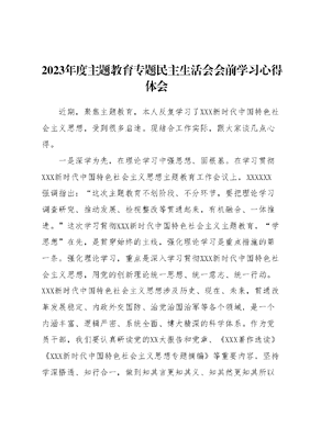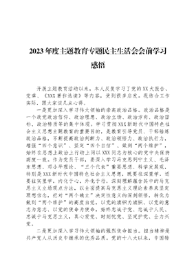 2023年度主题教育专题民主生活会会前学习感悟开展主题教育活动以来,本人反复学习了党的XX大报告、党章、《XXX著作选读》等内容,受到很多启发。现结合工作实际,跟大家谈几点心得。一是更加深入学习伟大领袖的崇高政治品格。政治品格是一个政党政治信仰、政治理想、政治立场、政治方向、政治目标、政治特质等的集中体现。学习贯彻XXX新时代中国特色社会主义思想主题教育的重要目的,是教育引导党员、干部锤炼政治品格,不断提高政治判断力、政治领悟力、政治执行力,增强四个意识、坚定四个自信、做到两个维护,始终在思想上政治上行动上同以XXX同志为核心的党中央保持高度一致。作为党员干部,要深入学习马克思列宁主义、毛泽东思想、邓小平理论、三个代表重要思想、科学发展观,特别是XXX新时代中国特色社会主义思想,既要往深里学,还要往实里学,内化于心,外化于行,深刻理解蕴含其中的马克思主义立场观点方法,以全面提高马克思主义理论素养来坚定理想信念,把对两个确立决定性意义的深刻领悟,转化为做到两个维护的高度自觉,以党的旗帜为旗帜、以党的意志为意志、以党的使命为使命,始终忠诚于党、忠诚于人民、忠诚于马克思主义,真心爱党、时刻忧党、坚定护党、全力兴党。二是更加深入学习伟大领袖的强烈使命担当。担当精神是共产党人从历史中继承的优秀品质。党的十八大以来,中国特色社会主义进入新时代,我们党踏上了实现第二个百年奋斗目标新的赶考之路。以XXX同志为核心的党中央赓续赶考红色基因,以伟大的历史主动精神、巨大的政治勇气、强烈的责任担当,统筹国内国际两个大局,贯彻党的基本理论、基本路线、基本方略,统揽伟大斗争、伟大工程、伟大事业、伟大梦想,以咬定青山不放松的执著奋力实现既定目标,以行百里者半九十的历史清醒不懈推进中华民族伟大复兴,努力答好新时代的强国大考,成功推进和拓展了中国式现代化。XXXXXX之所以一再强调担当精神,是因为只有做到担当,才能无愧于时代、无愧于人民、无愧于历史。作为党员领导干部,我们要更加深入学习伟大领袖的强烈使命担当,着眼新发展阶段,全面对标党代会部署要求,进一步明确自身定位,找准发展方向,扛起XXX之责。三是更加深入学习伟大领袖的深厚为民情怀。我们的人民热爱生活,期盼有更好的教育、更稳定的工作、更满意的收入、更可靠的社会保障、更高水平的医疗卫生服务、更舒适的居住条件、更优美的环境,期盼孩子们能成长得更好、工作得更好、生活得更好。在十八届中共中央政治局常委同中外记者见面时,XXXXXX一口气用了10个更字来描述人民的期盼。加强食品安全监管、减轻学生课业负担、公立医院高质量发展、重要民生商品价格调控、厕所革命、垃圾分类……新时代十年来,这些攸关民生福祉的大事小情被一件件列入XXXXXX的重要议事日程,干一件成一件。正是因为把为老百姓做了多少好事实事作为检验政绩的重要标准,坚持以人民为中心的发展思想,这些年人民群众获得感、幸福感、安全感更加充实、更有保障、更可持续。作为党员领导干部,我们要更加深入学习伟大领袖的深厚为民情怀,始终坚持以人民为中心的发展思想,聚焦为民、关注民生,深入开展我为群众办实事实践活动,在着力保障和改善民生上持续用力。要坚持从群众中来、到群众中去,用好XX等社区治理模式,深入农村、社区、企业等基层一线,面对面与群众交流交心,主动回应群众关切。要坚持和发展新时代枫桥经验,发挥社会矛盾纠纷调处化解中心作用,主动倾听群众呼声,解决急难愁盼问题,切实将矛盾纠纷化解在基层,让人民群众的获得感成色更足、幸福感更可持续、安全感更有保障。