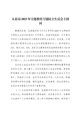 人社局2023年主题教育专题民主生活会主持词根据区纪委、区委组织部《关于认真开好2023年主题教育专题民主生活会的通知》文件要求,经督导组批准,今天我们召开区人社局2023年主题教育专题民主生活会。区纪委、区委组织部对我局这次民主生活会高度重视和关心,督导组组长XXX、组员XXX、XXX,派驻卫生健康委纪检监察组副组长XXX亲自到会指导。让我们以热烈的掌声对他们的到来表示热烈欢迎和衷心的感谢!参加今天会议的有局党组班子和副科级以上党员干部7人,区人社局其他副科级非党员干部列席会议。此次民主生活会是深入学习贯彻党的**大精神的重要举措和实际行动,意义重大。为切实提高民主生活会质量,局党组研究制定《区人社局2023年主题教育专题民主生活会工作方案》,明确学习内容、各环节具体时间节点、工作内容,明确具体要求和参加范围,制定流程表,扎实推进,保证专题民主生活会各项筹备工作有条不紊地开展。(一)扎实组织学习教育。坚持集中研讨和个人自学相结合的方式,将专题理论学习贯穿始终。采用集中学习、专题研讨交流和个人自学的模式,深入学习党的**大精神、新形势下政治生活若干准则等相关文件精神,切实把思想聚焦到贯彻落实XXX思想的重大决策部署上,提高认识、统一思想、增强自觉,打牢开好民主生活会的思想基础。(二)做好会前征求意见。通过召开座谈会、发放征求意见表等多种方式,广泛听取区直各单位、本单位机关干部、群众代表意见建议,并原汁原味分别向领导班子和党员领导干部本人反馈。局党组共征求到6个方面X条意见建议;征求到班子成员意见建议X条,已原汁原味向班子及班子成员反馈,并纳入班子对照检查材料中。(三)深入开展谈心谈话。认真落实四必谈要求,逐一开展谈心谈话工作,做到沟通思想、交换意见,指出不足、提出建议,把问题谈透、把思想谈通、把改进方向谈明白,把谈心交心的过程作为消除隔阂、增进团结,相互启发、剖析自我的过程,累计谈心谈话X人次。(四)认真撰写对照检查材料。紧扣会议主题,认真对照学习内容找差距,把存在的问题找准找够,把努力方向和整改措施写实写透,认清查找出问题的实质,提出整改具体措施。以上是这次民主生活会的准备工作情况。为了把这次会议开好、开出成效,我提几点要求:一是要围绕主题、开门见山,结合自身和工作实际,对照查摆问题,深入剖析原因,明确整改方向,不讲空话、套话。二是要放宽胸怀,虚心听取批评意见,有则改之,无则加勉,开展真诚的批评与自我批评。三是坚持实事求是,以正面教育为主,把握大方向和重点问题,不纠缠细枝末节。此次民主生活会共有五项议程,下面逐项进行。现在,进行第一项议程:由我通报2022年度民主生活会整改措施落实情况及本次民主生活会会前征求意见情况。现在,进行第二项议程:我代表班子作检视剖析。现在,进行第三项议程:请班子成员依次作对照检查,每人发言结后,其他同志依次开展批评。下面,由我进行民主生活会进行检视剖析,进行自我批评。……请各位同志对我提出批评意见。……(批评意见结束后)感谢以上同志们诚恳地对我提出的批评意见和建议,我虚心接受,抓好整改,改进工作。下面,请××同志进行自我批评检视剖析,××同志自我批评后请其他同志对他提出批评意见。现在,进行第四项议程:请督导组XXX同志作点评讲话,大家欢迎。刚才大家立足自身实际,本着严肃认真、实事求是、民主团结的态度,坦诚相待沟通思想交换意见,指出别人不足的同时不回避自己的问题,既有红脸出汗的紧张严肃,又有加油鼓劲的宽松和谐,会议达到了相互教育、相互警醒、共同进步和提高的效果。到会指导的同志也提出了许多宝贵意见,希望我们班子认真领会好、落实好。下面,我表明几点态度,与大家共勉。一是旗帜鲜明讲政治,全面提升理论武装水平。始终把政治建设摆在首位,深入学习贯彻宣传党的**大精神,切实把思想和行动统一到中央、省、市、区各项决策部署上来,深刻领悟两个确立的决定性意义,坚决做到两个维护,不断增强四个意识,不断坚定四个自信。二是带头示范做表率,纵深推进全面从严治党。以模范机关、勤廉机关创建为抓手,切实担负起管党治党政治责任,增强纪律和规矩意识,认真履行一岗双责,层层传导压力、传递动力,推动全面从严治党纵深发展,努力营造风清气正的政治生态。三是落实责任抓整改,强化会议成果转化运用。以此次民主生活会为契机,把问题整改作为工作的着力点,紧紧围绕党的**大确定的目标任务,进一步理清思路,强化措施,统筹推进就业、社会保障、人才人事、劳动关系等工作,切实把民主生活会成果转化为加快推动人社高质量发展的强大动力。同志们,这次民主生活会就开到这里,散会。