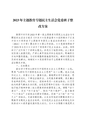 2023年主题教育专题民主生活会党委班子整改方案按照中央印发2023年第一批主题教育专题民主生活会与专题组织生活会方案及《中共××纪委监委××组织部关于认真开好××领导班子主题教育专题民主生活会的通知》(××〔2023〕××号)要求和××委工作安排,××党委领导班子于2023年9月××日召开了领导班子民主生活会。会前,领导班子广泛听取了干部群众意见,并进行了梳理归纳,会上联系实际深入查摆问题,严肃认真开展批评和自我批评,明确努力方向和整改措施。为切实将整改措施落到实处,确保问题得到及时有效解决,特制定××党委领导班子主题教育专题民主生活会整改方案。一、总体要求紧扣学习贯彻A新时代中国特色社会主义思想这一主线,聚焦A新时代中国特色社会主义思想这一主题,突出力戒形式主义、官僚主义这一重要内容,围绕理论学习有收获、思想政治受洗礼、干事创业敢担当、为民服务解难题、清正廉洁作表率的目标,对守初心、担使命进行一次政治体检,以刀刃向内的勇气解决自身问题,自觉把思想和行动统一到AXXX重要指示批示精神和第二批主题教育的部署要求上来,增强四个意识、坚定四个自信、做到两个维护。着力推进六个突出方面突出问题专项整改,坚持当下改和长久立相结合,完善体制机制,以务实有效的问题整改提升主题教育专题民主生活会效果,切实把民主生活会成果转化为加快推动××高质量发展的强大动力,为××全面振兴展现更大担当和作为。二、整改目标以本次民主生活会为契机,进一步增强政治定力,坚持问题导向,明确整改目标、整改任务、责任主体和整改时限等要求,以钉钉子精神抓整改,以更高标准、更严的要求、更实的举措,不断提高执行力和落实力,确保整改取得实效,推动××高质量发展。三、整改措施(一)对照理论学习方面突出问题一是深入学A新时代中国特色社会主义思想上存在不足。××党委班子成员满足于学习和工作相关的内容,对新理论、新观点、新战略学习研究还不深入、不系统。比如:有时学习照本宣科,学深学透不够,与学懂弄通做实还有差距,有的班子成员工作任务多,集体学习参加多、个人自学的自觉性不够,还没养成自觉静下心来学习的习惯,反复强化学,温故知新学,学深悟透,入脑入心还不到位。二是学习的系统性、全面性不高。对AXXX系列重要论述要求既一脉相承又与时俱进的整体掌握不深,比如:在学习贯彻落实党的XX大精神,通过结合党的十八大、十九精神,完全做到知其然更知所以然做得不够,把所学所得系统梳理应用,不断扩大学习成果的运用还做得不到位,切实在学习中把工作摆进去、把自己摆进去,把学习感悟摆进去,让理论成为助推工作强大动力的成效还有不足。整改措施:一是认真组织开展理论学习中心组专题学习研讨,坚持读原著原文,深入学、透彻悟。二是全面学习、全面把握、全面落实党的XX大精神,牢记三个务必,以起步即冲刺、开局即决战的工作热情和精神状态,撸起袖子加油干,全面落实新时代××发展改革新任务。整改时限:即时整改,长期坚持。(二)对照政治素质方面突出问题一是增强四个意识方面还存在不足。党委班子成员有时自觉从大局上谋划发展战略、制定工作举措、推进重点任务做得不够。整改措施:牢固树立大局意识,把××作为增强××高质量发展活力的重要抓手,主要领导亲自抓,班子成员按分管工作具体抓,着力解决工作中突出短板和薄弱环节,对重点任务做到量化分解,抓紧抓实、抓出成效。整改时限:即时整改,长期坚持。二是以学促作还存在不足。学习有时局限于知道新提法新要求,学用结合不够紧密,运用新理论和新思想破解项目推进难题的意识和能力还不够强,工作中未能达到体现时代性、把握规律性、富于创造性的高标准要求。整改措施:进一步增强政治敏锐性、警惕性,真抓实干、尽职尽责,以防风险保安全护稳定的过硬成效发挥好××党委领导作用,以党建引领推动××全面发展。整改时限:即时整改,长期坚持。(三)对照能力本领方面突出问题一是抓基层党组织建设还存在不足。××党委在抓各党(总)支部组织建设上还存在用力不均衡现象。比如:再优化支部班子建设、提升先锋带头作用、强化担当服务方面作用发挥不够,工作部署和要求不具体,办法单一,方式方法还不多,基层党组织的基础作用发挥不充分。整改措施:始终保持奋发进取的精神状态和知难而进、迎难而上的勇气,坚决克服不求过得硬、只求过得去的消极心态,结合实际创造性的开展工作。整改时限:即时整改,长期坚持。二是民主集中制落实还不到位。比如:召开党委会研究决策时,班子成员有时不敢大胆发表自己的意见,担心说错了影响自己形象,对不是自己分管的业务发表意见还不主动积极,集体智慧还没充分发挥,有时因研究事项多、时间较紧,没有提前预留充足时间让班子成员深入研究,导致部分决策事项议的不深不透。、整改措施:积极践行党的民主集中制原则,注重引导班子成员发
