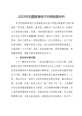 2023年主题教育班子对照检查材料学习贯彻XXX新时代中国特色社会主义思想主题教育开展以来按照学思想、强党性、重实践、建新功的总要求求,系统学习了党的XX大报告、党章、《XXX著作选读》《XXX新时代中国特色社会主义思想专题摘编》等内容,紧盯个人思想、学习和工作实际,把自己摆进去、把职责摆进去、把工作摆进去,在广泛征求意见建议、普遍开展谈心谈话、深入梳理检视问题的基础上,认真对照六个方面内容,深刻查摆检视,深挖问题根源,明确整改措施。现将对照检查情况报告如下:一、存在的主要问题(一)理论学习方面。一是在学懂弄通上下功夫不够。虽然能够认真学习贯彻XXX新时代中国特色社会主义思想,但对政治理论的实质精神和丰富内涵理解不够深刻,尤其是对党的最新理论学习不够、理解不深,没有很好的领悟其中蕴涵的精髓要义、立场、观点和方法,更谈不上用这些理论来指导实践,解决现实问题,在学懂、弄通、做实上缺乏挤劲和钻劲。二是观察分析处理问题的敏锐性还不够强。对上级精神理解不够透彻,对上级决策部署领会不深刻,贯彻执行缺乏创新性举措,对上级有明确要求的、方案比较成熟的,能够迅速行动抓落实,但对于一些新事物,缺乏先行先试的魄力和勇气,思想解放不到位,有时仍从在等明确意见,要优惠政策的形态。(二)政治素质方面。班子成员对意识形态领域的敏感性还不够,对新形势下如何更好地维护党的整体形象、宣传党的政策主张、巩固党的执政基础等方面,学习思考研究不深,分析研判不够,应对办法不多。比如有些领导不重视新闻宣传工作,对自己分管的部门不写信息、不报信息的情况不及时提醒,导致有些部门在上稿信息寥寥无几。(三)能力本领方面。一是创造性开展工作不够。有的班子成员在创新工作方法和手段方面欠缺,推进工作的招数和办法,在转变发展方式上危机感、紧迫感不强,凭经验想问题、按老套路办事情的现象依然存在。二是思想解放程度不够。有的党员干部思想还不够解放,习惯于惯性思维,接受新理念比较慢;有的领导干部每天看起来都很忙,但是忙的没章法,又没效果。有的领导干部谋划工作不深入,有时在对接落实上级政策中,习惯于照着文件办事,没规定的时候不知所措,找不到与上级政策机遇的结合点,有规定的时候一刀切,没有做到与实际充分结合。(四)担当作为方面。干事创业激情有所弱化,工作中锐意进取的开拓精神不足,存在精神懈怠现象,只求过得去,不求过得硬,放松了自我净化、自我完善、自我革新、自我提高的要求比如,面对环境整治、危旧房改造、改厨改厕等一些难度比较大的工作,存在畏难情绪,个别班子成员思想上出现了标准不高、力度不大、消极应付的倾向,只求工作正常推进,不求工作超常突破,缺乏创造性开展工作的动力和干劲,有不求无功、但求无过思想。(五)工作作风方面。一是制度落实不够严格。有的班子成员对各自分管部门的干部要求不严,标准不高,一次性告知制度首问责制、AB岗制度落实不好,主动服务意识不强,各部门办理的业务事项有些没有形成清单化,面对偏远村的办事群众,还存在等上班再办的情况,导致一些群众长时间在大厅里等待。比如便民服务大厅,前面一直要求让分管领导做好便民服务中心建设抓好坐班制度,但在暗访组暗访过程中,依然出现空岗的情况。二是调查研究不够深入。虽然领导班子成员都能够深入各村、重点工作推进现场进行调研,但是有的同志深入基层调研时间不多解决问题成效不明显,对于一般性问题蜻蜓点水式的了解一下,或者电话了解一下情况,有的同志调研不深入,发现问题不准,提出的处理意见缺乏针对性,没有操作性等等。比如,在重点工作推进中,部分班子成员只是坐在办公室里听汇报,没有深入一线落实工作,即使下去指导也是提要求、做安排,主观上对工作自认为情况清楚,但跟踪在第一线推进,解决问题上跟踪落实不到位。(六)廉洁自律方面。一是责任落实不够到位。虽在在工作中都能将工作进行安排部署,但还存在责任意识层层递减的情况落实主体责任的主动性和自觉性不强。主要领导紧盯的都重视,主要领导盯得不紧的都不重视,存在抓而不实、抓而不紧、抓而不细的现象。具体行动和措施还多停留在学习领会表态阶段,在抓落实方面有时存在缺位想象。二是自我要求还不够严格。部分班子成员存在不愿闯、不愿试,怕出问题、怕担责任的思想,在谋划发展上站位不高,对工作中的困难、前进中的盲区,敢想、敢干、敢闯、敢试的魄力减弱,致使工作效果不理想。比如,仍有一些干部甘当太平官,安于现状、甘于平庸,不善于想办法解决问题,甚至不负责、不作为、不担当。二、产生问题的原因分析认真剖析问题产生的根源,虽然存在一定的客观原因,但主要是主观原因造成的,具体表现在以下几点:1.理论学习不深,党性修养不强。班子成员在在一定程度上还存在着主动学习少、被动学习多,系统学习少、现用现学多的问题,在学习中缺乏对农村工作的调查研究,