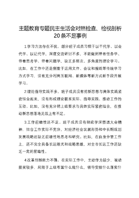 主题教育专题民主生活会对照检查、检视剖析20条不足事例1.学习方法存在不优。部分班子成员习惯于以干代学、以会代学、以记代学,深度交流研讨不多,不能做到带着任务学、带着思考学、带着问题学,缺乏多层次、多角度的理论学习。比如,在工作中还是侧重于运用文件、会议和报纸等传统学习方式学习,没有充分利用互联网、新媒体等新方式新手段开展学习。2.理论指导实践不多。班子成员没有把新思想与具体实践紧密结合起来,没有形成理论联系实际、指导实践、推动工作的互动。比如,没有充分把上级要求与具体实际紧密结合,在推动新思想落地见效上有不足。3.工作前瞻性还不足。班子成员没有彻底学深悟透大会精神,结合工作实际不充分,对经济社会发展形势和中长期规划发展战略还缺乏前瞻性地思考和研究。比如,在自身分管工作上,还不完全具备长远眼光和战略思维,对全市长远工作还缺乏一定的前瞻性。4.改革创新能力不强。在实际工作中,主动作为较少,被动接受较多,局限于上级布置什么做什么,领导安排什么落实什么,在工作上有求稳守成心理,改革创新能力不强,向困难叫板、向问题开刀、向矛盾挑战的勇气不足。比如,有时在处理繁重任务和驾驭复杂局面时,更多的是追求尽快完成任务、达成目标就好,而没有把它看成一个是增强自身改革创新能力的良好契机。5.工作调研走访不够深入。平时忙于日常事务性工作多,坐在办公室里听汇报、作决策多,深入基层一线调研走访了解情况、征求意见、解决问题的时间较少,与干部群众面对面座谈交流也较少,导致对实际工作把握不足,在工作落实上有落差。比如,对与人民群众切身利益紧密相关的部门一线调研较少,在竭诚为民服务,解民忧、纾民困上做得还不够好。6.大局观念有欠缺。虽然能在班子内部积极协助搞好分管工作,全力配合其他领导做好相关工作,但还存在对分管外工作关注少、参与少的问题。比如,在分管工作内对任务量大、工作责任重的环保工作关注的多,对其他工作任务相对较轻的分管部门也关注的少。7.调查研究不够勤。忙于日常事务性工作多,到基层一线了解情况、征求意见、解决问题的时间相对减少,没有时刻以高标准严格要求自己的现象。比如,在一些具体问题、具体事情上多是听经办人的汇报,实入一线的情况较少,根据汇报情况做出决策,对实际工作把握不足。8.实干精神还不够强。部分工作上依然存在一些把开会当作贯彻、发文当作落实、检查当作督查的现象,忽视实际效果的运用。比如,有时工作头绪多,没能做到全方位统筹兼顾。9.改革创新有欠缺。主要是在推进行政审批制度改革便民化工作中体制机制创新不够。我所承担推进的政务服务中心工作方面,仍存在有窗口单位事项办理授权不到位、流程再造不实不细。比如,互联网+政务服务运用不成熟等问题,没有在体制层面形成五个一的高效服务格局。10.理论学习不到位。把理论学习当作软指标,没有处理好工作与学习的关系,总认为自己在基层工作的时间长,经验比较丰富,缺乏对理论学习重要性和紧迫性的认识。比如,没有把理论学习转化为政治意识的提高,自我素养的完善,致使思维层次和工作能力上不能进一步向高水平迈进。11.理论联系实际不到位。能够坚持学以致用,运用新思想推动分管领域各项工作顺利进行,但学用关系处理得还不够到位,理论学习和具体实践一定程度上存在脱节。有时只满足片面引用个别原理,而不能有效地和实际工作紧密结合起来,学习的实效性有待加强。比如,将学习研讨成果转化为决策,推动解决突出问题、加快发展还不够到位,效果不太显著。12.履职担当作为不彻底。一直以来,都将工作精力倾注在经济发展领域,能够严格执行分管工作责任,自觉服从组织分工和组织安排,虽然尽职尽责完成了自己所分管的各项工作任务,但也还存在责任意识弱化,有等和靠的思想,有时也有应付交差思想。比如,进取精神和担当意识还不强,对于经济社会转型时期出现的一些新问题、新领域,多循规蹈矩,少尝试突破。13.工作作风建设不够严。自己能认真贯彻执行八项规定,努力克服和自觉抵制四风,没有违反八项规定的行为。工作中深入基层调查研究还需加强,了解面上情况不够深入,发现深层次问题少。比如,在联系群众方面,与群众见面,针对性、目的性的多,真正与群众沟通思想还不够。14.践行四个自信不坚定。班子个别成员对四个自信理解认识还需要进一步加强,在践行四个自信的自觉性上还有一定差距。比如,对道路自信认识不深,对理论自信、制度自信学习还不够透;文化自信方面做得不够好,对中国传统文化学习不够、理解认识还不够全面。15.践行两个维护不到位。有的班子成员的政治敏锐性和政治洞察力还有待加强。在一些班子成员中,对社会上的一些不良思潮没有作坚决的斗争,对一些苗头性倾向性问题,甚至一些错误言论,没有及时旗帜鲜明地反驳和纠正。比如,网络管控和舆论引导工作还存在盲区,对新媒体上的言论引导水平还需提