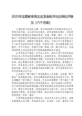 2023年主题教育民主生活会批评与自我批评意见(六个方面)1.理论学习系统性不强。学习XXX新时代中国特色社会主义思想不深不透,泛泛而学的时候多,深学细照的时候少,特别是对党的XX大精神还没有做到学通、吃透、真懂、笃行,对两个确立在实现中华民族伟大复兴的现实意义和深远的历史意义认知还不够深刻、理解还不够透彻。例如,平时工作中虽然制定了个人自学计划和具体学习内容,但落实不好,有时被事务性工作缠身,学习不及时,导致学习紧一阵松一阵,缺少持久力,这说明我思想上对政治理论学习的极端重要性还不到位。2.学用结合不紧密。在平时工作中,满足于用已有的经验知识来应对工作中出现的各种情况、问题和变化,利用XXX新时代中国特色社会主义思想解决问题,还没形成工作自觉和工作常态比如,把主要精力放在了落实任务、完成年度目标、推进重点工作中,但在具体工作中,运用XXX新时代中国特色社会主义思想指导实践、推动工作高质量开展的思路不活,学习成果转化为工作实效的能力还不足。3.在践行两个确立的实践要求上有差距。在把握两个确立的实践要求时,往往注重将其体现在自身的言行之中,做忠诚拥护两个确立的表率。但在如何把握好两个确立思想理论的抽象性和实际行动的实践性上,缺少全面深入的思考;对于如何将党的创新理论融入贯彻党的路线方针政策和工作部署之中,贯穿于深化改革、加快发展的全过程之中,方法还不够多措施还不够实,结合得还不够好,政治态度与实际行动未能达到高度的统一性和一致性。4.贯彻新发展理念不够坚决。面对百年未有之大变局,对新发展理念认识不深,贯彻落实还有一定差距。比如,虽然自己时刻坚持准确识变、科学应变、主动求变,但对在新的历史方位中找准坐标定位、谋划改革创新等方面思考和研判得还不够多,利用全会精神指导事业发展的作用不明显,与其他先进地区相比,我们在三医联动、信息化建设等方面还存在差距,没有拿出更好的方式解决好循环堵点、改革难点、发展短板、民生焦点,创新发展和全面深化改革的时代答卷答得不够理想。5.党员干部作用发挥不够。工作中没有充分发挥先锋模范作用,在日常工作中的带动效果不明显。比如,单位中干部不担当不作为的事情仍有发生,有难度的不想干,有风险的不敢干,没先例的不愿干现象和怕出事、怕问责、怕追责的问题还没有从根本上得到解决,在如何激励干部担当作为和整治干部不担当不作为上思考不深,管理相对不够严格。6.主动担当进取的劲头不足。虽然能较好地完成各项工作任务,但离高标准、严要求还有差距。自己身为系统的新人,面对新形势和新任务,总觉得要以稳定发展为主,稳字当头放不开手脚,留余地、留空间,工作中遇到难题还存在等靠思想在遇到工作时间紧、任务重时,只想尽快完成,会放松要求,降低标准,没有把工作做实、做深、做细,特别是面对一些政策把握不准、规定不明确的事情,有时明知道会影响工作进度,也采取多一事不如少一事的态度,存在宁愿少出成绩也不能出问题的思想。7.抓执行落实的定力不足。在日常工作中,对上级和领导关心重视的事情,带头研究得多,亲力亲为得多,下的力气也大,一些任务即使非常困难,也要克服困难、创造条件、千方百计去完成。但对于一些日常性的工作,认为由分管领导和工作人员按照常规办理即可,没有持续性的关心和关注,导致有些工作存在的问题长期得不到解决。8.思维眼界不够宽。认为自己工作时间长,历经多个岗位,凭经验、凭老办法处理问题的时候比较多,对新情况、新问题研究投入精力不足,谋划工作的前瞻性、统筹性和规划性还不够强比如,虽然自己能够认识到改革对推动工作落实的重要性,但是有时候习惯于用既有经验、既有办法解决问题,按部就班完成任务,对新情况新问题洞察不足,在一些难题破解力度还不大。9.群众路线走得不实。在积极为基层和群众排忧解难方面还需加强和改进。开展工作时没有把维护和发展群众利益作为根本出发点和落脚点,有时下去检查调研,跑面比较多,没有真正扑下身子走进群众身边、走进群众心里,近距离听取群众心声。10.四下基层、调查研究工作针对性不强。在机关工作时间长,走进基层深入群众调查研究少、了解实情不全面,从根本上缺乏密切联系群众的思想自觉,缺乏热情服务群众的行动自觉,未能真正沉下身子接地气。比如,对于一些严重制约工作开展的历史遗留问题,调查研究得还不透,落实解决还不彻底,还没能够真正抽出时间、扑下身子、解决难题。11.落实全面从严治党责任还不够有力。落实全面从严治党责任还需加强自觉性,从严治党是党始终保持青春活力的第一秘诀,而自己对党风廉政建设的长期严峻形势认识还不够足,有时认为单位也是清水衙门,不会出大的问题,工作中过于重视业务工作,没有把党的廉政建设摆到同等位置上,分管领域党风廉政建设工作部署较少,压力传导、工作监督还不够到位,对一些风险隐患警钟敲得多,