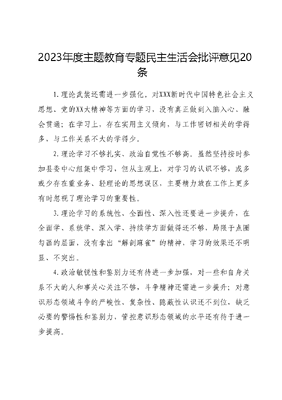 2023年度主题教育专题民主生活会批评意见20条1.理论武装还需进一步强化。对XXX新时代中国特色社会主义思想、党的XX大精神等方面的学习,没有真正做到入脑入心、融会贯通;在学习上,存在实用主义倾向,与工作密切相关的学得多,与工作关系不大的学得少。2.理论学习不够扎实、政治自觉性不够高。虽然坚持按时参加县委中心组集中学习,但从主观上,对学习的认识不够,或多或少存在重业务、轻理论的思想误区,主要精力放在工作上更多有时忽视了理论学习的重要性。3.理论学习的系统性、全面性、深入性还要进一步提升,在全面学、系统学、深入学、持续学方面做得还不够,局限于点圈勾画的层面,没有拿出解剖麻雀的精神,学习的效果还不明显、不突出。4.政治敏锐性和鉴别力还有待进一步加强,对一些和自身关系不大的人和事关心关注不够,斗争精神还需进一步提升;对意识形态领域斗争的严峻性、复杂性、隐蔽性认识还不到位,缺乏必要的警惕性和鉴别力,管控意识形态领域的水平还有待于进一步提高。5.坚决执行上级部署方面还需进一步加强,有时在工作推进上存在重布置、轻落实的问题,出现前紧后松的现象;对一些重点工作,亲自督促抓落实不够,导致一些工作在基层流于形式,效果不明显。6.督促班子成员和部门贯彻中央、省、市决策部署力度不够跟踪问效不到位,少数干部在令行禁止、马上就办上打折扣执行力不强。7.服务群众意识淡化。缺乏深入基层调研,虽然也经常下基层,但主动性不强、不够深入,大多数都是按照基层的安排,去看一些正面典型,造成调研不够系统深入,不够全面完整。8.联系群众还不够紧密。到基层调研时注重想了解的情况多全面听取基层群众意见和与基层干部群众沟通交流相对较少,在问计于民、问需于民、问政于民等方面做得还不够。9.宗旨意识需要进一步树牢。深入基层解决实际问题做的不到位。下乡调研时听村干部、乡镇和部门负责同志的工作汇报较多,不打招呼、直奔乡镇村庄、直接面对基层党员干部群众了解情况相对较少。10.狠抓末端落实的力度还需进一步提升。面对政府系统纷繁复杂的工作,安排部署的多,对执行过程关注的较少,对有的重点工作直接上手督促检查不够,在一抓到底方面还要进一步加强11.对党建工作投入的精力不多,主动研究谋划的少。平时与党员干部交流多为安排工作、提工作要求,静下心与普通党员谈心、提醒不多。县政府班子民主生活会上,谈心谈话、批评和自我批评还不到位,集体谈的多,一对一谈的少,就事论事,讲工作、讲成绩较多,谈问题、谈缺点较少,开展批评不够直接直白,红脸出汗还没有形成常态。12.开拓创新意识不足。面对繁重的发展任务和工作中不断出现的新情况、新问题,习惯于按照老经验、老办法推动工作,自觉运用新理论、新工具,创造性地破解矛盾难题方面仍需进一步提升。13.关心关怀还不到位。政府系统事务繁杂,大家一年到头从早到晚都很辛苦,对干部职工的工作、学习、成长和生活、家庭诉求关心不够,体恤较少,交流不多,多数情况是在强调工作,营造和谐的大家庭方面还有不少提升空间。14.对待工作认真负责,统筹全局能力比较强。但在工作中有急躁情绪,有时因为时间紧任务重,就显得比较着急,安排工作缺乏耐心。15.履行一岗双责还需进一步加强。平时对工作落实强调的较多,对党风廉政建设强调的少、要求的少、过问的少,特别是对日常工作肯定成绩的多,对个人问题指出的较少,没有从思想上高度重视。16.落实全面从严治党责任方面还不够有力,对履行一岗双责和党风廉政建设的认识还不够深入,把主要精力放在经济发展、城市建设等日常事务上,导致抓工作开展与抓廉政建设用力不均衡。17.对严守党的政治纪律和政治规矩的认识还不够深刻,与政府工作结合还不够,对政府部门和乡镇谈业务多、谈思想少指出具体问题多、剖析问题根源少,干部教育监督管理存在点到为止的现象。18.在为民办实事上还需进一步加压发力,近年来在全县民生大事上取得了阶段性成果,但在一些项目谋划实施上,考虑财政压力等因素较多,思想负担重、步子迈不开。19.在政府系统思想政治建设中,虽然反复强调抓好政治教育的重要性,但在落实中有时候还是不自觉地把抓工作落实摆上重要位置,思想政治教育需要进一步强化。20.在日常工作中,虽然充分利用节假日、礼拜天投入工作,但因日常工作繁杂,深入基层一线点对点调研还是不够多,真正沉下去、坐下来、入基层的时间比较有限,对个别工作的末端落实情况掌握不够全面。