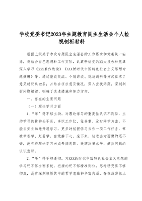 学校党委书记2023年主题教育民主生活会个人检视剖析材料根据上级关于本次专题民主生活会的工作要求和党委统一安排,我结合自己思想和工作实际,认真研读党的XX大报告和党章深入学习《XXX著作选读》《XXX新时代中国特色社会主义思想专题摘编》等,通过座谈交流、个别访谈、现场调研等方式征求了意见建议共12条,并结合征求意见情况,深入查找问题,深刻剖析问题根源,明确了改进措施和努力方向。一、存在的主要问题(一)理论学习方面1.学得不够主动。对理论学习的重要性认识不到位,主动学习的精神头不足,多以工作忙、任务重、没时间学为由,不能自觉主动地开展学习,更多时候把学习当作一项工作任务,常被牵着学、赶着学,自觉静下心、坐下来、钻进去方面做的还不够,没有将理论学习当成开阔思路、提高决策水平、解决问题的认识意识。2.悟得不够透彻。对XXX新时代中国特色社会主义思想的学习还不够全面系统,把握的还不够精准到位,思考研究得不够彻底,没有深刻领悟其中的哲学意蕴和丰富内涵,存在浅尝辄止的情况。思想认识主观感性的多、点状和碎片化的多,在系统把握学、联系实际悟上下的功夫还不够,没有完全做到学深悟透、入脑入心。3.用得不够鲜活。理论指导实践、推动发展的思路不开阔、突破口没有找准,缺乏将理论学习成果转化为推动工作发展的创新举措,学用脱节不同程度存在,学用转化效度不高。特别是对XXX新时代中国特色社会主义思想所蕴含的世界观和方法论、思维方法、工作方法等用的还不够活、不够好、不够出成效,没有做到举一反三、活学活用、融会贯通。(二)政治素质方面4.政治判断力不够准。有时对中央及省、市党委重大决策部署理解的不够透彻,对党的创新理论把握的还不够全面深入在及时、持续跟进学习XXXXXX最新重要讲话、重要指示精神方面存有欠缺。比如,在深入推进黄河流域生态保护和高质量发展国家战略中,没有深刻悟透党中央通过所关心事项所传递出来的重大政治信号及深远政治考量,没有及时抢抓战略机遇创新推进XXXX工作,导致在指导实践、推动工作时难免流于被动应付而不能创造性地贯彻执行。5.政治领悟力不够深。在学懂弄通做实XXX新时代中国特色社会主义思想上还存有较大不足,没有认真领会其重点和创新点,特别是对新的提法、新的表述,缺乏认真思考、深刻领会。比如,对用XXX新时代中国特色社会主义思想凝心铸魂的政治责任感不强,没有很好地肩负起XXXX工作责任,对如何运用近平新时代中国特色社会主义思想培育时代新人缺乏有效思路和创新举措。此外,自觉思考钻研问题的能力还需进一步提升,对意识形态领域的复杂斗争缺乏政治敏锐性与鉴别力。6.政治执行力不够强。在强化政治责任、政治担当方面仍有差距,执行上级决策部署方面还存有欠缺。比如,有时对XXXXXX重要指示批示和党中央重大决策部署传达学习贯彻不够迅速落实不够全面,研究解决问题有时存在偏差,对标对表不够。对政治引领工作全局的落实不够彻底,没有很好的贯彻落实到具体工作的全过程。比如,党的XX大强调要推动高质量发展,但在推进各项具体工作过程中执行不够严格,有时因为工作任务繁重,忽视了对某些工作高质量标准的要求。(三)能力本领方面7.发展理念还不够新。贯彻新发展理念还不够深入,开展工作有时囿于原有传统,一些不符合新发展要求的思维理念、方法举措还没有完全打破。特别是面对新的时代要求,想问题、作决策缺乏与新时代相适应的眼界视野,与新发展要求相适应的思维理念、工作方式与创新实践还没有完全跟上。8.斗争本领还不够高。面对错误思潮、网络舆情等风险挑战,个人在做好主责主业的能力本领上还存有不足。在开展工作中,对如何加强意识形态工作、网络舆情处置等,缺乏前瞻性的系统设计、治理路径还不够明晰、创新方式方法还不够多,埋头苦干多了一些,抬头看路做得不够,有时仅满足于口头上讲了带头践行还有差距,加快高质量发展的领头雁作用发挥不够这方面我还需要加强。(四)担当作为方面9.主动作为的干劲还有不足。在谋划开展工作中,没有紧紧锚定发展目标形成清晰的发展路线图,谋划得还不深入和具体,在开展工作中有时抱有差不多心态,抓工作标准不高,求平保稳,导致在工作实践中追求卓越的意识有所淡化、追求高质量发展的决心有所削弱,主动担当作为的干劲有所松懈。10.破解难题的拼劲还有不足。随着分管工作越来越多,上级要求追责越来越严,在带头自我加压、攻坚克难方面的劲头有所弱化,工作中存在求稳怕乱的保守思想,既想推动发展,又怕风险挑战,有时存在畏难情绪、逃避心理,对破解工作难题的思考不够经常、不够深入。对标其他兄弟单位,自身发展中存在的短板和弱项还缺乏切实可行的管用措施,攻坚克难的精气神有待进一步发挥。11.创新发展的闯劲还有不足。在开展工作中,有时多停留在确保完成各项重点工作任务和推进日常工作