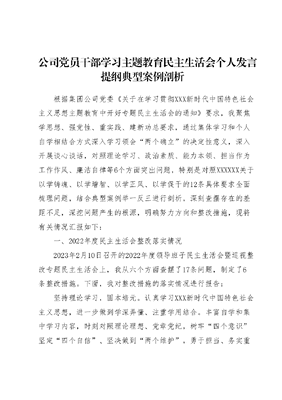 公司党员干部学习主题教育民主生活会个人发言提纲典型案例剖析根据集团公司党委《关于在学习贯彻XXX新时代中国特色社会主义思想主题教育中开好专题民主生活会的通知》要求,我聚焦学思想、强党性、重实践、建新功总要求,通过集体学习和个人自学相结合方式深入学习领会两个确立的决定性意义,深入开展谈心谈话,对照理论学习、政治素质、能力本领、担当作为工作作风、廉洁自律等6个方面突出问题,特别是对照XXXXXX关于以学铸魂、以学增智、以学正风、以学促干的12条具体要求全面梳理问题,结合典型案例举一反三进行剖析,深刻查摆存在的差距不足,深挖问题产生的根源,明确努力方向和整改措施,现将有关情况汇报如下:一、2022年度民主生活会整改落实情况2023年2月10日召开的2022年度领导班子民主生活会暨巡视整改专题民主生活会上,我从六个方面查摆了17条问题,制定了6条整改措施。下面,我对整改措施的落实情况进行报告:坚持理论学习,固本培元。认真学习XXX新时代中国特色社会主义思想,进一步做到学深弄懂、注重学用结合。丰富自学和集中学习内容,时刻对照理论理想、党章党纪,树牢四个意识坚定四个自信、坚决做到两个维护,勇于担当、务实重行。强化宗旨意识,众望有归。深入基层一线调查研究,了解掌握情况,针对重点项目、重点工作进行现场指导,解决实际问题推动各项工作开展。不断提高解决实际问题的能力和水平,提高工作的预见性、主动性、原则性和创造性,将理论学习成果运用到实际工作中,运用所学,解决公司发展中的难点问题,赢得群众呼声。严谨工作作风,不欺暗室。坚持务实重干,充分利用国内大循环的机遇,积极开拓国内市场,明确XX公司战略定位,着力推进公司十四五规划进程,从公司经营实际出发,稳中求进,开拓公司经济可持续发展的稳定局面。鼓励创新发展,再次突破。立足公司实际,敢于突破创新,规划XXXX经营布局,完善XXXX管理模式,积极探索公司高质量稳定发展方向,实现公司经营发展由学习到创造的转变,实现党建创新引领企业创新发展。秉持廉政原则,坚决不变。坚持自我监督和反省,保证勤政清廉的个人原则,坚持重要工作、重大问题亲自过问、重点环节亲自协调、重要事件亲自督办,注重源头预防,努力营造良好的政治生态环境。二、对照查摆问题情况(一)理论学习方面党员干部作为党的骨干力量,理论学习是提高自身素质和履行职责的重要途径。我能够自觉将理论学习摆在重要位置,坚持自觉学习、主动学习、深入学习,不断厚实理论功底;坚持把理论学习作为一种习惯、一种必需、一种责任,坚持深学深悟、坚持问题导向、坚持创新方法,不断在提升理论学习质效上下功夫使长劲,但在学习过程中还有几点疑惑未解决:1.将理论学习生活化,但抽象难升具体。虽然能够把理论学习作为一种向上、向善、向前的生活方式,做到学习深层次挖掘原著原文内容,但深刻理论和鲜活实践未能发生充足的化学反应,重点内容领悟不透彻,抽象概念很难在生活工作中充分实践。2.将深学笃用惯性化,但缺少巧劲韧性。为加强巩固理论基本功,制定主题教育学习计划,通过自我监督系统性、连贯性完成理论学习任务,但在日常学习中缺少有效的学习方法,又拘泥于规定内容,难以拓宽思路、开放角度、增识见闻。3.将创新理论实践化,但缺乏工作前瞻性。通过创新理论结合工作经验,有效周转处理工作各类问题,但不能做到融会贯通举一反三。对新思想以及其他一些重大理论问题,在某些方面吃得不透、研究不深、把握不准,对新形势、新情况、新任务、新问题,有时候不能结合理论高度分析,运用创新理论指导工作实践上还有差距。(二)政治素质方面作为党员干部,政治过硬是首位条件,工作中,我能自觉做到深入学习贯彻XXX新时代中国特色社会主义思想,树牢四个意识,坚定四个自信,坚决做到两个维护,但还存在以下几个问题:不习惯用政治眼光观察分析问题。政治眼光是明辨是非的一种智慧,在日常工作中,我能忠诚于党的事业、忠诚于党的路线方针政策、忠诚于新时代党的组织路线,但在学习运用理论知识这个显微镜和望远镜的时候,感到力不从心,难以从一般事务中发现政治问题,从倾向性、苗头性问题中发现政治端倪,从错综复杂的矛盾关系中把握政治逻辑。不善于在大局中找准自身定位。在经济社会发展全局之中,找准自身位置、抓好关键环节,既是把系统观念运用于理解和贯彻新发展理念的体现,又是做好各项具体发展工作的基础。面对大变局下的新结构经济,难以在其中找到自己的方向和位置无法提升更高的思想站位,有效解决工作实际与理想境界的差距不能从全局角度综合考虑问题。我深知作为公司领导要始终站在时代前沿观察思考问题,把公司战略发展放到历史长河和全球视野中来谋划,当面对如今的大变局、充满不确定性的国际局势和国内改革发展稳定的艰巨任务时,很难考虑周全,布设完备赢得市