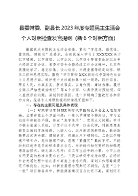 县委常委、副县长2023年度专题民主生活会个人对照检查发言提纲(新6个对照方面)根据这次专题民主生活会安排,紧扣学思想、强党性、重实践、建新功总要求,会前我深入学习了XXXXXX关于以学铸魂、以学增智、以学正风、以学促干等重要论述以及中央经济工作会议、省委市委全会暨经济工作会议精神,扎实开展理论学习、意见征集、谈心谈话、问题查摆等规定动作,联系工作和思想实际,围绕学习贯彻XXX新时代中国特色社会主义思想方面,维护党中央权威和集中统一领导,践行宗旨、服务人民,求真务实、狠抓落实,以身作则、廉洁自律,履行全面从严治党政治责任等6个方面,认真开展对照检视,深入查找存在问题,深刻剖析原因,进一步明确了整改任务和努力方向,现将个人对照检视剖析情况汇报如下。一、存在的主要问题及具体表现(一)对照学习贯彻XXX新时代中国特色社会主义思想方面。主要存在三个方面问题:一是以学增智不够到位。学习主动性和积极性不强,存在急学急用、实用主义问题;学习不够全面深入系统,习惯于以干代学、以会代学,对新思想未能真正做到学深悟透、入脑入心,运用新思想新理论、新论断新要求武装头脑、增强素质、把握运用不够到位。二是以学铸魂不够有力。党性锤炼不够,思想紧箍咒戴的不牢,不能时刻以优秀党员的标准要求自己,对新时代如何更好的加强思想政治修养,缺乏深入思考;在工作生活中的小事、小节上没有用更高的标准来要求自己。三是以学促干有待加强。在经济社会发展过程中站在省市高度上考虑问题、谋划工作思路做得还不够到位。比如:对新发展理念预判还不到位,县里三个一批项目储备库中,新能源基建项目占比还不高,谋划还不到位。更多关注一些成熟的、与XX有关的上下游企业,对大数据、新能源、人工智能、总部经济等新产业新业态的关注研究还不多,培育壮大骨干企业力度还不够。(二)对照维护党中央权威和集中统一领导方面。主要存在两个方面问题:一是政治敏锐性还不够强。认为只要自己在政治上与党中央保持高度一致就是讲政治,对社会上个别消极议论或负面言论所产生的负面影响,认为只要自己不附和、不转发就行了,在旗帜鲜明、勇于斗争、捍卫维护核心方面,没有及时以党员领导干部的身份去教育纠正并弘扬正能量。二是政治素质还有待加强。对两个确立的决定性意义学习还不够深入,领悟还不够透彻,对新形势下如何更好地维护、宣传党的形象权威、政策主张等思考研究还不深入。特别是还没有站在理论指导实际的高度,思考和站位还不够,没有真正找准贯彻落实的切入点和落脚点,真正把理论知识转化为指导工作实践的具体抓手。(三)对照践行宗旨、服务人民方面。主要存在三个方面问题:一是深入基层调研的质量还有待提高。由于分管口点多面广,事务性工作多、会议多,实地深入群众、深入企业考察调研还不够经常。开展调研时,对分管工作关注多、了解情况比较透彻,解决问题也比较迅速有效,但对群众反映的涉及其他领导分管领域的问题,只是做好了情况收集和问题反馈,对更进一步的推动解决和跟踪问效缺乏自觉。二是利企便民措施有待进一步加强。主要表现在优化营商环境方面,仍有部分事项由于技术原因未能实现最多跑一次,在未来如何持续推进互联网+政务服务工作,将改革红利最大限度惠及每名群众方面仍需进一步探索。三是改革任务依然艰巨。农信社改制、粮食改革在扎实推进,但存在农信社历史包袱处置进展不快,抵债资产变现处置缓慢,粮食改革历史欠债大,职工遗留问题多,土地遗留问题较多,改革还不彻底、不到位。(四)对照求真务实、狠抓落实方面。主要存在两个方面问题:一是贯彻中央和省、市、县委决策部署还需更加深入。能够不折不扣执行中央和省、市、县委的决策部署,但有时思考问题的站位还不够高,对上级政策的理解不够深、落实不够快、对接还不够精准,特别是在如何把各项决策部署转化为推动全县高质量发展的实际行动和务实举措方面,还未能充分发挥好带头示范作用。二是开拓创新精神有所松懈。在日常工作中,有时会满足于贯彻落实好上级的各项安排部署,在面对一些困难问题的时候,习惯于从以往的经验中寻找解决办法,在积极借鉴外地先进经验做法、大胆探索创新性解决措施方面做的还不够。(五)对照以身作则、廉洁自律方面。主要存在两个方面问题:一是抓作风建设力度有所松懈。平常工作中对分管单位具体事务性工作要求多,抓能力作风提升不够。平时主动与分管单位领导干部开展廉政谈心谈话较少,方式方法简单,接触时谈工作的多,对涉及干部思想、生活的问题谈得较少,对干部思想、作风、纪律等方面的苗头性、倾向性问题重视还不够,谈心谈话的作用发挥得还不够好。二是执行组织纪律还需更加严格。认真贯彻落实民主集中制,严格执行请示报告制度、双重组织生活制度,积极参加县委中心组学习,以普通党员身份参加支部组织生活会。但对分管部门的党员干部执行组织纪律方面的管理、教育和监督还不够