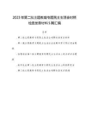 2023年第二批主题教育专题民主生活会对照检查发言材料5篇汇编目录.第二批主题教育专题民主生活会对照检查发言材料.第二批主题教育专题民主生活会会前集中学习研讨发言提纲.指导组在第二批主题教育专题民主生活会上的点评讲话提纲.副市长在第二批主题教育专题民主生活会上的剖析发言.第二批主题教育专题民主生活会对照检查发言提纲第二批主题教育专题民主生活会对照检查发言材料按照党中央和省委、市委关于第二批主题教育的统一部署,我坚持以身作则、以上率下,积极参加主题教育,深刻学习领会XXX新时代中国特色社会主义思想的核心要义和深刻内涵,为开展专题民主生活会打下了坚实的思想基础。按照市委《关于高质量开好主题教育专题民主生活会的通知》要求,我在广泛征求意见、深入谈心谈话、剖析典型案例的基础上,结合思想和工作实际,对照6个重点方面,认真开展党性分析,深入查找自身问题,剖析问题根源,思考整改措施。现将有关情况报告如下:一、存在的主要问题(-)理论学习方面。一是思想建设抓得不紧。对马克思主义基本原理的学习不够系统,对新时代如何坚持两个结合推进实践基础上的理论创新的思考还不深入。把思想建设作为党的基础性建设来抓落实得不够,忽视了对党员干部的理想信念教育,认为干部抓好本职工作、完成目标任务就行了,跟党员干部谈理想、谈信念太虚了,与干部职工谈的更多的是业务,致使党员干部业务学习抓的比较紧,理论学习有所放松,自觉用党的创新理论滋养初心、引领使命上做得还不够。二是学用贯通抓得不实。在平时工作中,满足于用已有的经验知识来处理新的问题,不善于运用XXX新时代中国特色社会主义思想分析问题、解决问题。如XXXXXX关于信访工作的重要论述和重要指示批示精神是XXX新时代中国特色社会主义思想的重要组成部分,但我对怎样畅通和规范群众诉求表达渠道、利益协调和权益保障通道的理解还不透彻、工作方法还不多,不善于处理好信访问题。(二)政治素质方面。一是党性意识不够强。对党性锻炼的长期性认识不足,未做到活到老、学到老、改造到老,没有内化于心、外化于行,在增强政治意识、保持政治定力、把握政治方向、承担政治责任、提高政治能力方面有所懈怠,政治能力出现下滑而不自知,致使工作有时不够深入,满足于完成工作指标任务,满足于面上不出问题。二是意识形态守得不严。意识形态工作满足于不出问题,对干部职工的思想动态掌握的不够全面,对一些错误言行没有进行坚决斗争,在疏导干部思想情绪、引导干部坚定理想信念、发扬艰苦奋斗精神、提振干部精神面貌等方面还做得不够,干部职工的凝聚力、向心力还需进一步提升。(三)能力本领方面。一是开拓创新意识不够强。在工作中未充分发挥积极性,多数情况下是等待领导分配任务才采取行动,缺乏主动性、积极性和责任感。对现状感到满足,不够积极进取,推动工作的思路不够活跃、站位不够高、格局不够大,仅满足于不出大的问题,导致工作亮点不足。二是工作执行力有差距。进入新时代以来,党内各项法规制度不断出台,覆盖各个方面,虽然我也在积极学习这些政策规定,但由于政策门类众多,内容变化大,始终没有能够进行系统学习和深入研究,工作安排有时仍然较为随意,一些不合规定的惯例行为未能及时得到纠正,一些干部身上存在的违法问题未能及时解决。(四)担当作为方面。一是攻坚克难的决心不够坚定。面对复杂的问题和利益格局,未能付出足够的努力,缺乏多样性的解决方法,进展不尽如人意。如对群众反映突出的一些环境污染问题,不能很好处理高质量发展与高水平保护的关系,对推动能耗双控向碳排放双控转型缺乏有效抓手,对深入治理一些支柱产业、龙头企业的污染问题缺乏攻坚克难、一抓到底的决心,导致一些问题久拖不决。二是学习先进典型存在差距。虽然能够深入学习先进典型如张富清、黄文秀的事迹,也理解要以典型和榜样为榜样,激发自己的前进动力。但常常感到这些先进典型似乎与我们距离太远,认为我们无法学习他们,因为我们所处的环境不同,也就未能时刻将自己的行为和工作与先进典型进行对照,以找出差距、推动改进和提升。(五)工作作风方面。一是工作激情不高。随着年龄的增长,积极向上、锐意拼搏的工作热情有所减退,工作安于现状主动性和创造性随之淡化,有时习惯于用老办法解决新问题,用老经验解决新矛盾,大胆探索的方式方法比较少,理论知识还有所欠缺。有时习惯于等,等工作部署,等上级推动,紧追感、压力感和忧患意识不强,超前意识不够强。二是宗旨意识不牢。工作中唯上不唯下的风气没有根本扭转,践行党的群众路线还存在差距,没有真正做到想问题做决策办事情时把群众拥不拥护、赞不赞成、高不高兴、答不答应作为一切工作得失的根本标准。突出表现为在处理信访事项时,不能正确认识信访是送上门的群众工作,认为群众反映的都是老大难问题,自己没办法解决,对信访群众缺乏耐心,影响了党员干部的形象。(六)廉洁自律方面。虽然
