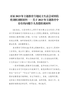 开展2023年主题教育专题民主生活会对照检查剖析剖析材料——关于2023年主题教育中存在的问题个人查摆检视材料XXX指出,以县处级以上领导干部为重点在全党深入开展学习贯彻新时代中国特色社会主义思想主题教育,是贯彻落实党的**大精神的重大举措,对于统一全党思想、解决党内存在的突出问题、始终保持党同人民群众血肉联系、推动党和国家事业发展,具有重要意义。我对照学习贯彻XXX思想主题教育要求,结合个人思想和工作实际,突出学习重点,深悟精神内涵,深刻进行党性分析,全面梳理学习研讨查摆的问题、对照党章党规找出的问题、走访调研发现的问题、群众反映的问题、谈心谈话指出的问题,汇总形成6个方面14个突出问题,具体情况如下:一是学思践悟主题教育还有差距。在平时的工作学习中,存在重业务学习和党的方针政策学习,轻党的理论学习的情况;存在应付式作业式的学习心态,在学习XXX视察XX重要讲话重要指示精神时,存在不够深入、系统、全面等问题,没有真正用党的最新理论武装头脑、指导实践、推动工作,没能很好地做到活学活用、学用结合、学以致用。二是贯彻落实上级精神还不到位。由于理论学习不到位,导致思想认识和工作方法存在一定的片面性,学习只是满足于会议文件,工作标杆不高。工作中能够坚持正确的政治方向,但在具体工作中,大局意识不强,没有深刻领会学习贯彻XXXX,没有把XX具体实际与中央重大决策部署结合起来,更好地开创全X经济社会发展的新局面。三是加强政治建设方面存在短板。在工作中能够严守政治纪律规矩,但在政治敏锐性上还有差距,存在对上级精神理解不透彻的问题。对一些不健康言论,没有及时出面批评制止,存在好人主义,忽略了对分管领域党员干部政治规矩方面的约束和管理,只有原则要求,没有具体入微。对社会上一些不良风气的危害性认识不到位,有时认为事小警惕性不够高,落实制度、执行政策监督管理不到位。四是党风廉政建设工作不够有力。在落实全面从严治党主体责任上还存在主观主义和懈怠思想等问题,抓党建工作主要是按照上级要求,按部就班来做,工作方式和手段落后,缺乏创新性。在党风廉政建设主体责任落实上存在麻痹思想,压力传导还不够,对日常工作中廉洁方面的监督管理失之于宽、失之于软。五是履行政治监督责任还有弱项。对两个责任的重视程度还不够,在落实监督责任上,对领导班子自身监督比较严格,但是对普通党员干部日常监督比较少,缺乏行之有效的具体措施。六是落实八项规定精神不够有力。能够严格执行中央八项规定精神,坚决抵制四风,但仍有不足的地方,比如,对一些属于工作小节、生活小事的苗头性、倾向性问题还不够重视,在人情往来方面不够节俭,有朋友宴请随份子的跟风现象。七是开展党内政治生活不够严肃。在开展党内政治生活过程中,尤其是交流发言时,自己与其他班子成员缺乏深层次互动和思想交流,联系实际不紧密,政治敏锐性和洞察力有所欠缺,党内政治生活质量还有一定提升空间。八是分管领域组织建设不够过硬。抓分管领域党组织方面压力传导得还不到位,存在层层递减的现象。分管领域党组织标准化和规范化建设还不够过硬,党建工作不够扎实。分管领域党组织在发挥党的群众工作优势和党员先锋模范作用方面体现的还不充分。九是分管领域干部建设还有短板。没有抓实分管领域干部队伍建设,导致少数党员干部把自己等同于普通群众,缺乏干事创业的激情和动力,工作积极性、主动性、创造性不高。十是思想政治理论武装有待加强。理想信念教育不够,没有真正把自己融进去,没能够把学习、思考、实践紧密结合在一起。平时在具体事务上投入的精力较多,一定程度上忽视了政治理论学习和理想信念的提高。对新时代学习新理论、新知识的强烈愿望和劲头不足,对深研细钻、学深悟透还不够,没有很好地发挥理论对实践的指导作用。十一是初心使命宗旨观念有待树牢。片面认为履职尽责就是做好分管联系工作、完成上级安排的任务,服务群众的主动性不够,缺少身体力行的自觉行动。主观上有深入基层、服务群众的意愿,但真正落实起来做得不够到位,还有一些差距。十二是干事创业担当意识有待提升。主责主业意识还不够强,工作上缺乏奋发作为的实干担当,总认为有党政主要负责同志统揽全局、班子成员具体分管,自己做好分内事就行,参与全局工作的主动性积极性不高。求实求效的韧劲不足,有时存在重部署、轻落实,重形式、轻实效的现象,对一些工作跟的不紧、督的不严,推动力度有待加强,缺乏久久为功的工作韧劲。十三是奋发进取攻坚精神有待激发。在工作中有时习惯于照抄照搬上级的做法推进工作,攻坚克难的勇气和开拓进取的精神不足,在先行先试、推进工作创新方面做得不够。工作有时不够深入,满足于面上不出问题,服务意识不够强,创新性措施不多。十四是实事求是调查研究有待强化。在工作中还缺乏积极主动和求实创新的意识。片面地以为,只要循序渐进,按照上级要求处理好平常事务