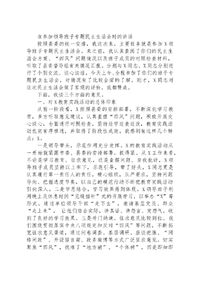 在参加领导班子专题民主生活会时的讲话按照县委的统一安排,我这次来,主要任务就是参加X领导班子专题民主生活会。来之前,我认真查阅了你们的民主生活会方案、四风问题情况以及班子成员的对照检查材料,听取了县委督导组有关情况汇报。分别与X同志、X同志分别进行了个别交流、谈心谈话。今天上午,全程参加了你们的班子专题民主生活会,对情况有了比较全面的了解。刚才,X同志对这次民主生活会做了客观的评价,我都赞成。下面,我谈三个方面的意见。一、对X教育实践活动的总体印象从前一阶段看,X按照县委的安排部署,不断深化学习教育,多方听取意见建议,认真查摆四风问题,积极开展交心谈心,全面进行对照检查,坚持边学边查边改,教育实践活动扎实有序推进,并取得了阶段性成效。我感到有这样几个特点:X。一是领导带头,示范作用充分发挥。X的教育实践活动从一开始就紧跟市委、县委的安排部署,抓得紧。从X工作来看,不论是学习教育、征求意见,还是查摆问题、自我批评,X领导班子成员坚持以上率下,示范引导,带了好头,X同志更是认真履行第一责任人的责任,精心组织,从严要求,坚持问题导向、把握进度节奏,以自己的模范行动不断把教育实践活动引向深入。二是学思结合,学习效果得到体现。X领导班子利用晚上及休息时间见缝插针式的开展学习,以举办X等形式,通过单位领导干部走下去,邀请基层党员、群众走上来, 让他们结合实际,讲真话、讲怨言、发怨气,收到了良好的学习效果。三是开门纳谏,征求意见比较到位。我们围绕贯彻落实中央八项规定和反对四风等问题,不断拓宽征求意见渠道,通过问卷调查、基层调研、座谈把脉、网络问政、开设留言箱、政务微博等方式广泛征求意见。切实聚焦四风,找准了地方病、个体病。四是即知即改,注重解决实际问题。针对群众反映强烈的X问题 ,我们开展了X专项整治,针对纪律作风懒、涣、散的问题,我们修订完善了《X干部考勤》、《X规定》等制度,针对网上反映X问题,反映的X的问题,都及时整改到位。还有许多群众反映的突出问题,我们都及时进行了交办、督办,并对群众进行了及时回应。五是创新载体,活动特色明显。X在推动活动上采取了一系列比较务实管用的措施。比如,在学习教育环节提出X活动,增强了学习效果,在征求意见环节提出了X活动,听取群众心声;先后又提出了践行三严三实X等X项活动,强化干部作风建设,成效明显,增强了群众观点;同时,把规范低保作为即知即改问题开展专项整治活动,把教育实践活动的课堂搬进成核桃树嫁接换优X万株,把完成200万株核桃树嫁接换优作为教育实践活动的主要内容之一等等,走实了群众路线。而且我们这些好的做法,既立足地方实际深化了活动,又宣传了我们X,并且被X等新闻媒体全文转载。六是真督实导,活动扎实有序。我们组建的X个督导组,按照压茬推进的要求,安排X个村(二级局)陆续有序启动,同时,督导组敢唱黑脸、敢紧螺丝,层层传导压力,靠实工作责任,严格审查文件材料、参加集中学习和讨论交流,提出意见建议,既尊重又指导,既交任务又教方法,既支持帮助又传导压力,确保了教育实践活动按照规定要求,规范有序推进。七是两手齐抓,重点工作有序推进。我们狠抓了电子商务、信访维稳、基础设施建设、新农村建设、环境卫生整治、社会管理创新(局职能工作)等工作,全面促进全镇(局)协调发展,使人民群众得到实惠、社会更加和谐,赢得了广大群众好评,同时其他各项重点工作也以空前的力度加以推进。二、对班子专题民主生活会的几点感受开好专题民主生活会,是抓实教育实践活动第二环节的关键。前期,X领导班子就通过各种渠道征求到了X意见,梳理归纳后为X条,其中涉及四风方面X条。X领导班子成员坚持共性问题集体班子认领,个性问题结合分工主动认领,体现了大家的担当意识和大局观念,值得肯定。X班子成员共征集到了X条意见,梳理归纳后为X条,其中涉及四风方面X条,每个人至少在X条以上,体现了大家深挖细照的理念。刚才,X同志代表市发改委班子进行了对照检查,各党组成员也作了自我检查,开展了相互批评,整个会议主题明确,重点突出。我认为是一次质量高、效果好的民生生活会,起到了出出汗、红红脸的作用,实现了团结-批评-团结、领导班子更高层次上团结信任的目的。从大家的发言,X同志的点评意见,综合会议的整体情况,我认为有这样几点值得肯定。一是会前准备充分扎实。从会议进行的情况,我能明显感觉到大家在会前是下了大功夫的,没有充分的思想准备和扎实的工作准备,不会有今天会议的效果。无论是发言的内容,还是发言的质量,都体现了较高的标准,说明X对开好这次民主生活会是做了充分准备的,说明X领导班子各成员从活动一开始就把自己摆了进去。二是剖析深刻追根溯源。各位班子成员都紧密结合思想和工作实际,从三观、理想信念、宗旨意