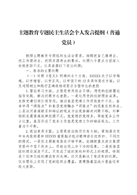 主题教育专题民主生活会个人发言提纲(普通党员)按照主题教育专题组织生活会要求,按照把自己摆进去、把工作摆进去、把职责摆进去的要求,对照六个重点方面深入检视差距不足,认真查摆以下突出问题: 一、存在的主要问题(一)对照《意见》明确的6个方面、XXXXXX关于以学铸魂、以学增智、以学正风、以学促干的12条具体要求方面,以及对照树立和践行正确政绩观要求方面存在的差距1.理论学习方面。主要是学用结合不够,用党的创新理论指导实践、解决问题存在差距。一是运用党的创新理论成果,发挥党建引领引领作用,推动基层党建工作质效提升不足,自身学用两张皮和基层党建融合两张皮的现象依然存在。二是运用普遍联系和辩证的观点方法观察解决问题不够,对事物的发展普遍规律把握不足,就党建抓党建多,导致党务工作占比重,基层形成了党务工作就是党建工作的错误观念,工作着力不平衡。2.政治素质方面。主要是政治执行力有欠缺,贯彻落实党中央决策部署和XXXXXX重要指示批示精神存在打折扣、不到位的情况。一是抓主题教育落实不够平衡,前期把重点放在集团党委和中层干部身上,导致出现上冷下冷的现象。二是抓基层组织建设深度不足,只完成了组织架构和形式上的梳理,特别是个别单位组织建设有形无神,还只是解决了有没有的问题,仅在理论上实现了党的组织全覆盖,离建强基层战斗堡垒还有较大差距。3.能力本领方面。主要是新发展理念树得不牢,推动和促进基层党务干部队伍建设高质量发展有差距,对人才是第一资源理念有认识,但对解决调研和督查中发现的基层党务干部总量少、整体业务能力水平低、综合素质不高等问题,实招硬招不够。一是战略思维、系统思维不强,对科学规划党建人才队伍发展目标的重要性认识不足,格局站位不高,把基层党务干部建设工作都丢给了组织部门和基层单位,给压力多,帮助谋划想办法少,使得基层党务干部成长慢,难以支撑和适应企业改革发展需求,更谈不上高质量推进党建工作落地落实,实现党建引领、党建融合,导致目前集团基层党的建设工作总体质效不高,工作落实不够平衡(X、X稍好),少数单位党建工作宽松软(X、X),个别党组织党的建设亟待加强(X甚至是出现软弱涣散倾向)等问题。二是创新思维不强,对解决党务干部业务水平、综合能力素质提升难,党务干部队伍不稳定,基层党建工作人少事多,工作压力大、成效少等问题,缺少对新思路、新策略、新办法的研究,还是走老路、靠经验多一些,存在思维定势,思维的格局没有打开。三是底线思维不强,对抓好党建是最大政绩的理念说得多,但从底线思维的层面去传导压力还不够,使得这一理念在基层还不深入人心。4.担当作为方面。主要是工作中还有瞻前顾后、畏首畏尾的情况。认为当前集团和子公司内外交织各种问题,或是受客观因素制约,对落实意识形态工作责任、党员教育管理、组织建设等方面的基础工作明知有差距、有问题,却不敢用力,压得不紧不实,导致在基层出现了党建工作是软指标,应该为业务工作让路的苗头倾向。5.工作作风方面。主要是宗旨意识不够强。一是调查研究不经常、不深入,对企业迅速变化的客观实际了解不深、感知不真,导致抓工作、抓落实针对性、有效性不够,使得基层单位对党建的认识还停留在抄抄写写上。二是落实党中央决策部署简单化、一刀切,还有照抄照搬、上下一般粗,文件传达文件的情况。三是对党务条线的同志在精神上关心关注不够,对如何有效缓解党务工作同志工作压力、精神压力做得不多,服务不够,导致集团党务干部存在流失情况。比如集团组建以来,7个二级子公司中,仅1名专职党务干部,其余均为兼职党务工作人员,并始终处于超负荷的工作强度,截至目前,仅2个单位(X、X)党建工作人员保持稳定,其他单位均出现专职和兼职党务干部主动申请调岗或离职的情况,有的单位不到一年时间同一岗位已调整4人次(X),加之基层党建工作基础和工作队伍本就薄弱,极大增加了基层党建工作开展落实、提质增效的难度。6.廉洁自律方面。主要是纪法意识还有薄弱环节,认为自己不存在利用权力和影响力谋私贪腐的情况,放松了思想上的标准。7.树立和践行正确政绩观方面。主要是没有真正做到对上负责与对下负责相统一,还有唯上的思想和报喜不报忧的情况。(二)典型案例剖析对照X严重违纪案件,联系个人思想、学习和工作实际,深刻查摆自身存在的差距不足,主要存在以下突出问题:一是对党性锻炼重要性的认识还不深刻。认为自己每天读读写写党建材料就可以坚定政治信仰、锤炼党性意识、提升政治能力、筑牢廉洁意识,没有认识到这种思想本身就是一种自以为是的形式主义。二是对协助党委落实两个责任的认识还不深刻。还习惯于把推动党风廉政主体责任落实,丢给纪检部门,推动工作落实中对纪检工作投入精力少,对基层党风廉政建设关心用力不足。三是自觉接受监督的认识还不深刻。存在,认为自己在清水衙门,又是做党建工作,没有需要