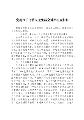 党委班子考核民主生活会对照检查材料根据今年民主生活会的要求,结合个人实际,我重点从三个方面作以汇报。一、去年民主生活会个人批评意见整改措施落实情况去年民主生活会上书记、副书记以及其他委员本着对组织对工作认真负责,对我个人关心关爱、培养帮带的角度出发,对我进行了批评教育,使我深受触动,深知自身仍有许多差距与不足需要改进完善。主要体现在狠抓工作落实、与部属沟通交流、对部属培养帮带、深入联系基层、分管工作亲疏有别等5个方面12个问题,针对以上问题,在今年工作中我着重加以逐步整改提高,除深入联系基层、分管工作亲疏有别这两方面,我认为还存在一定差距外,其余问题已整改到位。二、个人对照检查情况(一)带头学习贯彻XXX新时代中国特色社会主义思想方面。成长在这个伟大的新时代,我深切地感受到无比的幸运和自豪,没有XXXXXX就没有我们党的今天,没有XXXXXX就没有我们国家的强盛和民族的复兴,没有XXXXXX就没有我们今天的幸福生活和社会的安定和谐。我能够从一名社会青年成长为一名党员领导干部,离不开党的教育培养,离不开组织的关怀信任,我始终胸怀感恩,真心信赖拥戴、看齐追随、维护核心,始终把学习贯彻XXX新时代中国特色社会主义思想作为首要政治任务,注重理论学习,加强思想改造,强化政治责任,提高政治本领。但我也深知,自身距离标准要求仍存在一定差距:一是系统学习还不够。对XXX新时代中国特色社会主义思想以及有关规定要求,都能做到第一时间学习并执行,但真正从源头上系统学习、反复咀嚼还有差距,有时满足于零碎式、浅表式、应急式的学习,往往是学讲话读原文多、背记经典话语多,真正在学习广度、深度、认真程度上还需努力。二是体会领悟还不够。XXX新时代中国特色社会主义思想博大精深并不断创新发展,因平时多忙于工作,专门抽时间体会感悟严重不足,感觉自身在学深悟透、融会贯通上差距很大,对其中蕴含的重要思想、观念、方法没有真正的领会、学到手,时常有慢半拍、跟不上节奏的感觉。三是转化运用还不够。工作中,深感对如何转化运用其观点、方法指导实践,特别是破解重难点矛盾问题,办法还不多,没有真正做到学以致用、知行合一。(二)带头贯彻落实党中央和XXXXXX重要指示批示和决策部署方面。党中央和XXXXXX重要指示批示决策部署,代表着党中央的权威,我们必须坚决贯彻执行。在这个重大原则问题上,我的认识是清醒的,立场是坚定的,行动是坚决的。主要存在2个方面不足:一是担当落实还有差距。工作中,往往存在对于自己比较熟悉的事项和领域抓的多,对于一些不熟悉或陌生的事项和领域抓的少的问题;有时也存在抓工作跟踪问效不够的现象。比如,我对经济工作比较熟悉,关注的比较多、要求比较高、指导的比较具体,反观对党务工作有时关注的比较少,指导的力度还不够,有时满足于过得去。有时对一些周期长见效慢的工作持续跟踪督导抓得不够,存在虎头蛇尾、时紧时松的现象。二是开拓创新还有差距。思想革命做得不够,思想观念和思维方式还没有彻底地从过去的老观念和惯性思维中转变过来,对一些新理念新知识新技术接受得慢、了解不够深。老观念、老习惯、老办法仍不同程度存在,导致部分工作执行起来还不够高效顺畅,研究探索还不够。创新能力还有差距,眼界和视野不够开阔,有些创新举措的实质推动力度还不够大。(三)贯彻六个必须要求,落实党的建设会议精神方面。在党的建设会议上深刻指出的四个不纯七个弱化五个方面差距五个不够问题,深入揭示了侵蚀党的肌体、危害我党本色、影响全面建设发展的顽瘴痼疾,我们必须以自我革命的精神扎扎实实地抓好整改。我始终以忠诚之心坚决贯彻党的建设会议精神,以问题为导向,抓好整改,补齐短板,弥补不足。主要存在3个方面不足:一是参加党组织生活质量还需提高。虽然能够按时交纳党费,按规定落实双重组织生活,但有时在思想深处还存在特殊感,有时不自觉的将行政职务带入党内生活,谈经验、谈感受比较多,汇报思想不深透,主动揭短亮丑、发动大家批评自己做得还不够,与同志们感情交流还不够。二是自身党性锤炼还需锤炼。作为一名入伍16年的党员,总认为接受党的教育和培养多年,理想信念坚定,热爱党、热爱祖国、热爱人民,世界观、人生观、价值观基本定型了,在未来现实困难考验中,自身也不会出大的问题。因此,工作中学习掌握基本理论、基本观点多,立足自身实际,把自己摆进去,主动改造主观世界、纠正党性和人格偏差不够经常,往往对部属问题讲的多,对自身问题反思的少。三是依法从严管理力度还需加强。工作中,有时还存在讲源头出处、凭经验习惯、按以往惯例的现象,对分管工作领域的相关法规制度掌握还不够全面,对一些新出台的制度规定学习掌握不够及时准确。对一些发现的问题,较真碰硬的精神不足,存在拉不下脸、提醒不够的问题,追责问责力度还不够。(四)严格贯彻执行中央八项规定及实施细则方面。