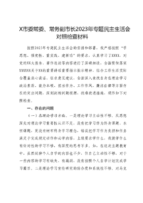 X市委常委、常务副市长2023年专题民主生活会对照检查材料按照2023年专题民主生活会的安排和部署,我严格按照学思想、强党性、重实践、建新功的要求,认真学习了XXXX,对党的XX大报告、著作选读等内容进行了深研细读,全面贯彻落实XXXXXX关于XX的重要讲话重要指示批示精神,结合工作生活实际全覆盖谈心谈话、征求意见建议,全面深入查找自身在理论学习政治素质、能力本领、担当作为、工作作风、廉洁自律等方面存在的突出问题,深刻剖析问题根源,找准改进措施,现作如下对照检查。一、存在的问题(一)在理论学习方面。一是理论学习主动性不够。从思想深处对理论学习重要性认识不足,没有把学习作为终身课题、永恒课题,更没有树牢终身学习理念,错误把学习作为负担和任务满足于完成规定动作和必学内容,上级要求学什么,我就学什么有针对性的学习不够,有深度的思考不多。如,在这次主题教育中,虽然延伸个人自学的内容也不少,但自己主动性不够,对于一些内容的学习有缺失、有漏洞,没有按照个人自学计划完成学习篇目。二是理论学习宣传研究的结合度和系统性不够。对马克思主义基本原理同具体工作实际相结合领会还不深不透,学思践悟、知行合一、学用转化不够,理论学习成果还只停留在思想上未充分地实践于实际工作与行动中。如:自己经历了多岗位锻炼在遇到工作难题时,习惯于凭老经验、老办法,没有结合最新的理论成果想点子、做打算,导致一些工作推动起来南辕北辙(二)在政治素质方面。一是政治站位还不够高。在深刻领会两个确立的决定性意义,增强四个意识、坚定四个自信、做到两个维护方面还不深不细,往往讲得多、表态多、安排部署多,但在贯彻落实上还存在漏洞和盲区,闭环管理机制还不健全。如,在化解金融风险方面,更多考虑具体的实际困难,没有站在全局和长远角度看问题,在思想上认为这个任务是长期复杂的,导致化解债务任务完成率不高,甚至还有新增债务的情况。二是落实重大事项请示报告制度不严格。作为市委常委、常务副市长,对严格执行重大事项请示报告制度重要性认识不够,没有把请示报告作为强化政治意识、提高政治能力、履行政治责任的重要载体,特别是对自己分管领域召开的一些会议等报告的自觉性不强。如,省委组织召开了固定资产投资视频会议会后未形成相关会议情况报告呈送地委和政府,导致主要领导信息不对称,不能及时为下一步部署工作提供参考依据。(三)在能力本领方面。一是研究政策能力不强。作为常务副市长,个人综合素质还不能满足当前工作需要,特别是面对全市经济社会高质量发展的新形势新机遇,自己对制度创新、科技创新、产业发展等前沿知识和政策掌握不足,在推动一些工作方面缺乏前瞻性思考。如,对标中央经济工作会议精神,特别是稳中有进、以进促稳、先破后立的总要求理解把握不深刻,对于如何稳预期、稳增长、稳就业没有研究谋划出具体可行的政策措施还存在等靠思想。二是贯彻新发展理念有差距。在贯彻新发展理念上不够准确全面透彻,科学精准做好双统筹还有一定差距,在转变经济发展方式、调整经济结构、深化供给侧结构等方面研究不深入。如,全市三次产业结构比重不合理,中间小两头大,与财政收入不匹配,一产产业化水平低,二产主要依赖能源经济,三产辐射带动能力不足。(四)在担当作为方面。一是在服务大局上还存在局限比如,在贯彻执行中央路线、方针、政策和上级决策部署时,有时存在一定的本位主义思想,局限于自己负责的工作,首先考虑如何从本领域角度去推动落实,缺乏从战略的高度,用辩证的思维,围绕中心工作、发展大局的角度去思考和推进。如,在开展粮食购销领域专项整治时,虽然扎实开展自查,但职能部门作为主体未能发现粮食收购、存储、销售环节等方面存在的问题线索线索来源主要是巡察、监督检查和审查调查。二是创新动力不足结合十四五经济社会发展主要目标和2035年远景目标科学谋划好政府工作还不够,对如何聚焦重点任务协商,着力凝聚广泛共识为我市经济社会发展献计出力谋划还不深不细不透。如,作为招商引资分管领导,在创新工作思路,有效落实谁签约、谁负责、谁主抓、谁落实责任,处理好招进来和落下去的关系方面做得还不够。(五)在工作作风方面。一是工作作风改进上还不够有力,发扬老一辈革命家谦虚谨慎、不骄不躁、艰苦奋斗的优良作用还有待提升,在工作、生活待遇上不愿降低标准,特权思想还没有根除。对队伍管理中厉行勤俭节约监督检查不到位,发现办公用品使用方面存在浪费现象解决的办法不多、效果不明显,落实中央八项规定精神、反对四风问题作风还不够坚决二是深入群众不够经常,服务群众不够主动。工作中能够积极深入基层开展调研、走访群众,但走访群众覆盖面不够广,听取群众意见建议不充分。对于群众存在的实际困难,向有关职能部门反映多,对问题的后续追踪解决抓的少,导致部分问题没有得到有效解决。如,在安排部署事关群众切身利益