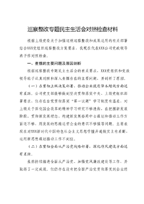 巡察整改专题民主生活会对照检查材料根据上级党委关于加强巡视巡察整改和成果运用的有关部署结合XXX党组织巡察整改方案要求,我现在代表XXX公司党政领导班子作对照检查。一、查摆的主要问题及原因剖析根据巡察整改专题民主生活会的有关要求,XXX党组织和党政领导班子认真对照和深入查摆存在的主要问题,并剖析了原因。(一)在贯彻上级决策部署,推动企业提质降本增效方面还有差距。公司党支部能够做到坚决贯彻落实中央、上级党组织部署要求,但存在自觉贯彻落实第一议题学习制度有温差,对上级关于深化国企改革的精神学习研究不够透彻,在把握新发展阶段、贯彻新发展理念、构建新发展格局中去谋划和推动工作方面还不够,用发展的思维运营企业的意识不够强等问题。主要表现在对XXX新时代中国特色社会主义思想学懂弄通做实上有差距,运用新思想谋划推动工作不到位。(二)在贯彻全面从严治党战略部署,深化作风建设方面还有差距。虽然持续推进全面从严治党、加强党风廉政建设等工作,并取得了一定成效。但仍存在没有把全面严治党贯彻落实到企业经营管理的全过程,用制度管人管权管事的长效机制不够完善,压力在企业各个层级传导不够有力等问题。主要表现在:履行管党治党政治责任不坚决,责任传导层层递减,班子成员履行全面从严治党一岗双责意识不够强。(三)在防风险守底线促发展,防控重点领域合规风险方面还有差距。虽然不断夯实企业合规管理,提升干部职工合规管理意识及法律风险分析研判能力,多点发力筑牢合规经营底线,但是在持续聚焦企业合规管理建设,不断完善企业内控体系,积极培育合规文化,强化重点领域合规管理,护航企业高质量发展方面还存在问题,主要表现在:制度废改立工作不扎实,内控管理机制不完善;内控管理不够严密,重点领域风险点多,未设置重大风险预警指标并日常监测。(四)在贯彻新时代党的组织路线,高质量开展党建工作方面还有差距。XXX公司支部坚持用XXX新时代中国特色社会主义思想武装头脑,较好地发挥了党支部战斗堡垒作用和党员先锋模范作用,但是对新形势下管党治党的思路、方法研究不深,落实践行新时代党的组织路线,把各级干部队伍建设好,建设强还有差距,主要表现在:支部参与三重一大事项决策程序不规范,党的领导作用发挥不够充分,董事会、经理层及党组织之间权责不够清晰;落实党建工作责任力度不足,党建工作规范性有待提升,落实党建工作专项行动有差距;落实党管干部要求不严,选人用人工作不规范,落实干部提拔任用不规范等。(五)落实巡视巡察等上级整改责任不够有力,深化标本兼治不够到位。支部深刻认识到巡视、巡察整改不是选择题,而是必答题,均能按进度认真推进巡视巡察整改工作。但是在推进过程中,还存在对整改认识不足,站位不高,主体责任未扛牢,对待整改工作没有完全把自己摆进去,标本兼治,举一反三能力不强,跟踪问效不到位等情况。具体表现为:巡视巡察整改责任扛得不牢,常态化长效化整改机制不够健全;举一反三巩固整改成果不到位,上级检查反馈问题整改不彻底。深刻剖析产生以上问题的原因,主要有以下四个方面:一是抓思想政治学习的力度不够。领导班子在政治理论学习方面,与党中央和上级党组织还有一定差距。班子成员主观上对加强理论学习的紧迫感认识不足,多依赖工作经验开展工作,对于怎样运用创新理论统领发展全局来谋划工作、解决问题还缺乏长远性的研究,用理论成果指导实践和实际工作方面还有差距。二是抓政治纪律意识的力度不强。XXX党组织虽然高度重视纪律规矩执行和落实,也围绕推进全面从严治党制定了一系列规章制度,但在实际操作中还存在对纪律规矩的理解和掌握不够深入系统,在制度建设上,责任意识上存在疏漏,导致制度建设不完善、不到位,制度执行不够有力。三是责任意识需要进一步提升。班子成员对XXX公司工作开展缺乏总体的、前瞻性的谋划和思考,面对瓶颈难题,存在知识恐慌,思路僵化、对策不多。在贯彻落实各项决策部署上,被动机械执行的多,主动作为的少,思想不够解放,创新精神不强,开拓意识不足。主体责任意识、一岗双责意识还需要进一步强化。四是工作作风不够扎实。没有把作风建设形成自觉养成习惯个别干部工作中仍存在有安排、无落实,有计划、无检查,有标准、无考核等情况。一些干部思想不解放,自我加压不够,工作惯用老办法、按部就班、求稳怕变,缺乏钉钉子精神和滴水穿石的韧劲,从而导致担当精神不够、干事创业的精气神不足。二、下一步整改措施及努力方向针对查摆出来的问题及其原因,公司党政领导班子将主要采取以下措施进行整改:一是进一步强化政治理论学习。一是要把加强理论学习作为坚定理想信念,提高理论水平的首要途径,始终把学习贯彻XXX新时代中国特色社会主义思想和党的XX大精神摆在首位,统一思想认识,提高政治站位,坚决贯彻落实上级各项重大决策部署,做好国企改革工作,勇于担当作为,自觉用理