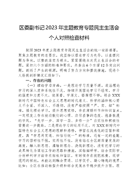 区委副书记2023年主题教育专题民主生活会个人对照检查材料按照2023年度主题教育专题民生生活会的统一安排部署,聚焦主题教育的总要求,我坚持以理论学习为先导,以查摆问题为导向,以整改落实为根本,紧紧围绕本次民主生活会的专题,紧扣六个方面的标准和要求,共查出6个方面12条突出问题,剖析了产生的根源,明确了努力方向和整改措施,现将个人检视剖析情况汇报如下:一、存在的问题(一)理论学习方面。一是理论学习质量不高。政治理论学习的深入度和系统性不足,持续开展理论学习不经常,学习的强度和力度不大,读原著、学原文、悟原理不够,领会XXX新时代中国特色社会主义思想的时代意义、科学内涵和核心要义不全面、不深入、不透彻,没有严格按照严、实、细标准,强化理论学习,提升思想觉悟,存在薄弱环节和知识盲点,一定程度上存在被动敷衍的心理、应付差事的态度、拖沓散漫的学风。先学一步、深学一层、多悟一分自觉性和积极性需要进一步提高。二是理论学习的运用不足。对XXX新时代中国特色社会主义思想的理解和感悟,停留在浅表化的层面和维度,离学思用贯通、知信行统一的标准,还有一定的差距。学习的目标性不强,实用性不佳,没有站在全区高质量发展的高度,融入新思想、灌输新理念、浇筑新理论,没有把学习的成果转化为谋划工作的思路和措施,深钻细研学、结合实际学、分析研判学方面存在短板和盲区,有时候存在挑肥拣瘦、现学现用的倾向,未能达到融会贯通、以学促干、凝心铸魂的境界。比如:全区在推动转型升级和综合发展水平稳步提升方面,理论指导实践的标准和要求不高,缺乏新理论、新思想、新论断的贯穿融入,比学赶超、跳起摸高的学风不浓,以实干为导向、以实效论英雄的理念没有筑牢。(二)政治素质方面。一是政治的执行力有待于进一步提升。虽然本人能够从思想上认识到提高政治执行力的重要性,但在执行落实上却出现了松软状态,从政治上观察和处理问题的力度不大,缺乏坚定的政治立场、过硬的政治态度、明确的政治方向,存在落实不严不细不全的现象。具体表现在:因受本本主义和经验主义的影响,有时对上级政治决策的理解有一定的偏差,存在朦胧化和片面化的特征。对自己关注的领域,政治站位不高,习惯于避重就轻、挑肥拣瘦的套路,遇到急难险重问题,存在畏难情绪和逃避心理,缺乏政治的责任感和使命感。对如何增强四个意识、坚定四个自信、做到两个维护,缺乏全盘统筹的政治格局和思维,需要不断筑牢信仰之基、补足精神之钙、把稳思想之舵。二是政治的敏锐性有待进一步提升。尽管自己能够始终不渝地坚定政治信仰和政治理念,但对意识形态的敏感度不足,存在麻痹松懈和恍惚朦胧的状态,总觉得意识形态是高大上的工作,与全区高质量发展工作距离深远,缺乏必要的警惕性和防范性,往往注重表面,忽视根源,看主流多,看末节少,对党员干部的不良言论,往往是睁一只眼闭一只眼,缺乏必要的指导和矫正,政治的执行力和鉴别力需要进一步加强。(三)能力本领方面。一是统筹发展的能力弱化。尽管自己对全区发展的走势和潜力,有一定的研判和掌控,对上级的重大决策部署,能够按部就班地提前谋划,重点部署、推进落实。但习惯于按部就班、循规蹈矩,创新突破和破圈突围的能力尚有欠缺。对如何借力,推进全区全面发展缺乏缺乏全盘统筹和驾轻就熟的本领和能力,面对发展中的瓶颈问题,跳不出按部就班、因循守旧的圈子,攻坚克难、迎难而上的精神头不足,面对风险挑战的抗压能力和承受能力不足,缺乏沉着应对的应变能力和指挥水平。带动班子成员为全区高质量发展,凝心聚力、团结一致,发挥智慧和能量,扩大延伸服务链条、启动连锁反应、强化服务效能方面功力未发挥到最佳状态,能力和本领略显单薄,求变求新、破圈突围的能力和本领有待于进一步加强。二是履职担当的能力有所弱化。由于自己工作多年,经历过基层、全区各个部门的历练,自认为具备驾驭全局的能力和本领,有信心有实力推动全区高质量发展。但攻坚克难、勇于挑战的勇气和魄力不足,特别是面临工作任务重、压力大、事情多的情况下,心情浮躁,急功近利。有时存在疲于应付和满足过关的思想和心态,缺乏一定的战略思维、辩证思维、系统思维和历史思维,变中求新、变中求进、变中突破的要求没有落实到位,突破思想藩篱、打破惯性思维、突破路径依赖方面思路不够宽,能力不够强,办法不够多,责任落实不够硬。(四)担当作为方面。一是服务群众的动力不足。随着年龄的增长、职位的提升、环境的改变,对自身的要求和标准有所降低,仅仅满足于完成任务,缺乏精益求精、求精出彩的斗志和精神,提高群众的满意率和幸福率方面满足于凑合的状态。走访基层群众越来越少,听群众呼声,了解群众生活动态越来越少,渐渐地与群众的沟通交流存在隔膜效应。比如:对群众关注度高、反映强烈的就业、入学、住房等方面的困难和瓶颈问题,服务群众的意识淡漠淡化,考虑上级领导的意愿较多,