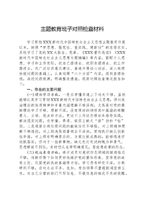 主题教育班子对照检查材料学习贯彻XXX新时代中国特色社会主义思想主题教育开展以来,按照学思想、强党性、重实践、建新功的总要求求,系统学习了党的XX大报告、党章、《XXX著作选读》《XXX新时代中国特色社会主义思想专题摘编》等内容,紧盯个人思想、学习和工作实际,把自己摆进去、把职责摆进去、把工作摆进去,在广泛征求意见建议、普遍开展谈心谈话、深入梳理检视问题的基础上,认真对照六个方面内容,深刻查摆检视,深挖问题根源,明确整改措施。现将对照检查情况报告如下:一、存在的主要问题(一)理论学习方面。一是在学懂弄通上下功夫不够。虽然能够认真学习贯彻XXX新时代中国特色社会主义思想,但对政治理论的实质精神和丰富内涵理解不够深刻,尤其是对党的最新理论学习不够、理解不深,没有很好的领悟其中蕴涵的精髓要义、立场、观点和方法,更谈不上用这些理论来指导实践,解决现实问题,在学懂、弄通、做实上缺乏挤劲和钻劲。二是观察分析处理问题的敏锐性还不够强。对上级精神理解不够透彻,对上级决策部署领会不深刻,贯彻执行缺乏创新性举措,对上级有明确要求的、方案比较成熟的,能够迅速行动抓落实,但对于一些新事物,缺乏先行先试的魄力和勇气,思想解放不到位,有时仍从在等明确意见,要优惠政策的形态。(二)政治素质方面。班子成员对意识形态领域的敏感性还不够,对新形势下如何更好地维护党的整体形象、宣传党的政策主张、巩固党的执政基础等方面,学习思考研究不深,分析研判不够,应对办法不多。比如,有些领导不重视新闻宣传工作,对自己分管的部门不写信息、不报信息的情况不及时提醒,导致有些部门在上稿信息寥寥无几。(三)能力本领方面。一是创造性开展工作不够。有的班子成员在创新工作方法和手段方面欠缺,推进工作的招数和办法,在转变发展方式上危机感、紧迫感不强,凭经验想问题、按老套路办事情的现象依然存在。二是思想解放程度不够。有的党员干部思想还不够解放,习惯于惯性思维,接受新理念比较慢;有的领导干部每天看起来都很忙,但是忙的没章法,又没效果。有的领导干部谋划工作不深入,有时在对接落实上级政策中,习惯于照着文件办事,没规定的时候不知所措,找不到与上级政策机遇的结合点,有规定的时候一刀切,没有做到与实际充分结合。(四)担当作为方面。干事创业激情有所弱化,工作中锐意进取的开拓精神不足,存在精神懈怠现象,只求过得去,不求过得硬,放松了自我净化、自我完善、自我革新、自我提高的要求。比如,面对环境整治、危旧房改造、改厨改厕等一些难度比较大的工作,存在畏难情绪,个别班子成员思想上出现了标准不高、力度不大、消极应付的倾向,只求工作正常推进,不求工作超常突破,缺乏创造性开展工作的动力和干劲,有不求无功、但求无过思想。(五)工作作风方面。一是制度落实不够严格。有的班子成员对各自分管部门的干部要求不严,标准不高,一次性告知制度、首问责制、AB岗制度落实不好,主动服务意识不强,各部门办理的业务事项有些没有形成清单化,面对偏远村的办事群众,还存在等上班再办的情况,导致一些群众长时间在大厅里等待。比如,便民服务大厅,前面一直要求让分管领导做好便民服务中心建设,抓好坐班制度,但在暗访组暗访过程中,依然出现空岗的情况。二是调查研究不够深入。虽然领导班子成员都能够深入各村、重点工作推进现场进行调研,但是有的同志深入基层调研时间不多,解决问题成效不明显,对于一般性问题蜻蜓点水式的了解一下,或者电话了解一下情况,有的同志调研不深入,发现问题不准,提出的处理意见缺乏针对性,没有操作性等等。比如,在重点工作推进中,部分班子成员只是坐在办公室里听汇报,没有深入一线落实工作,即使下去指导也是提要求、做安排,主观上对工作自认为情况清楚,但跟踪在第一线推进,解决问题上跟踪落实不到位。(六)廉洁自律方面。一是责任落实不够到位。虽在在工作中都能将工作进行安排部署,但还存在责任意识层层递减的情况,落实主体责任的主动性和自觉性不强。主要领导紧盯的都重视,主要领导盯得不紧的都不重视,存在抓而不实、抓而不紧、抓而不细的现象。具体行动和措施还多停留在学习领会表态阶段,在抓落实方面有时存在缺位想象。二是自我要求还不够严格。部分班子成员存在不愿闯、不愿试,怕出问题、怕担责任的思想,在谋划发展上站位不高,对工作中的困难、前进中的盲区,敢想、敢干、敢闯、敢试的魄力减弱,致使工作效果不理想。比如,仍有一些干部甘当太平官,安于现状、甘于平庸,不善于想办法解决问题,甚至不负责、不作为、不担当。二、产生问题的原因分析认真剖析问题产生的根源,虽然存在一定的客观原因,但主要是主观原因造成的,具体表现在以下几点:1.理论学习不深,党性修养不强。班子成员在在一定程度上还存在着主动学习少、被动学习多,系统学习少、现用现学多的问题,在学习中缺乏对农村工作的调查